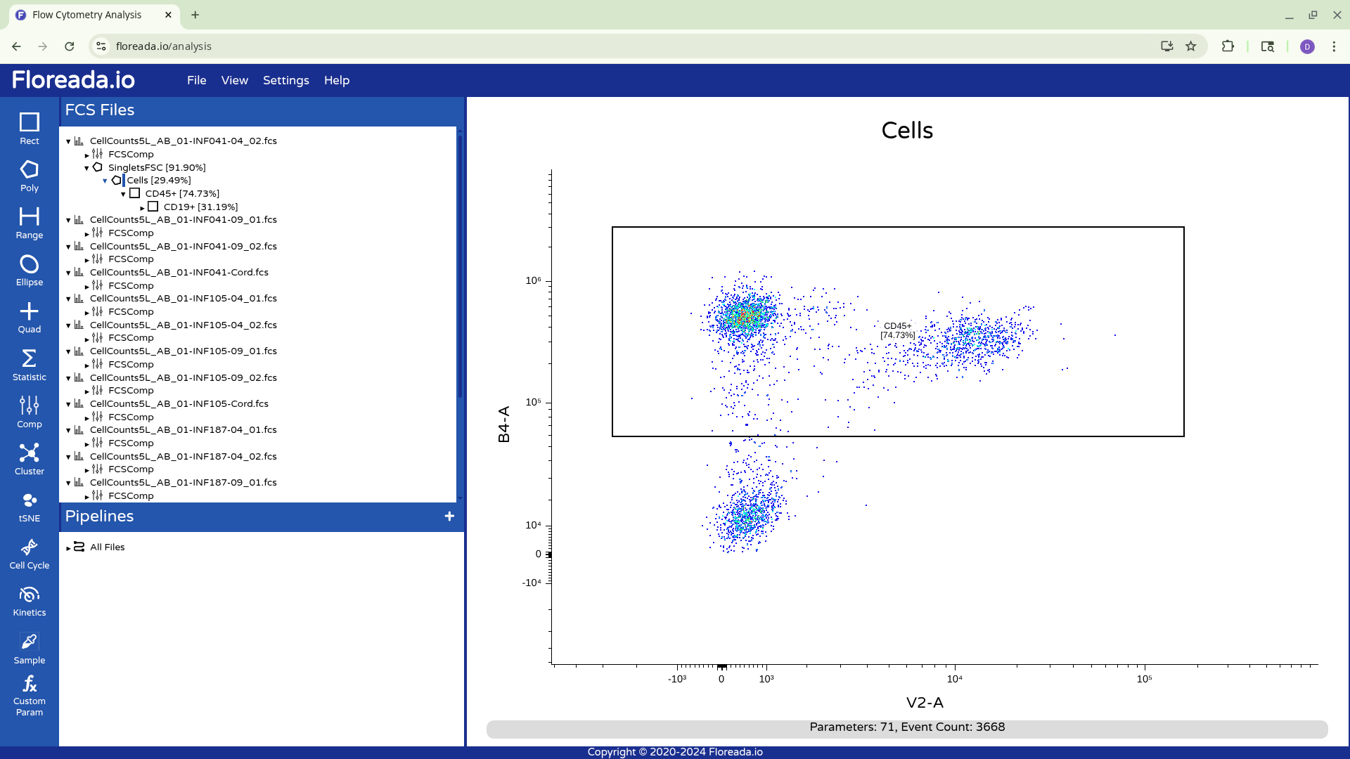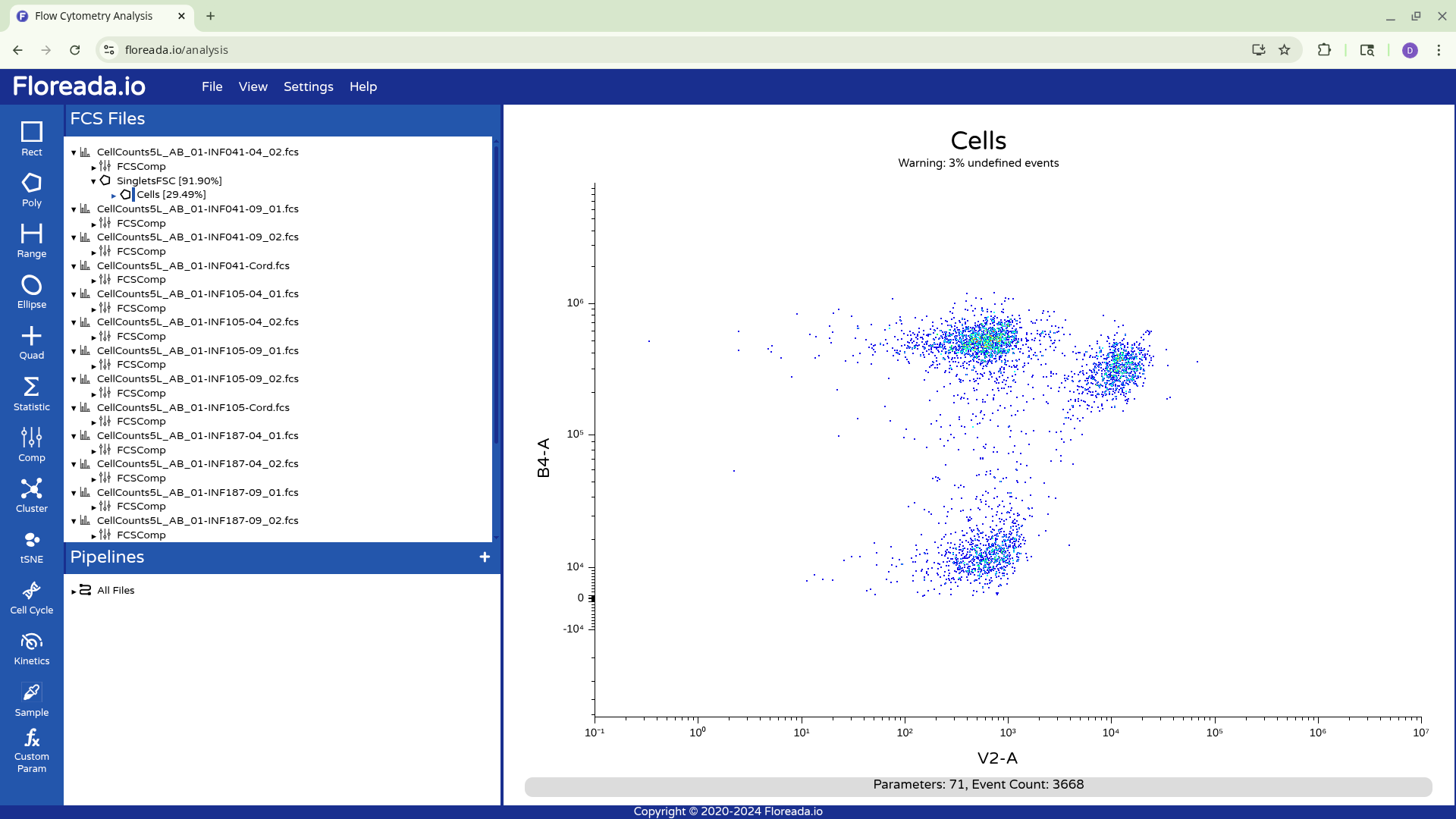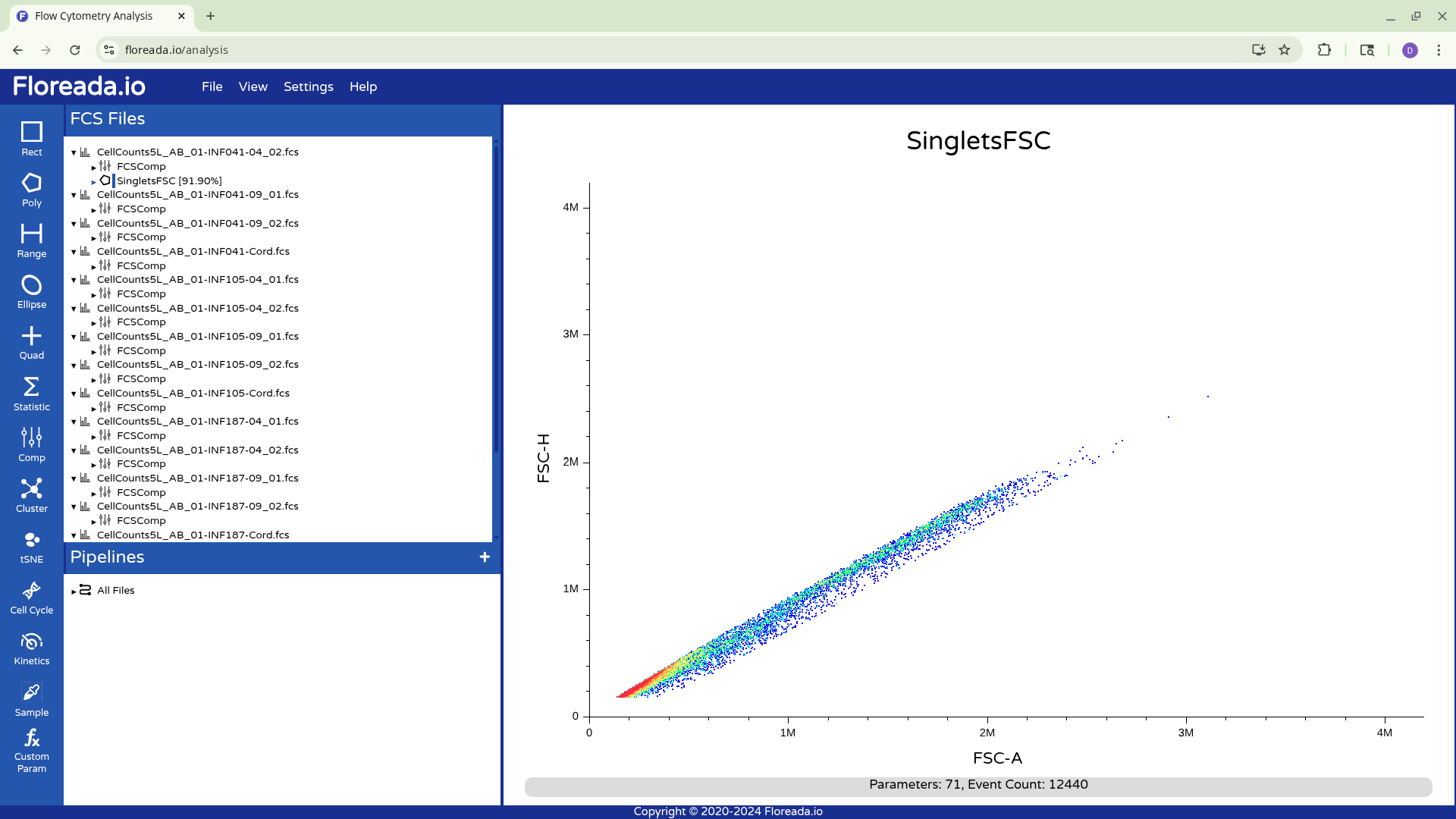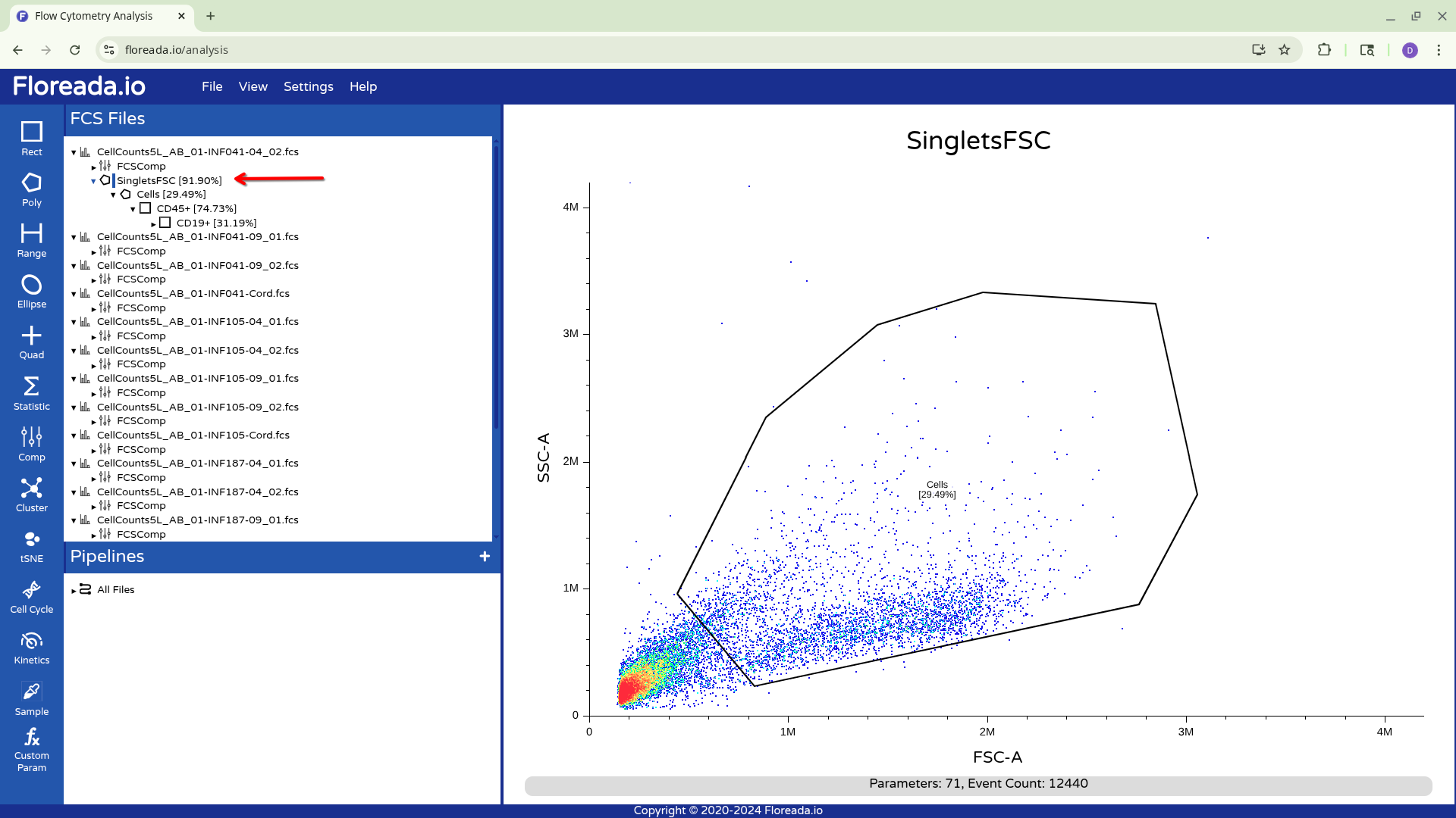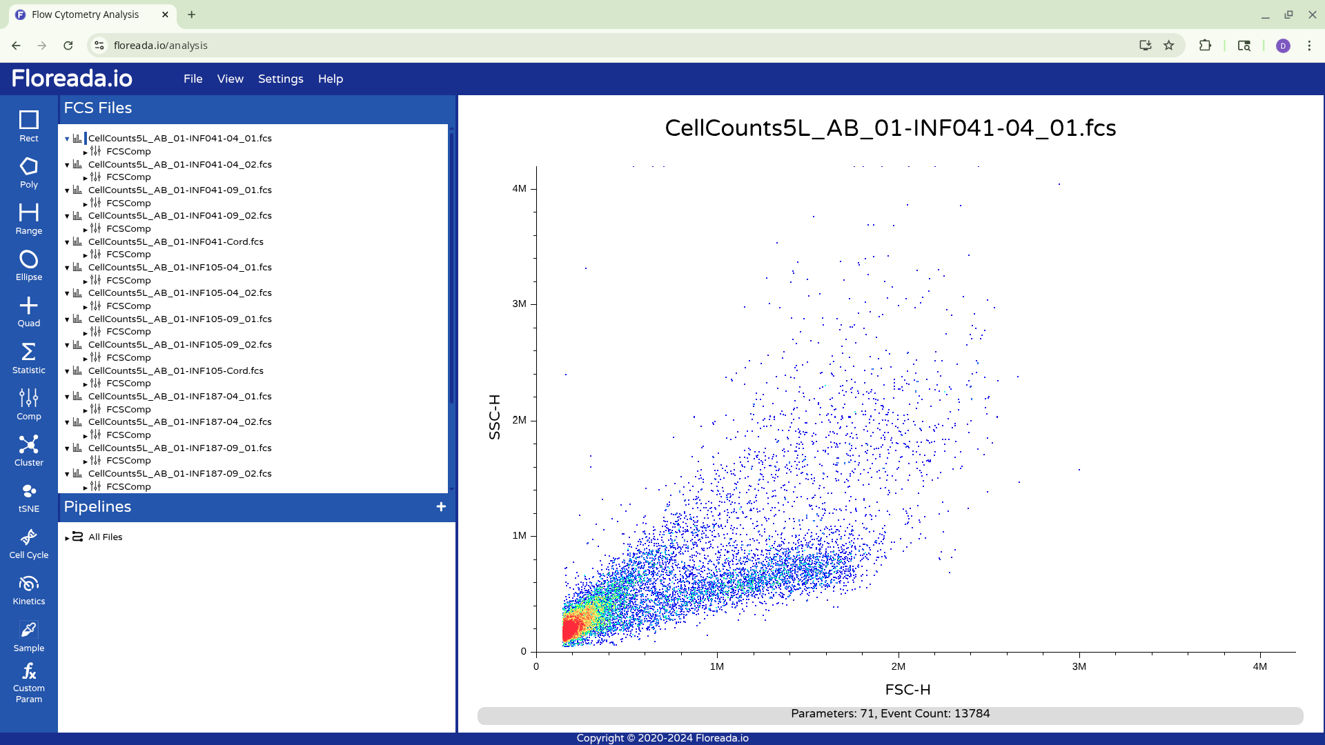 The .fcs files will now load in, and you should see a view similar to the one below. On the left side-bar, you have your gating options (Rectangle, Polygon, Range, Elipse, Quad, etc). Next to these on the right you have the FCS files that are loaded into the workspace. Then on the right, you have the visual display for your selected specimen.
