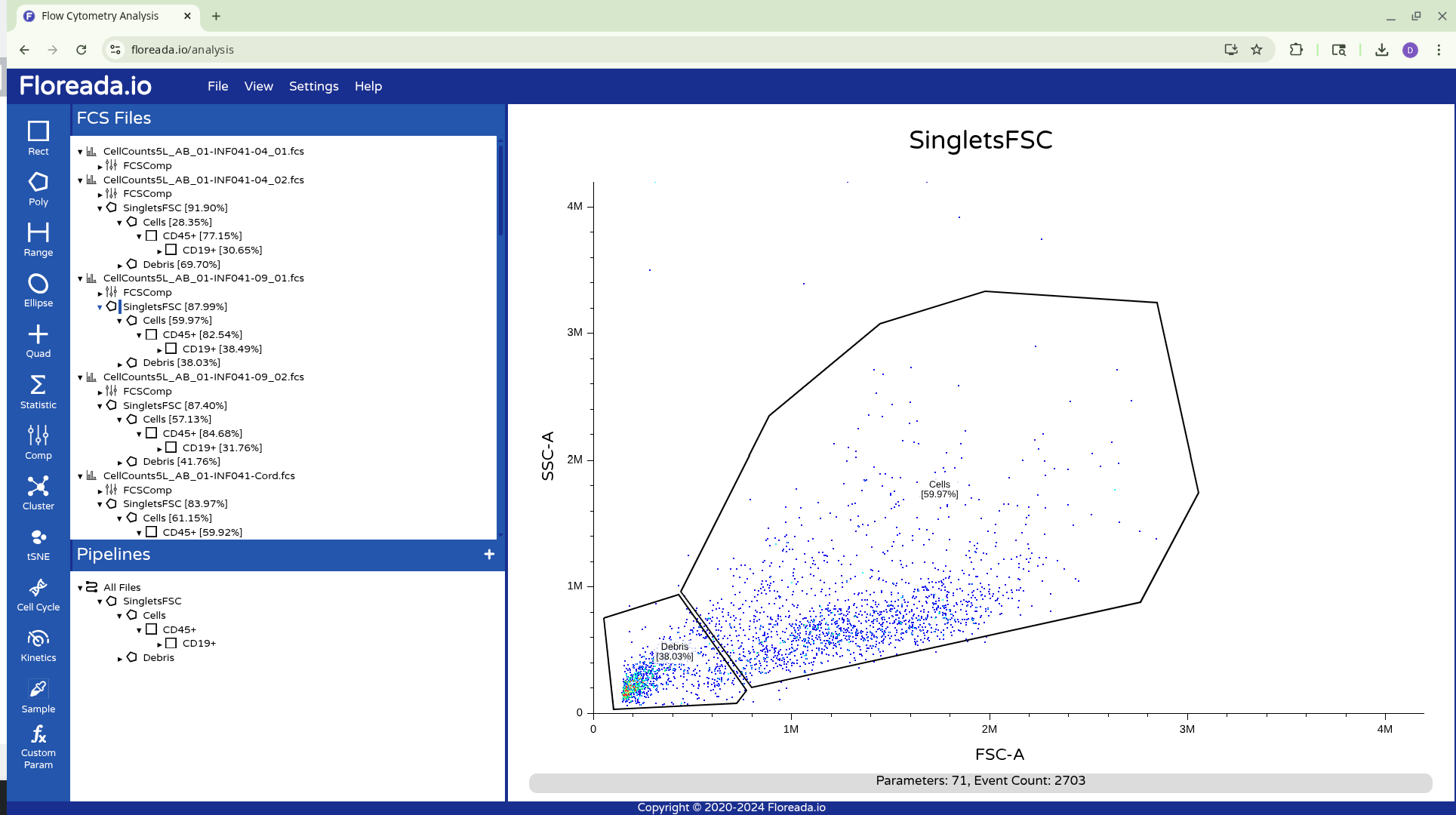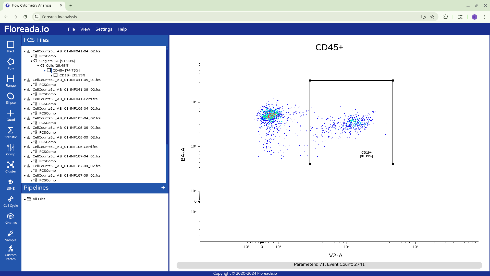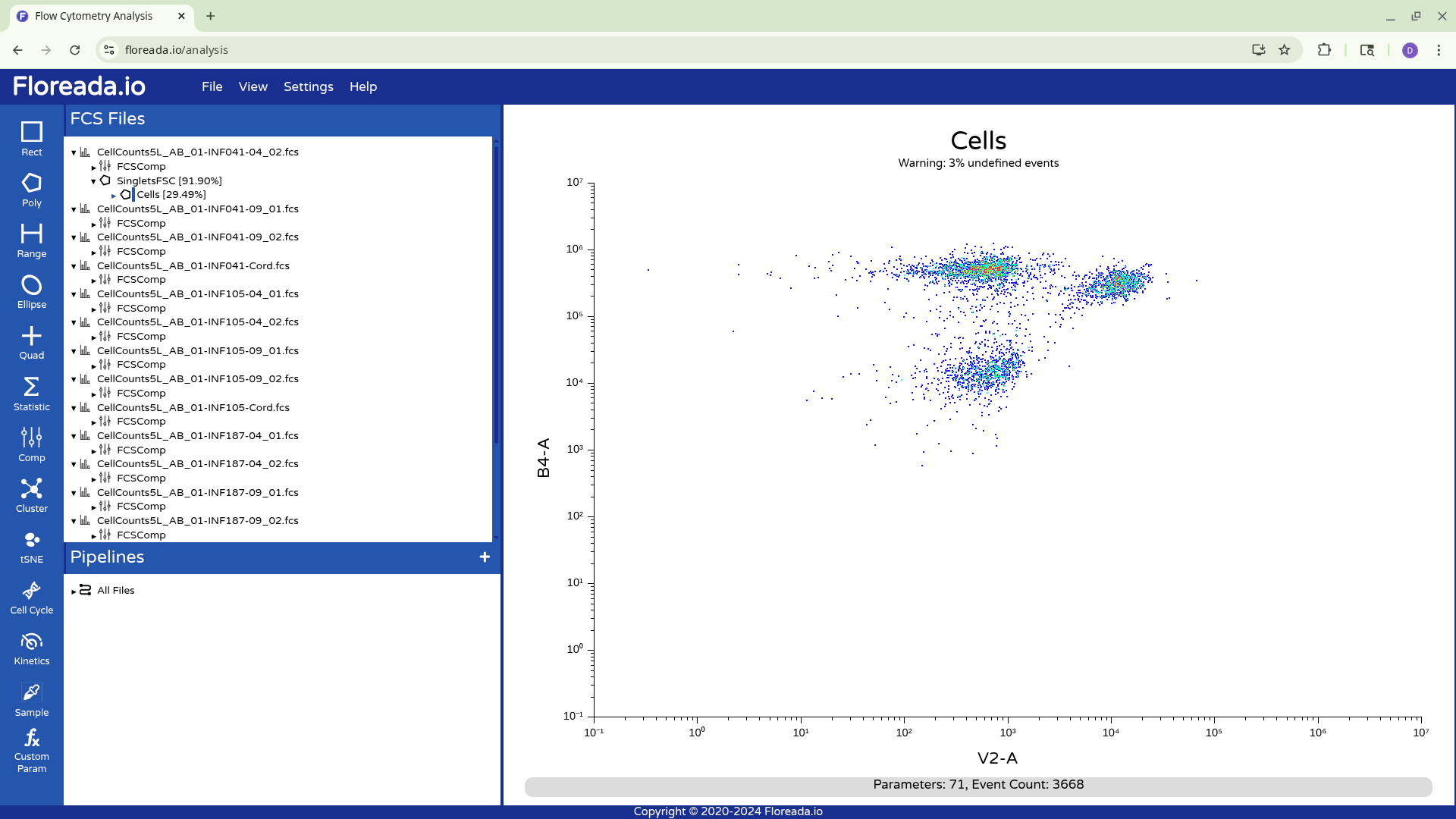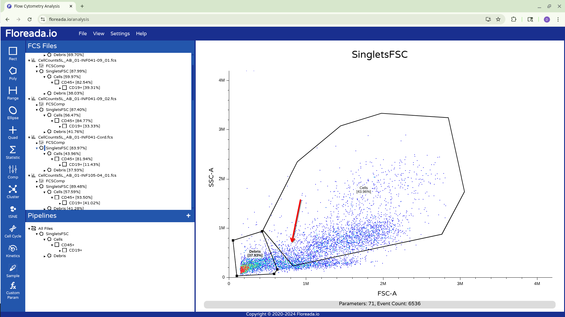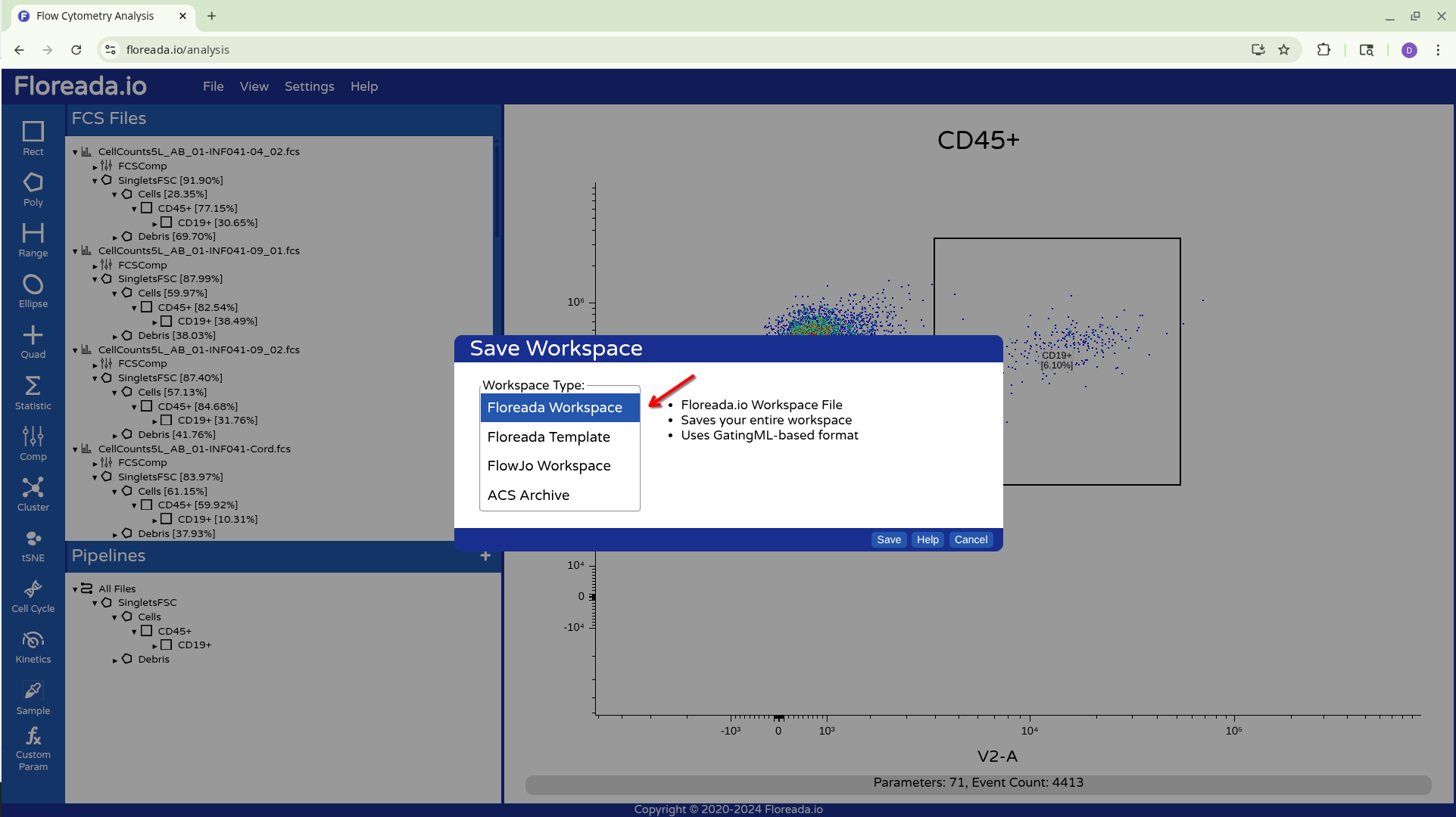The .fcs files will now load in, and you should see a view similar to the one below. On the left side-bar, you have your gating options (Rectangle, Polygon, Range, Elipse, Quad, etc). Next to these on the right you have the FCS files that are loaded into the workspace. Then on the right, you have the visual display for your selected specimen.