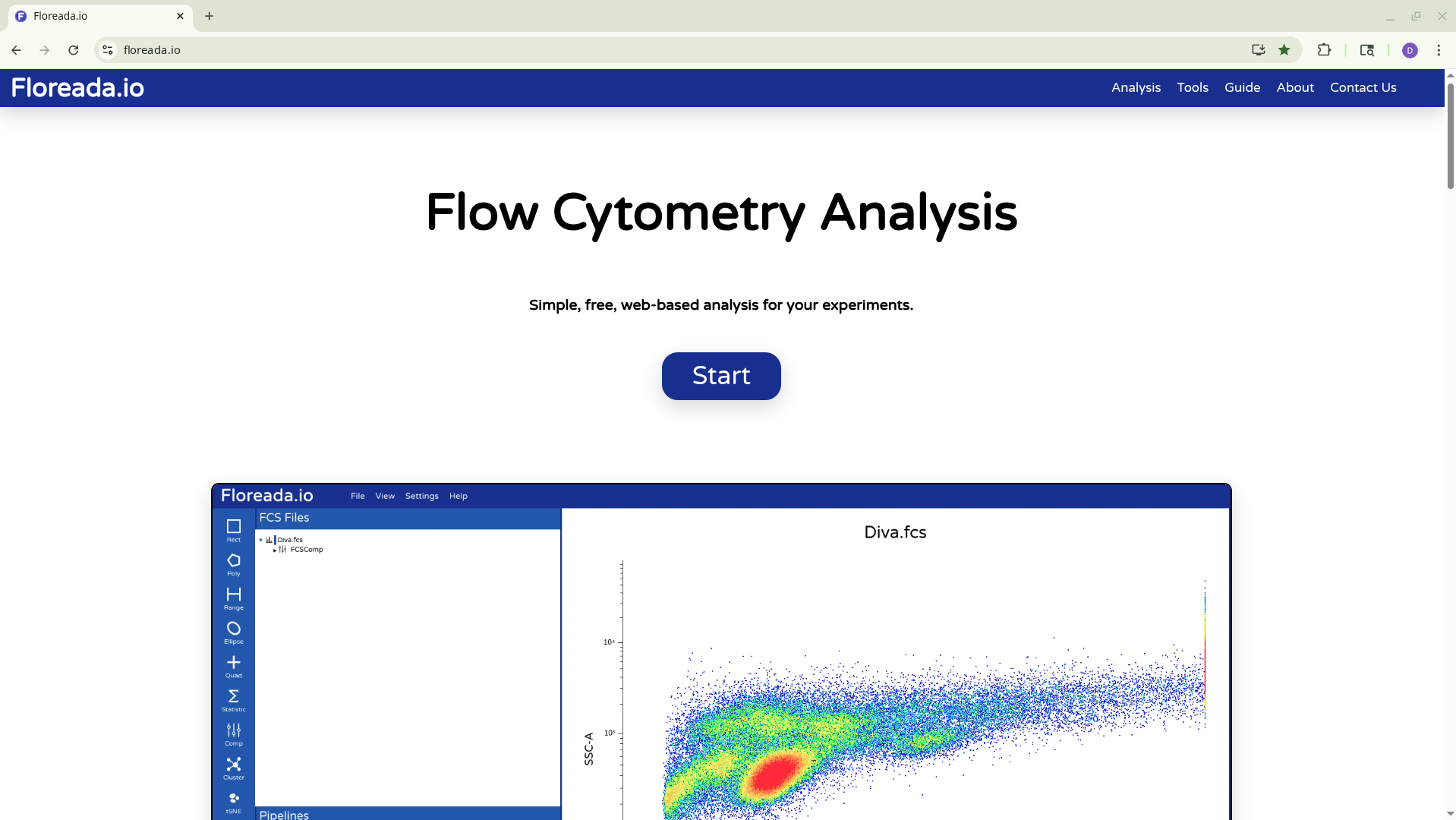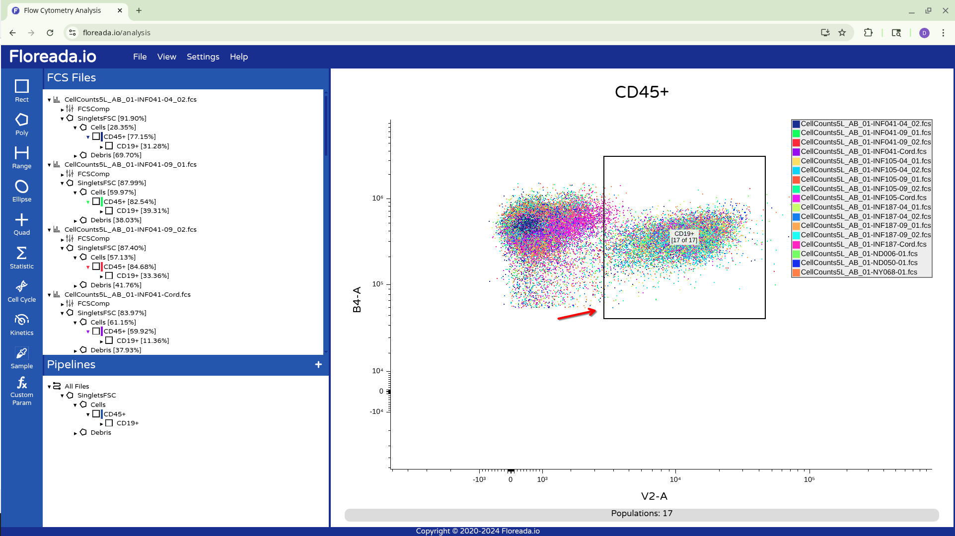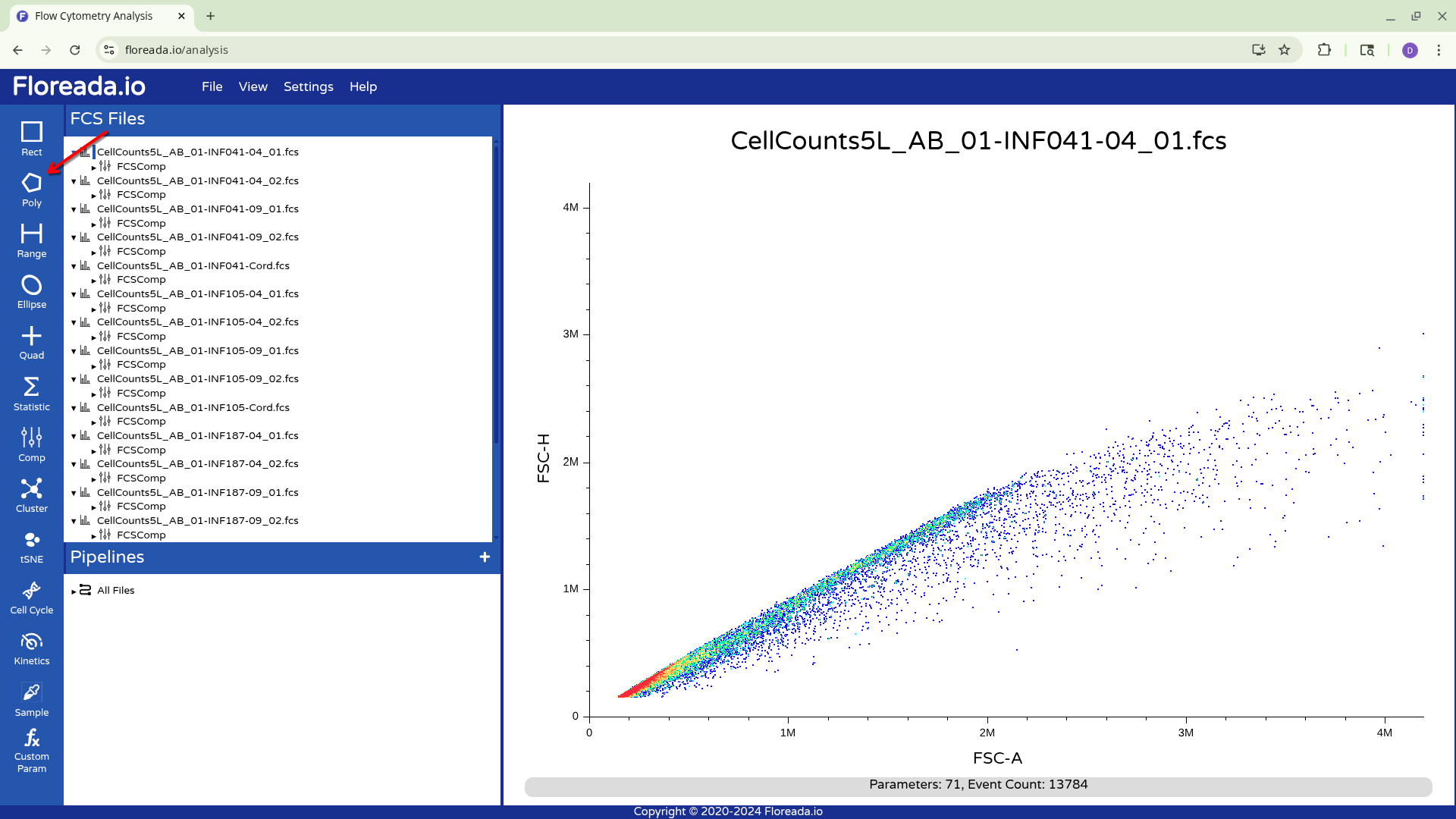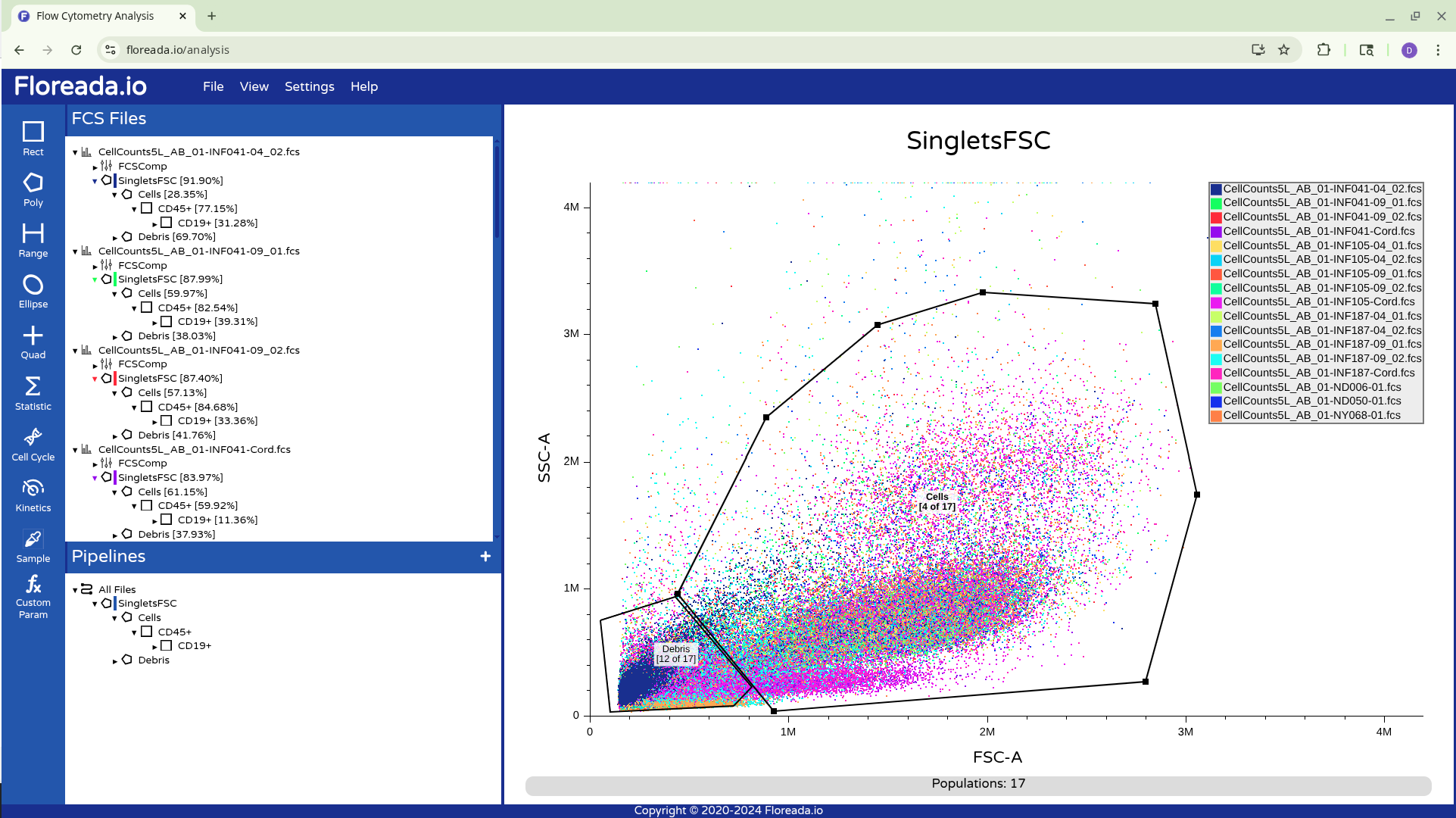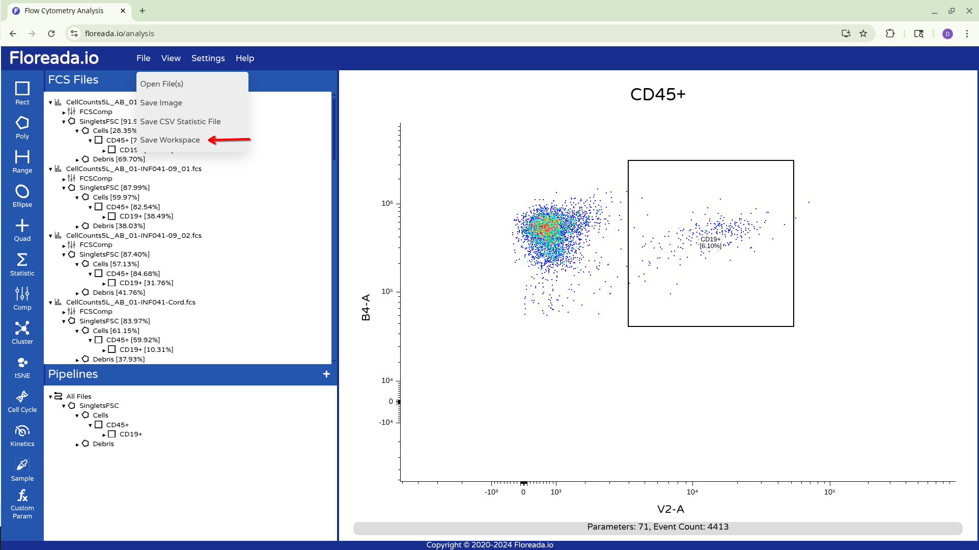 The .fcs files will now load in, and you should see a view similar to the one below. On the left side-bar, you have your gating options (Rectangle, Polygon, Range, Elipse, Quad, etc). Next to these on the right you have the FCS files that are loaded into the workspace. Then on the right, you have the visual display for your selected specimen.