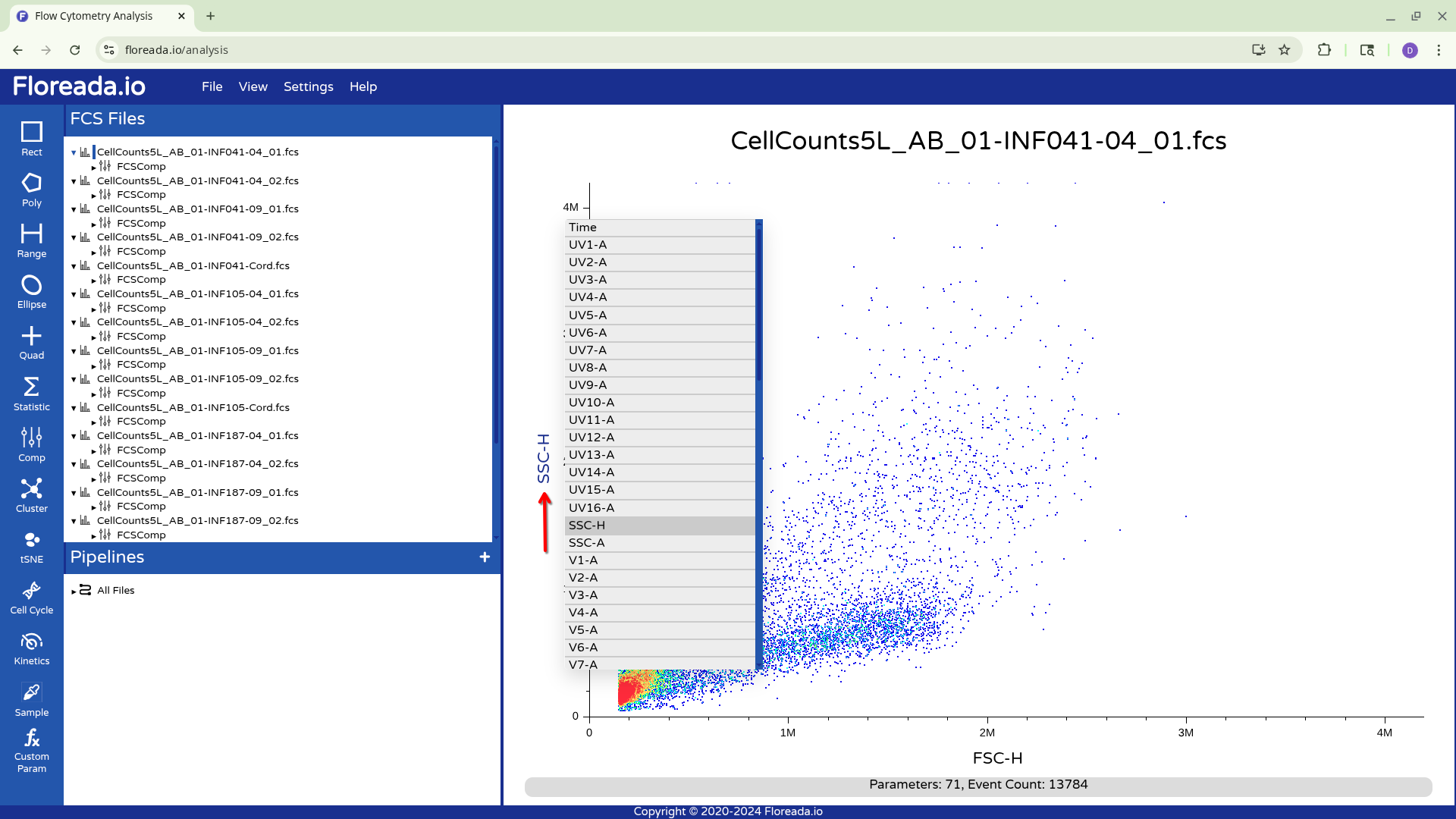 If you left click on the axis name (SSC-H or FSC-H in this case), you will be able to select other markers by which to gate your specimen. For the provided example, we were using a raw spectral flow cytometry .fcs file, so the names of the detectors are present.