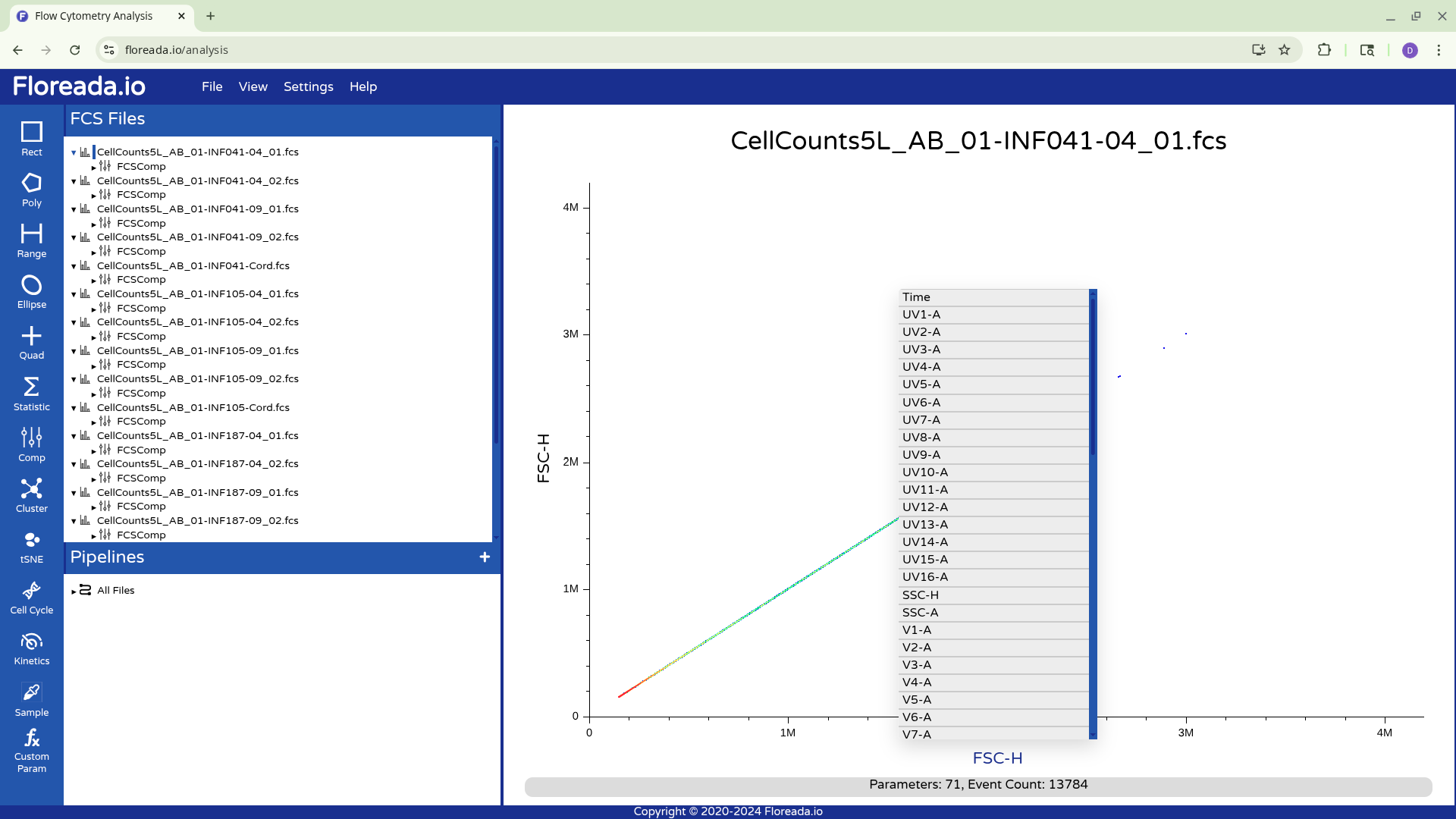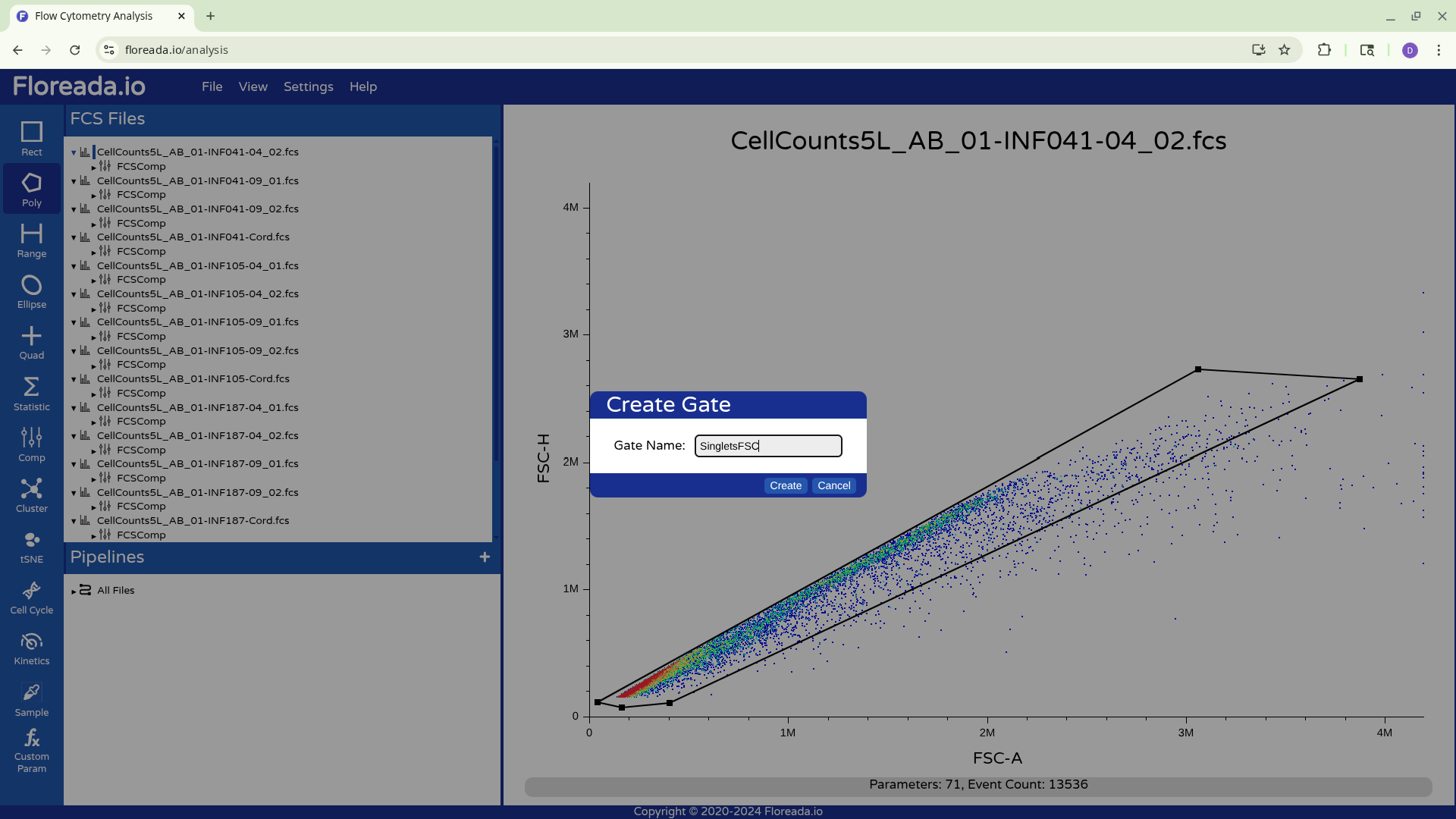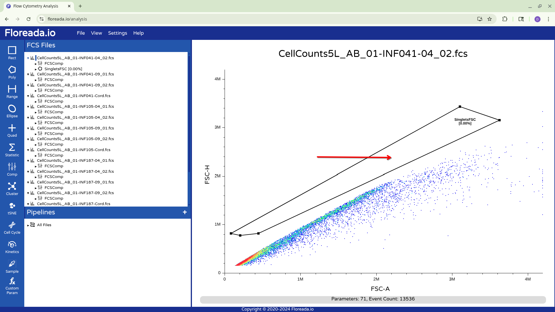 For now, I plan to start off by gating for singlets. I switch the y-axis to FSC-H, and then proceed to switch the x-axis to FSC-A.