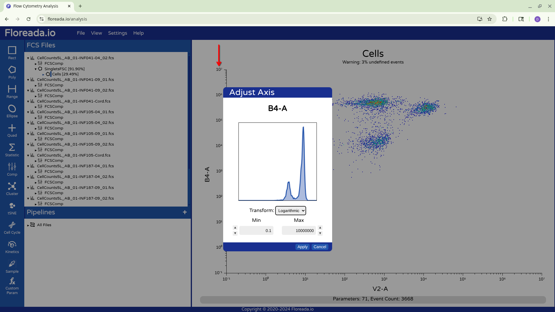This y-axis values are subsequently visualized with the logicle transformation applied, increasing our resolution between the positive and negative population.