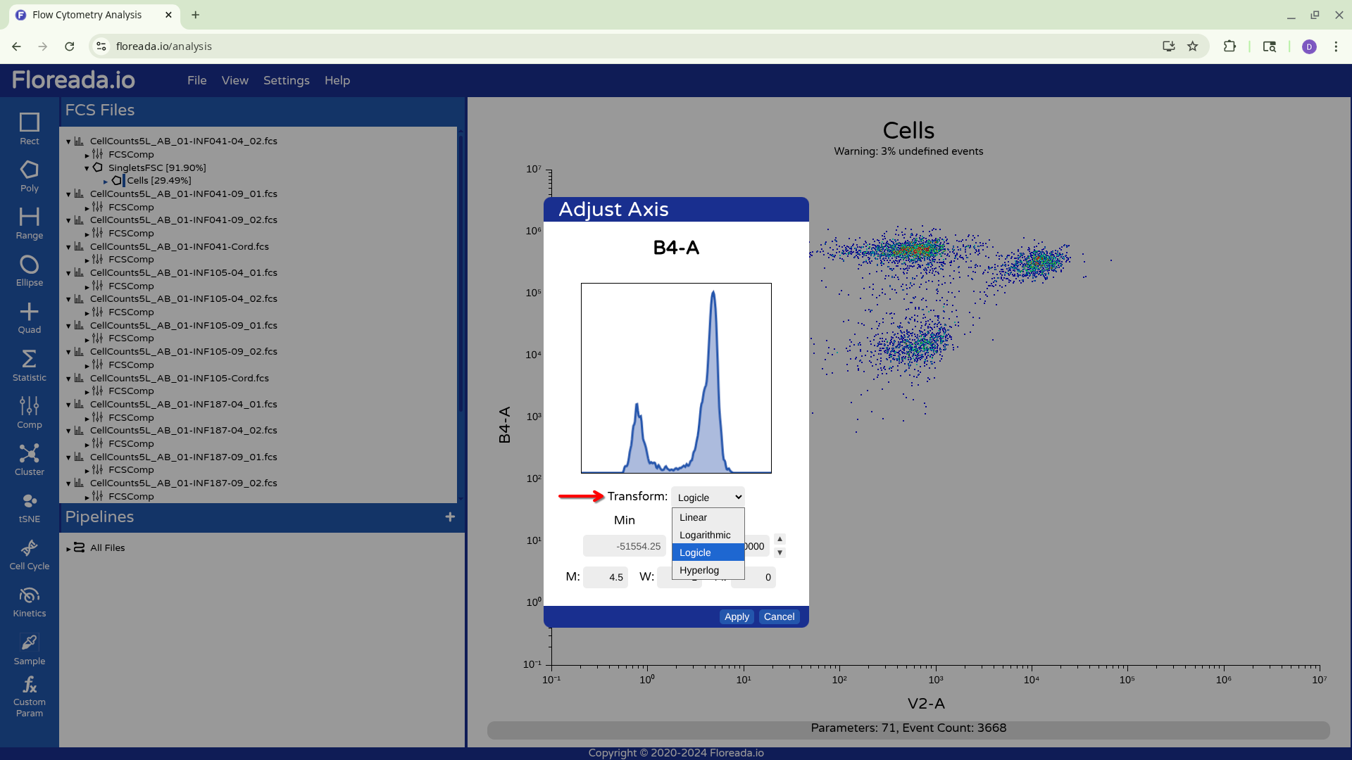 From there, when we click on the drop-down, we see the various transformation options. We will select Logicle, given we are working with spectral flow cytometry files.