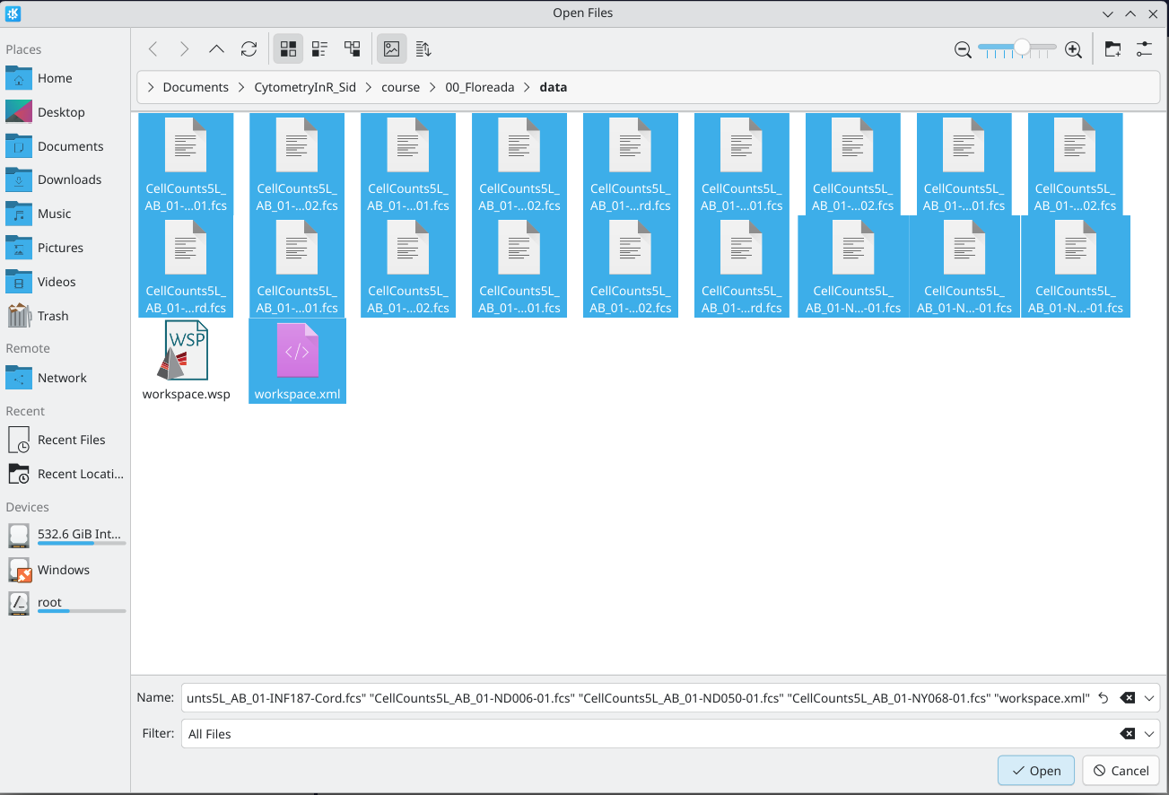 From there, select both the Floreada Workspace file as well as the .fcs files