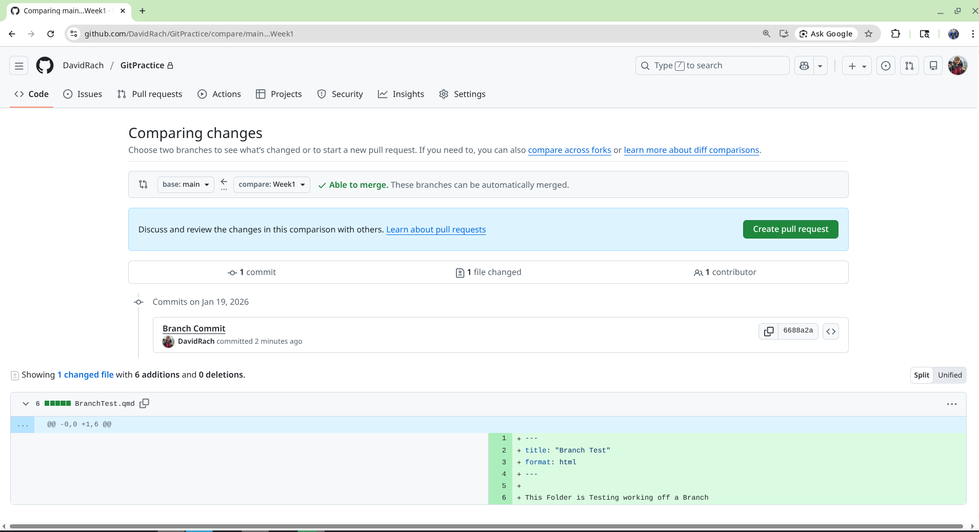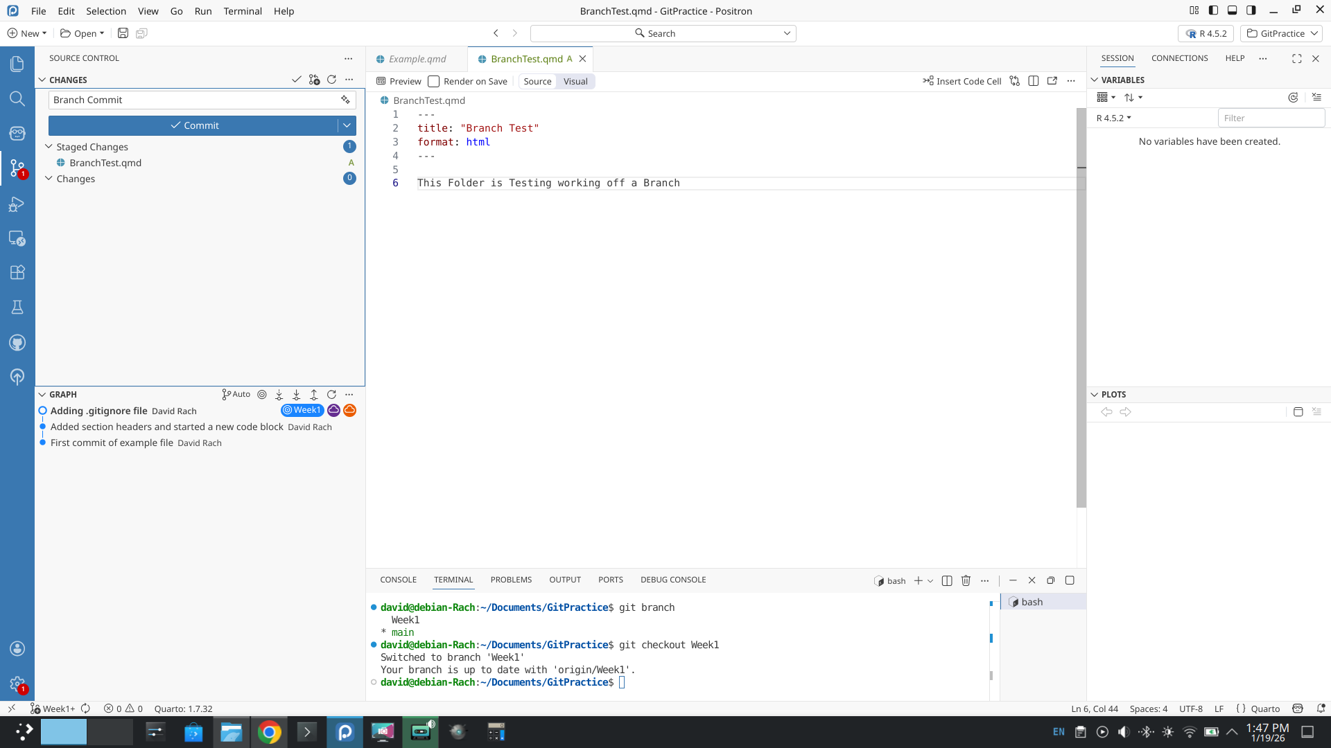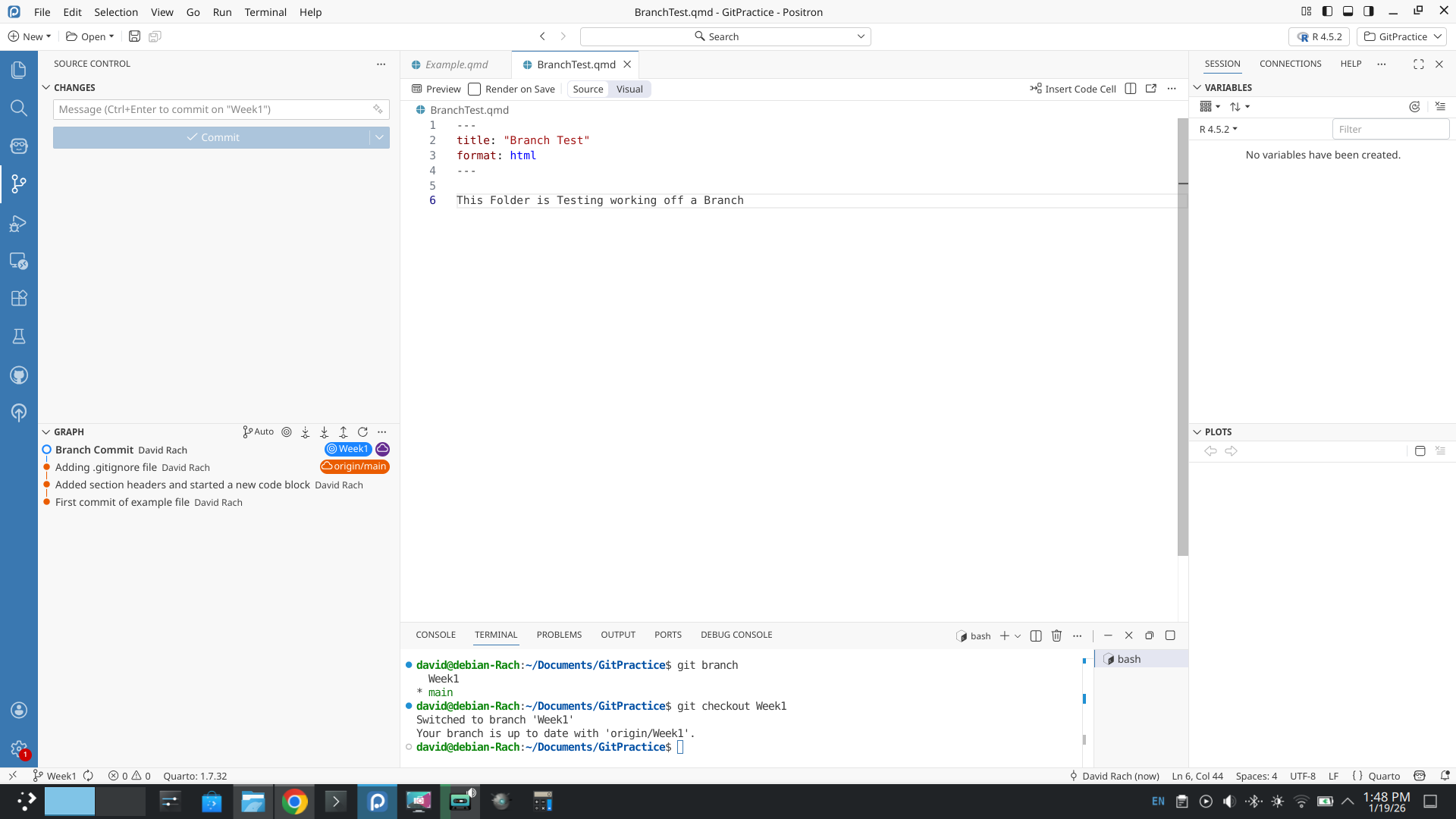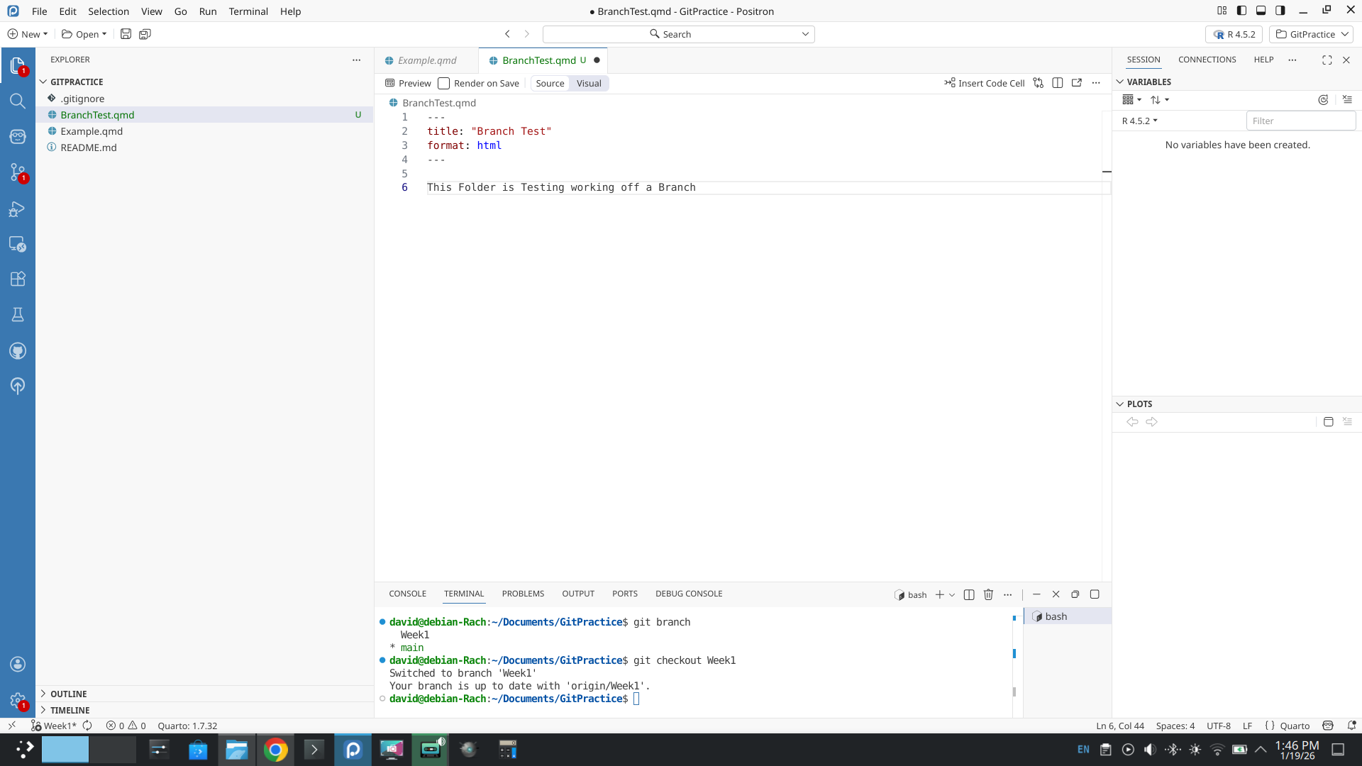 Having switched (ie. checkout) to the Week 1 branch, let’s create the file BranchTest.qmd, which will exist within this branch, but not yet in the main branch.