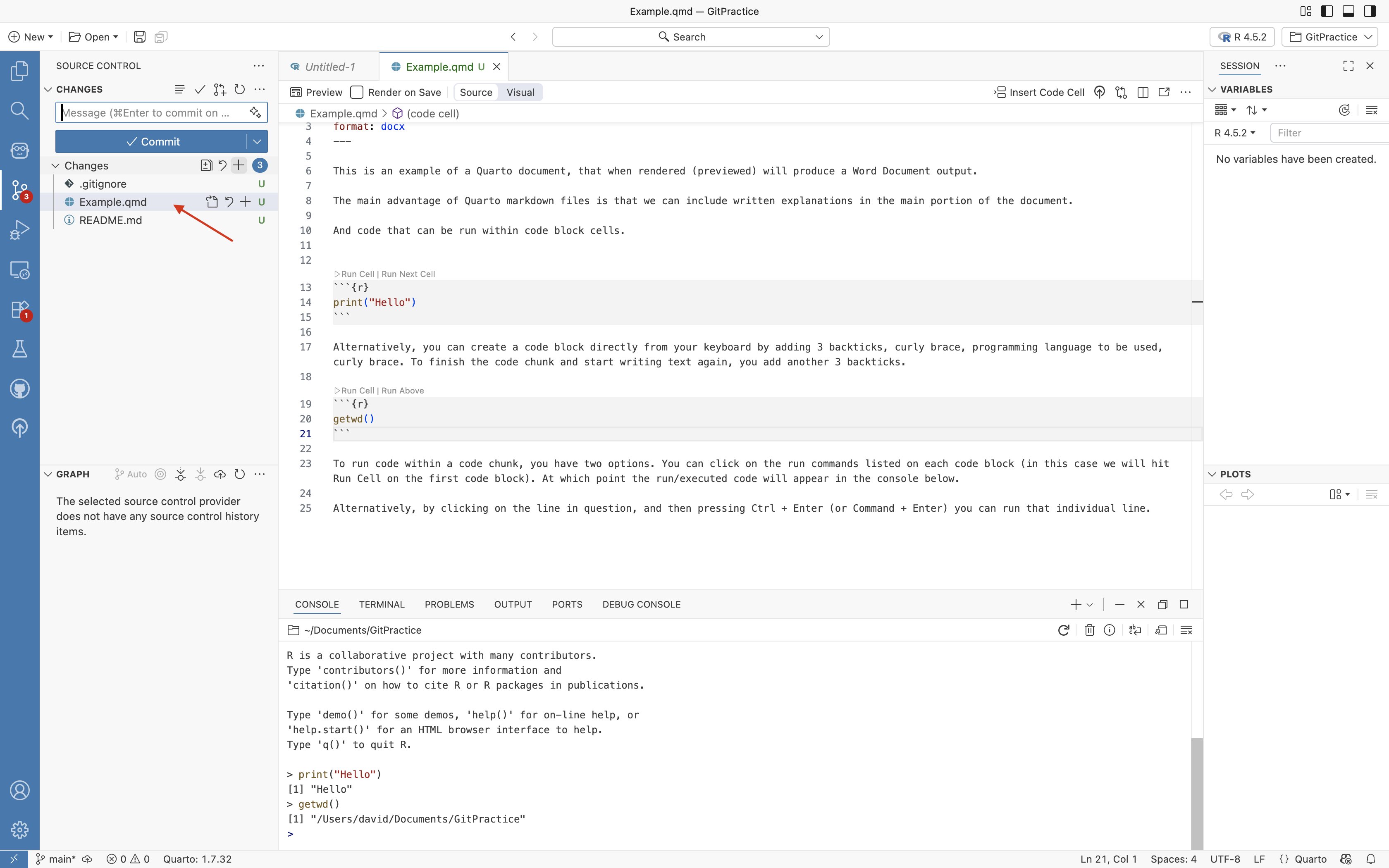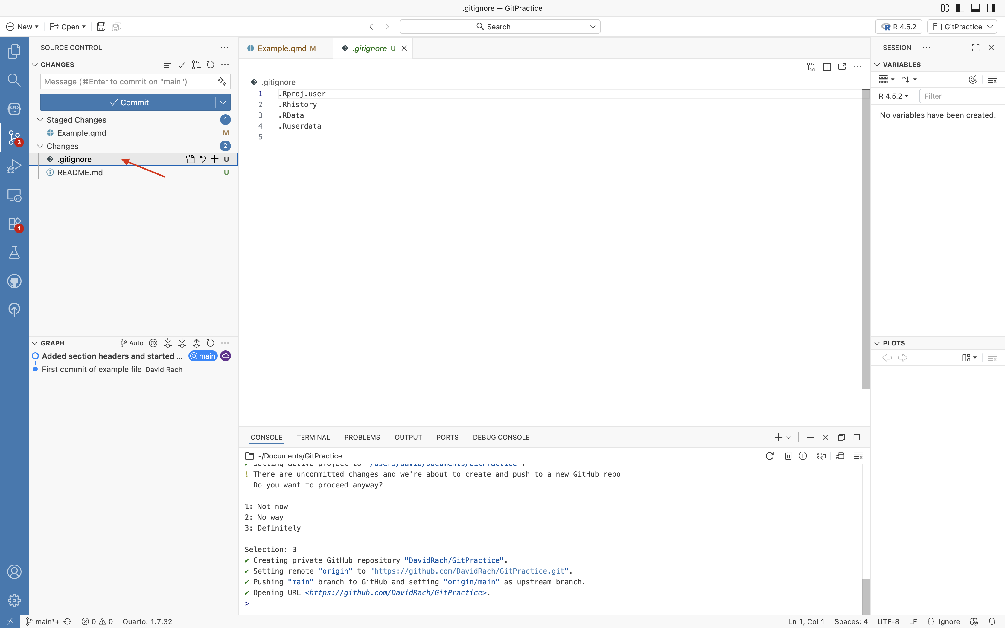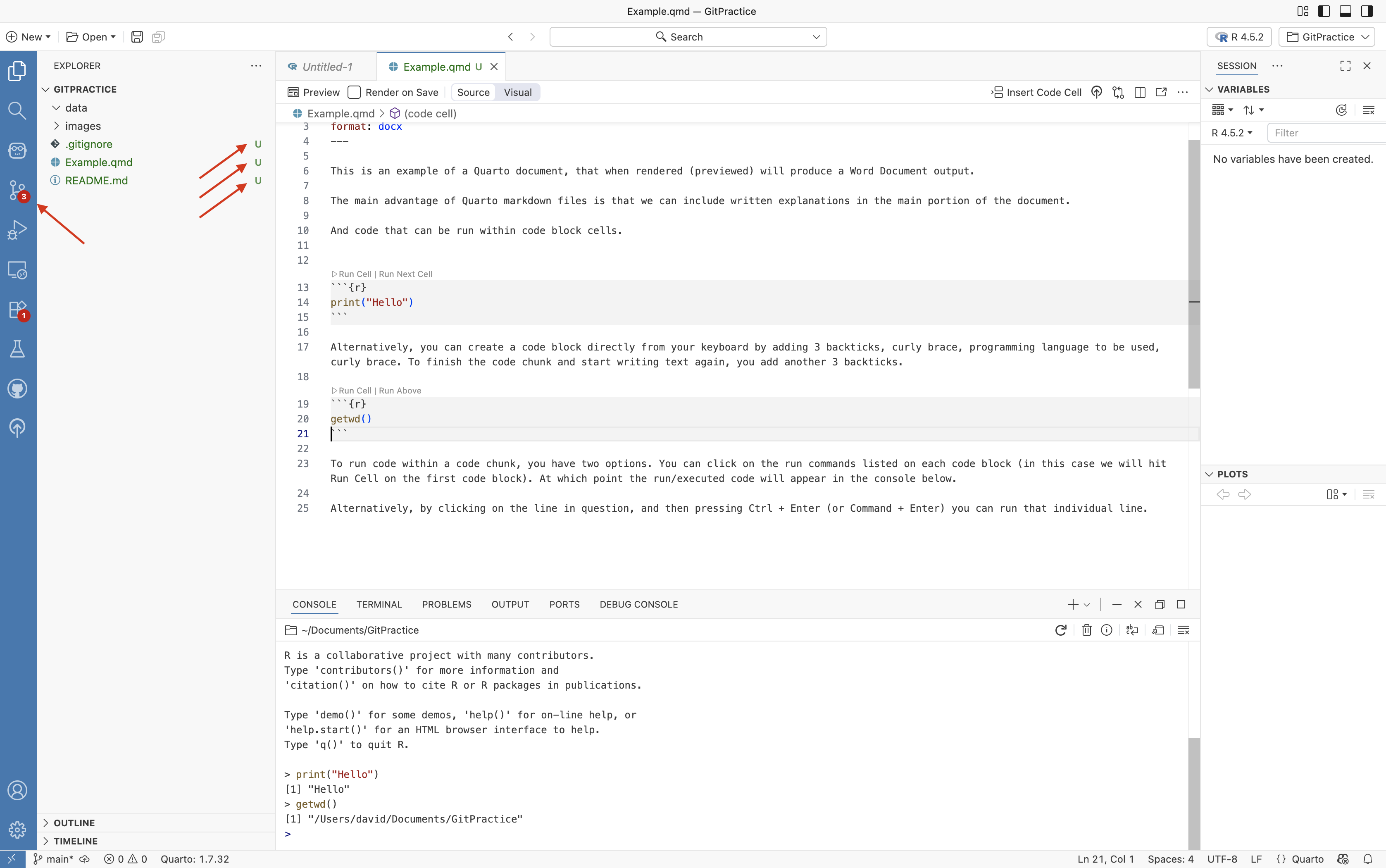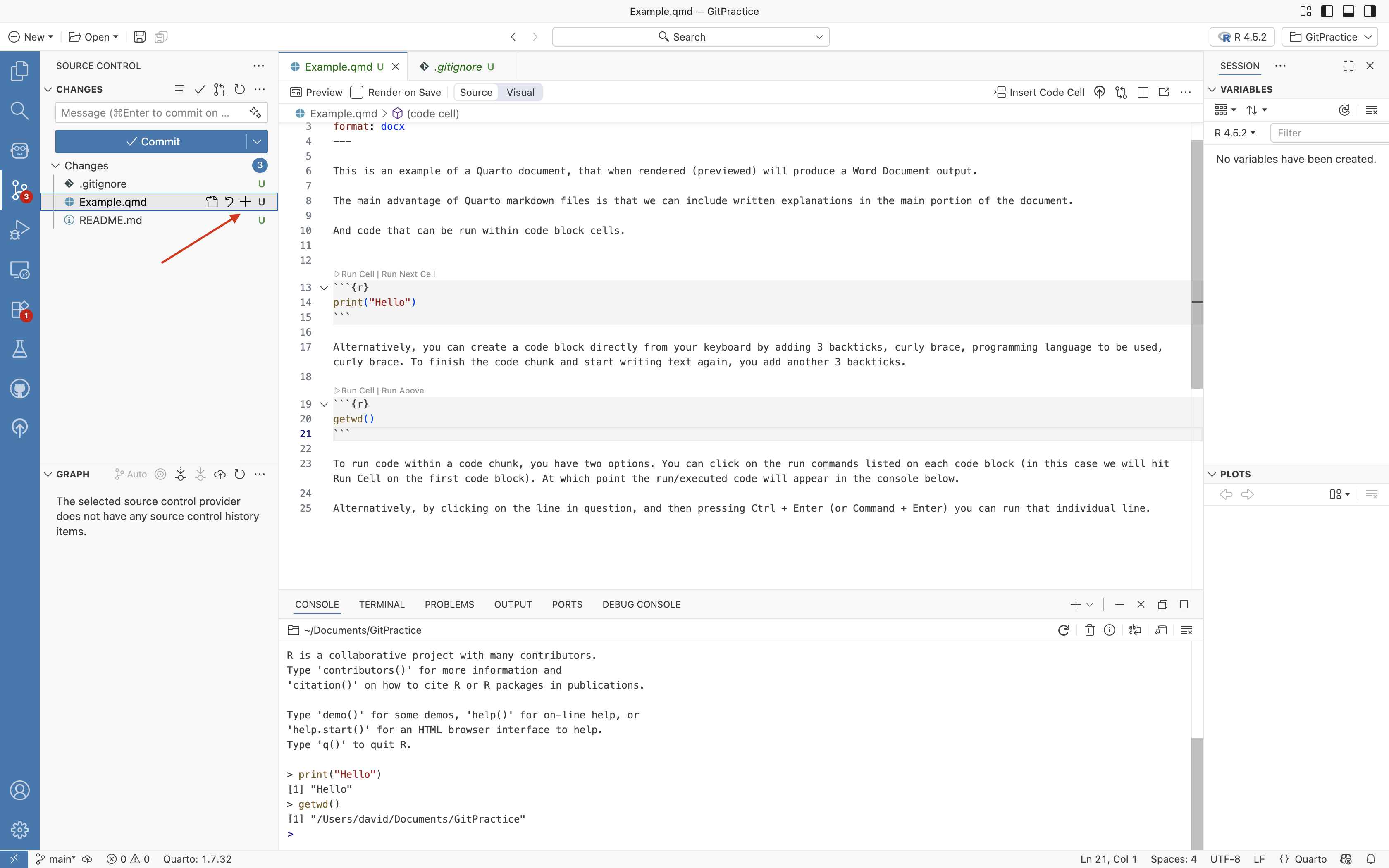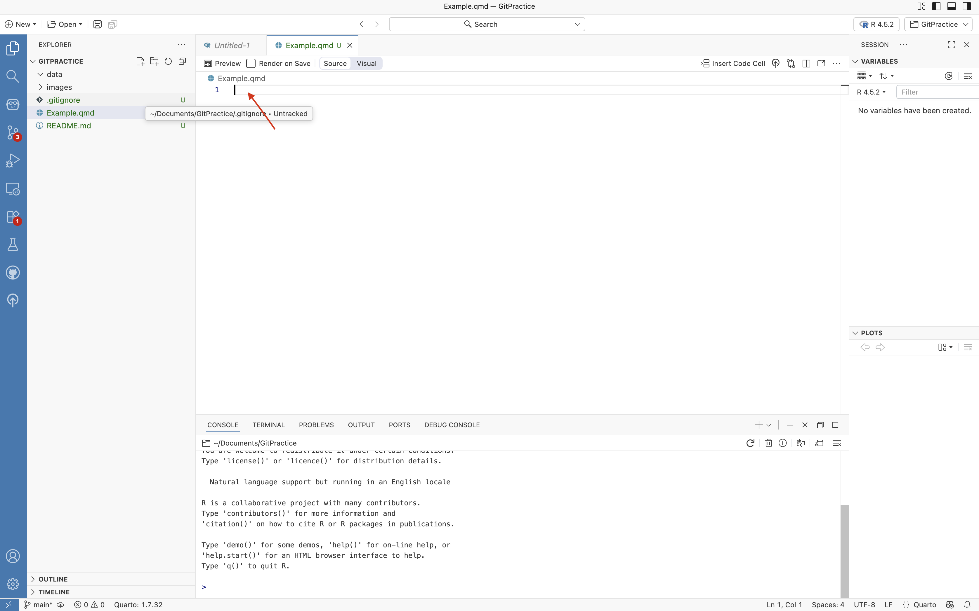 If we turn our attention to the left primary sidebar, we can see that within our GitPractie folder there are three files, our Example.qmd, and the default README.md and .gitignore files. These all show up in green text with U’s to the right of the file names.