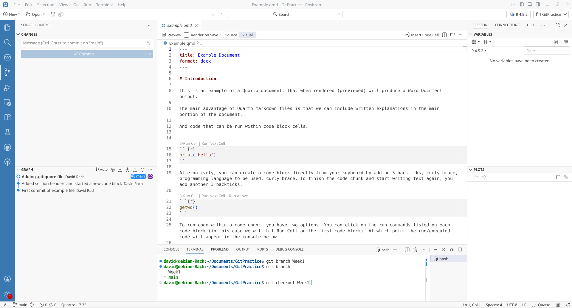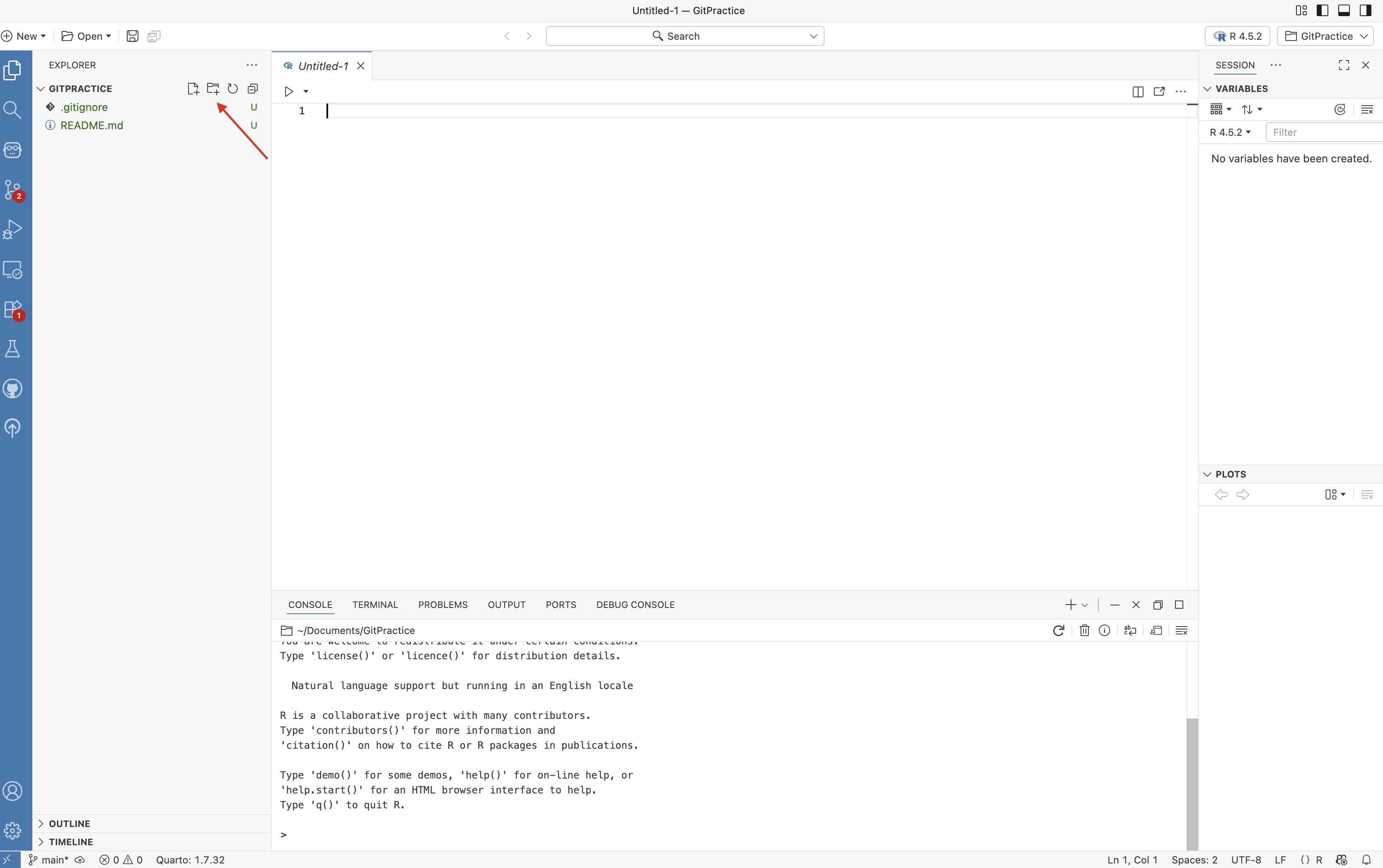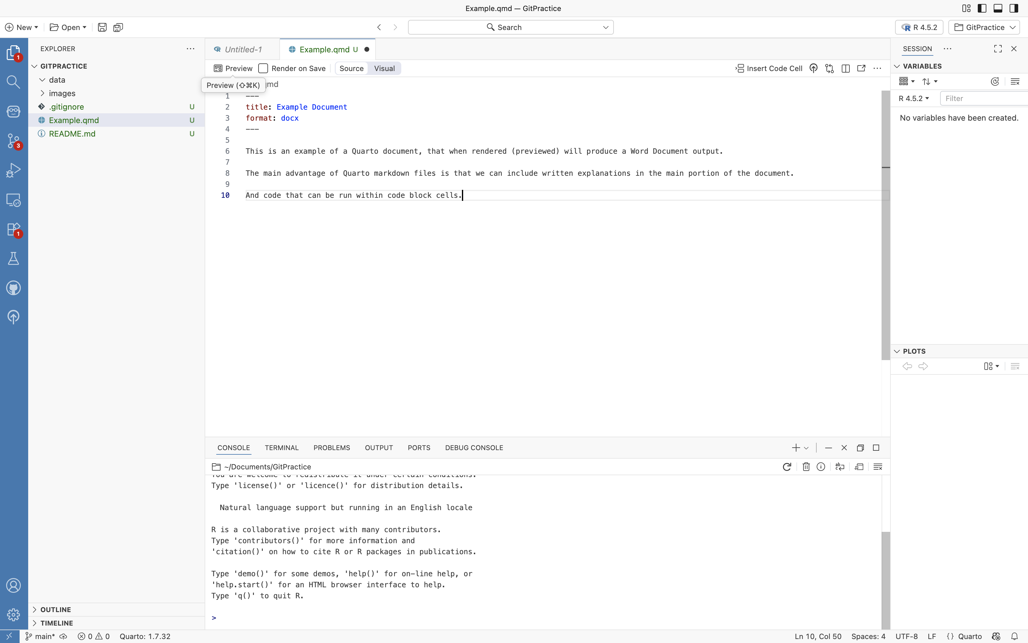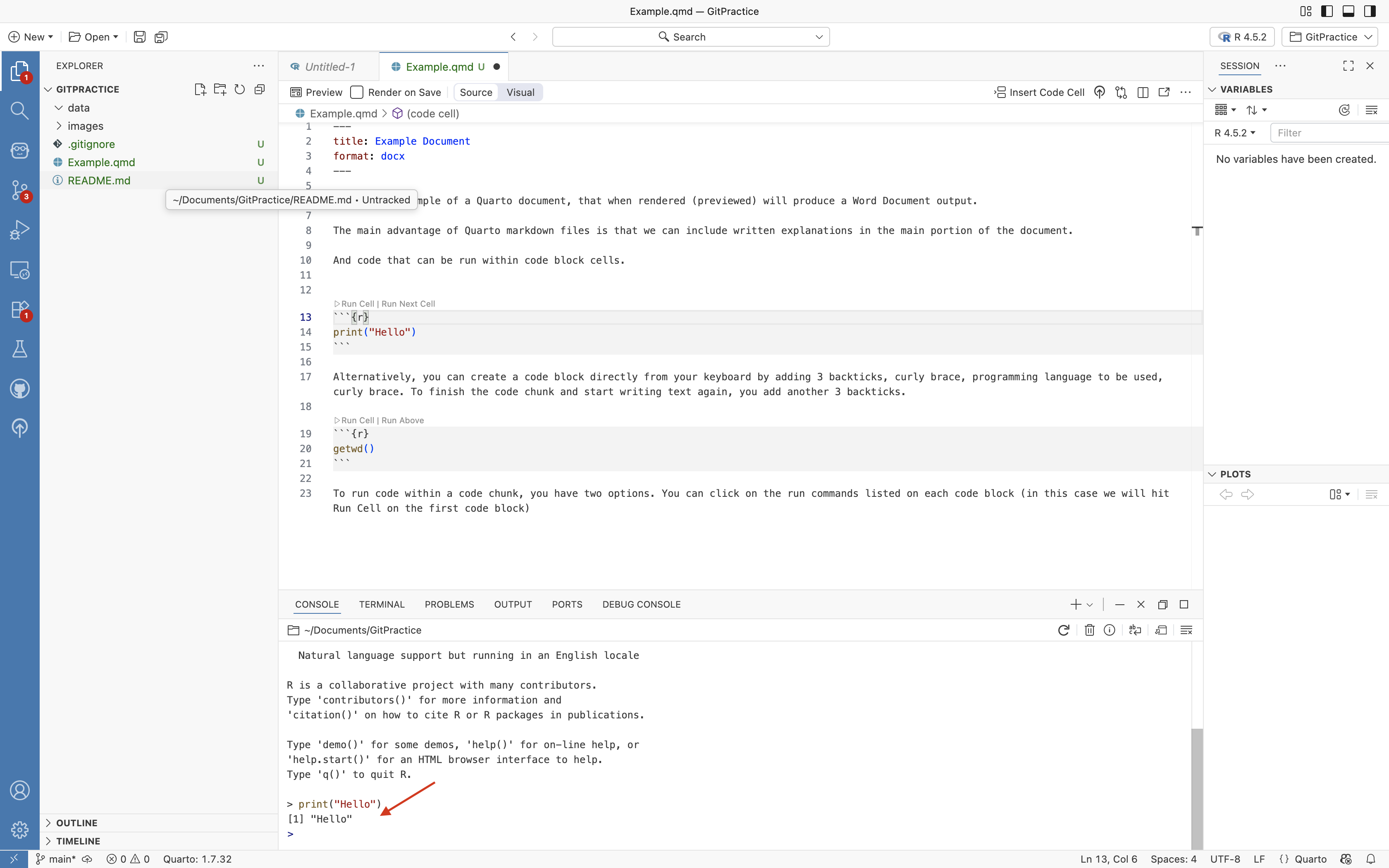 If we turn our attention to the left primary sidebar, we can see that within our GitPractie folder there are three files, our Example.qmd, and the default README.md and .gitignore files. These all show up in green text with U’s to the right of the file names.