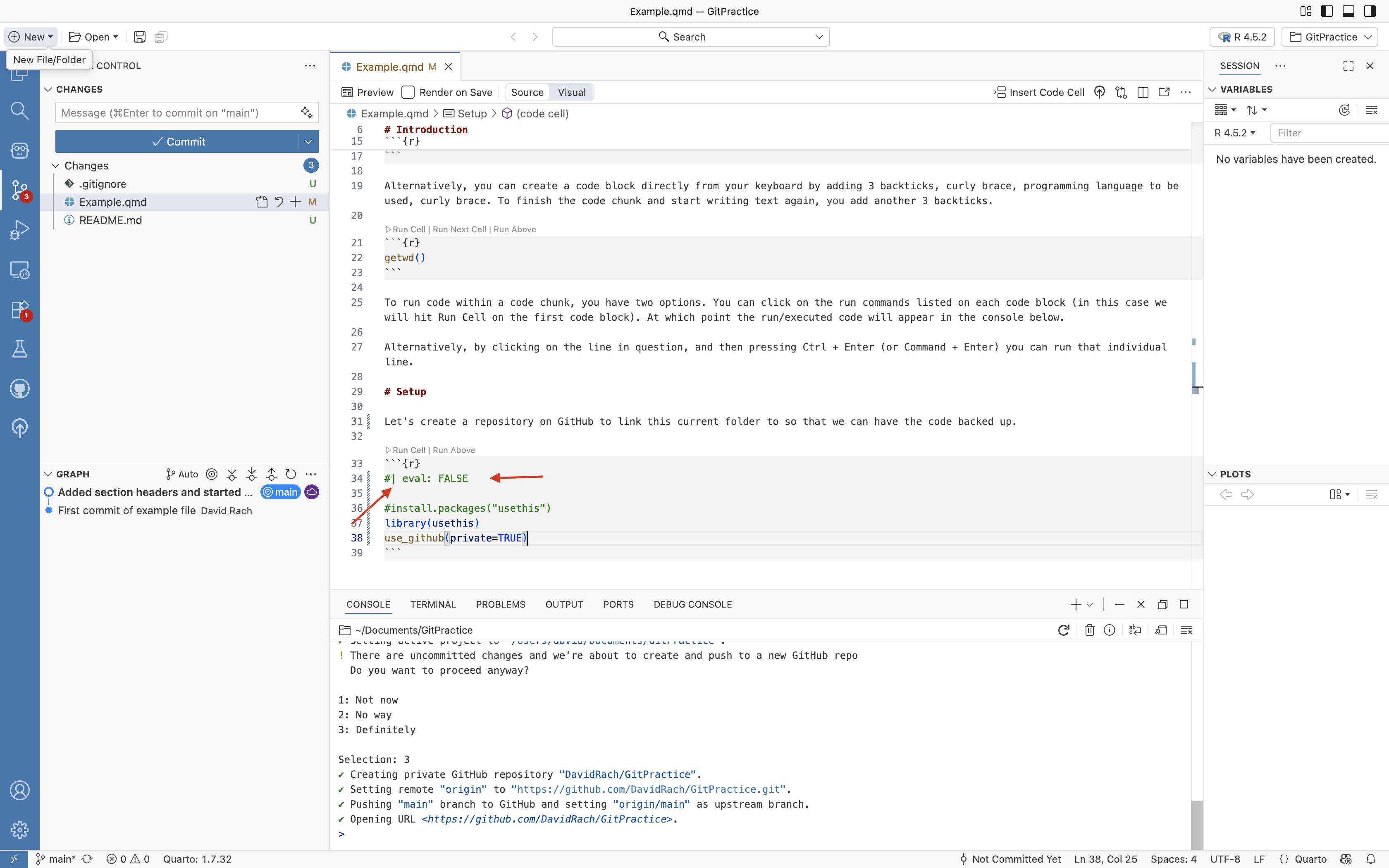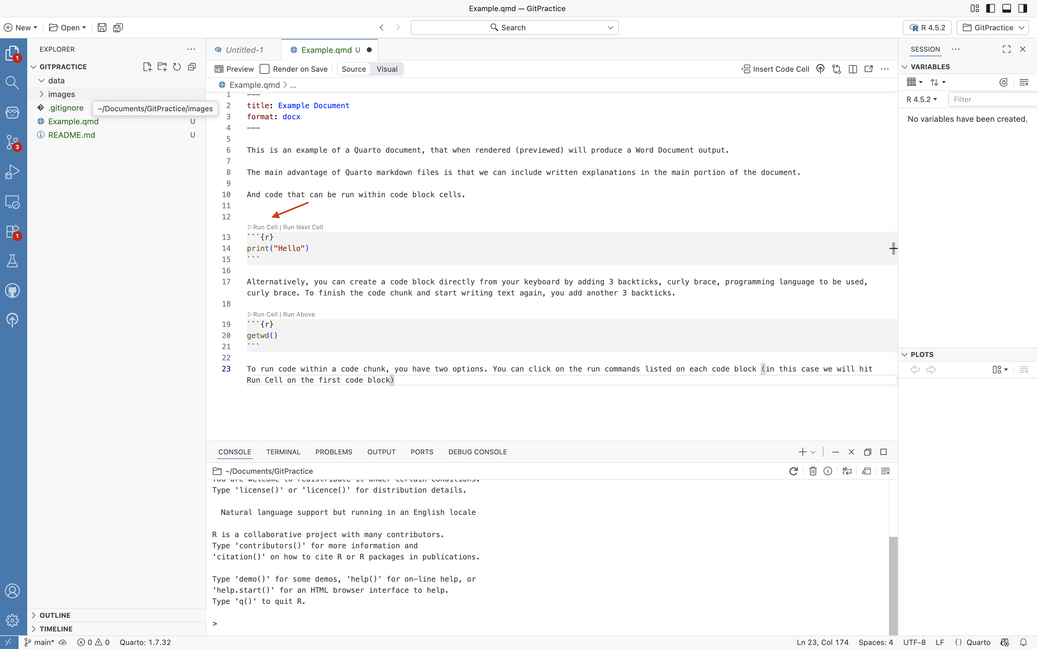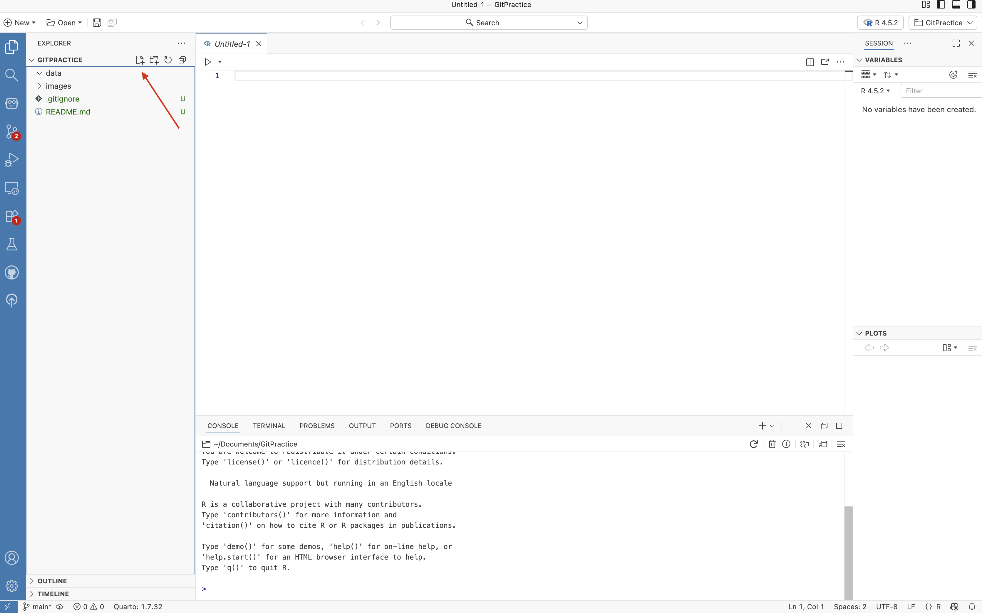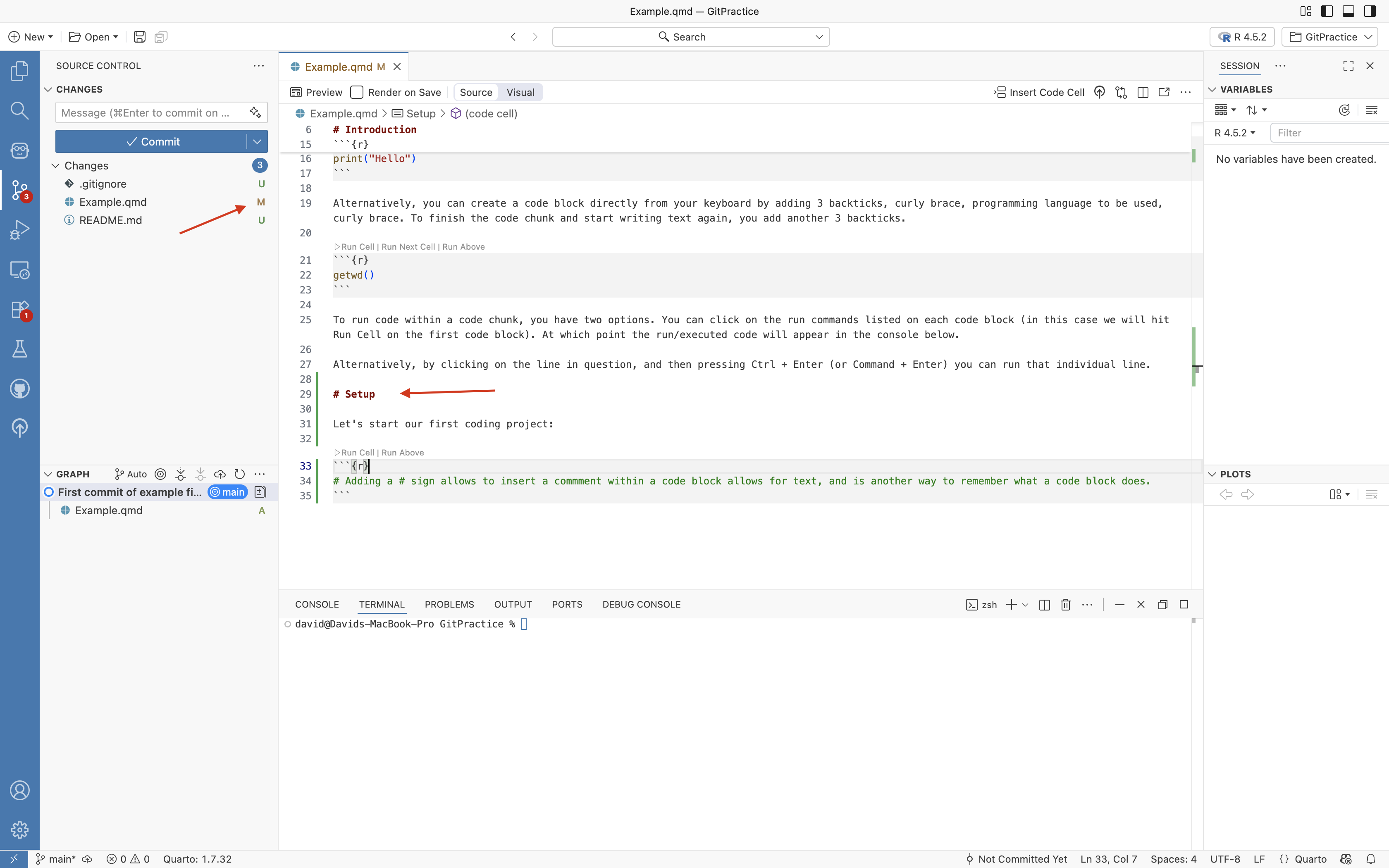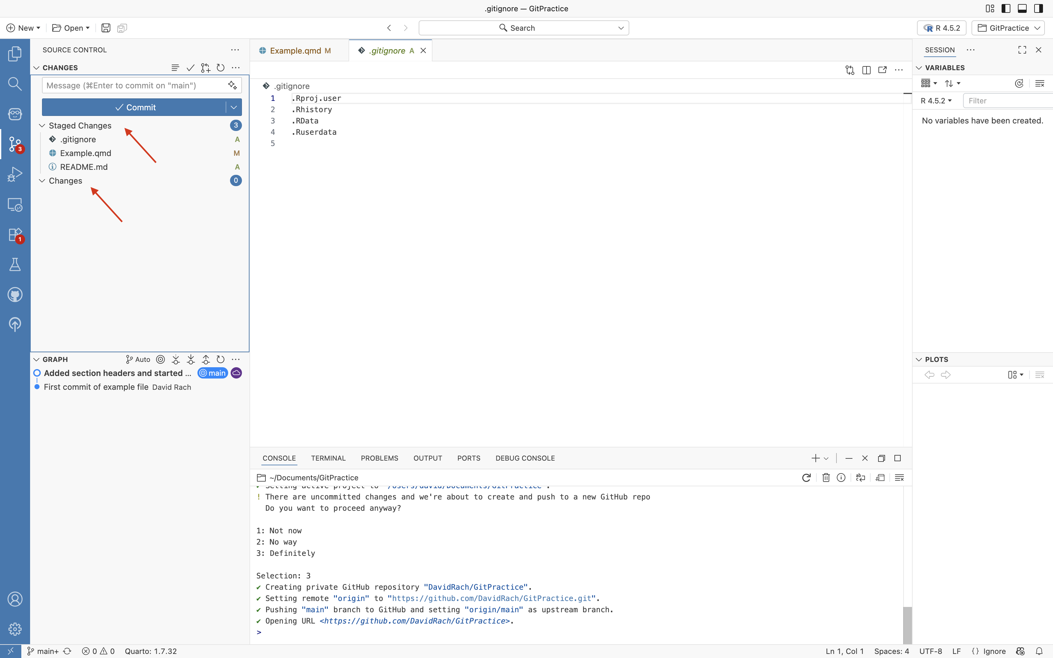 If we turn our attention to the left primary sidebar, we can see that within our GitPractie folder there are three files, our Example.qmd, and the default README.md and .gitignore files. These all show up in green text with U’s to the right of the file names.