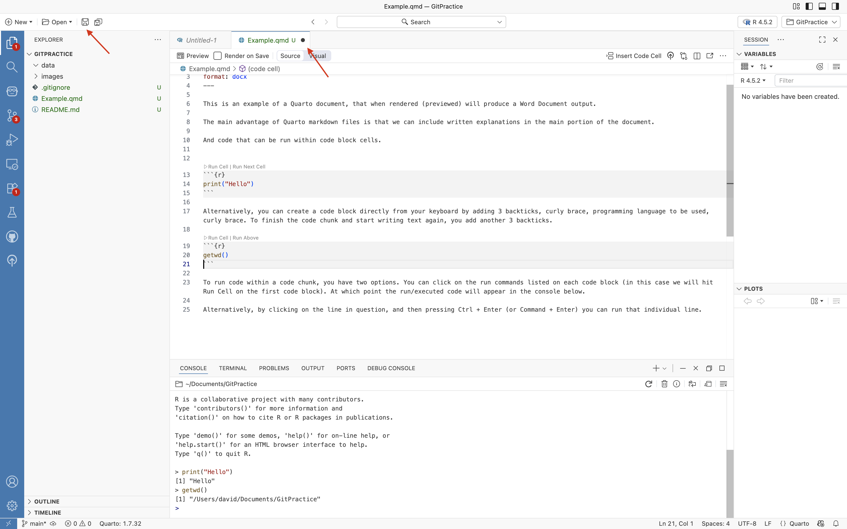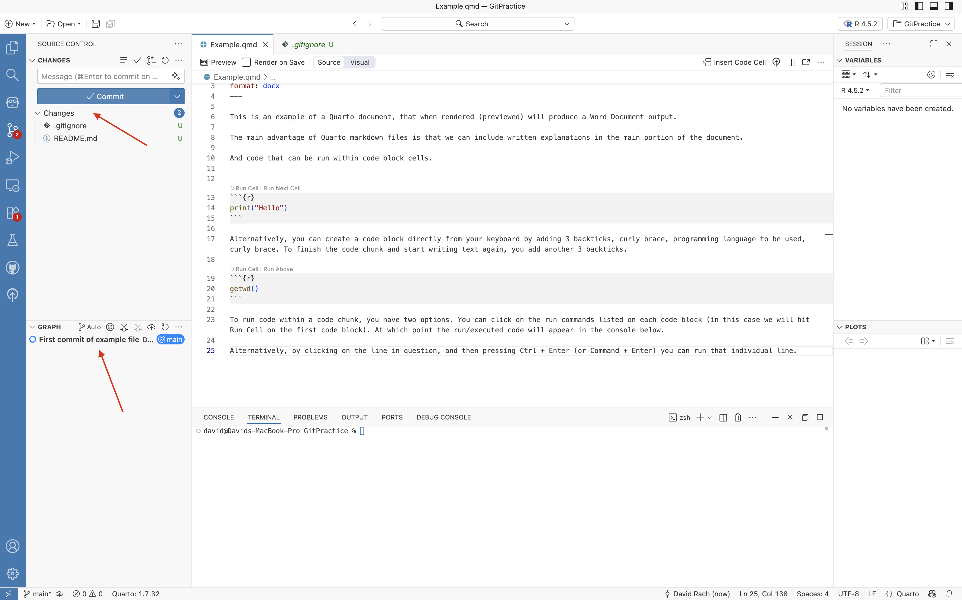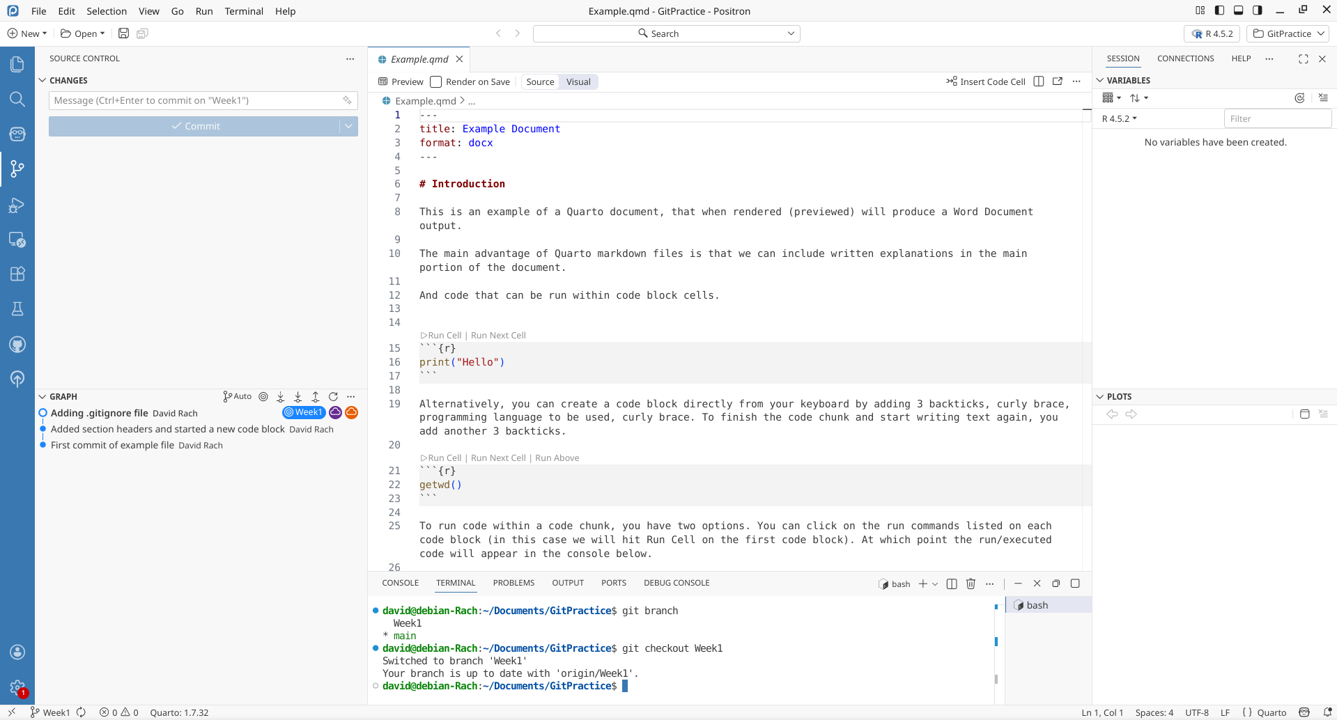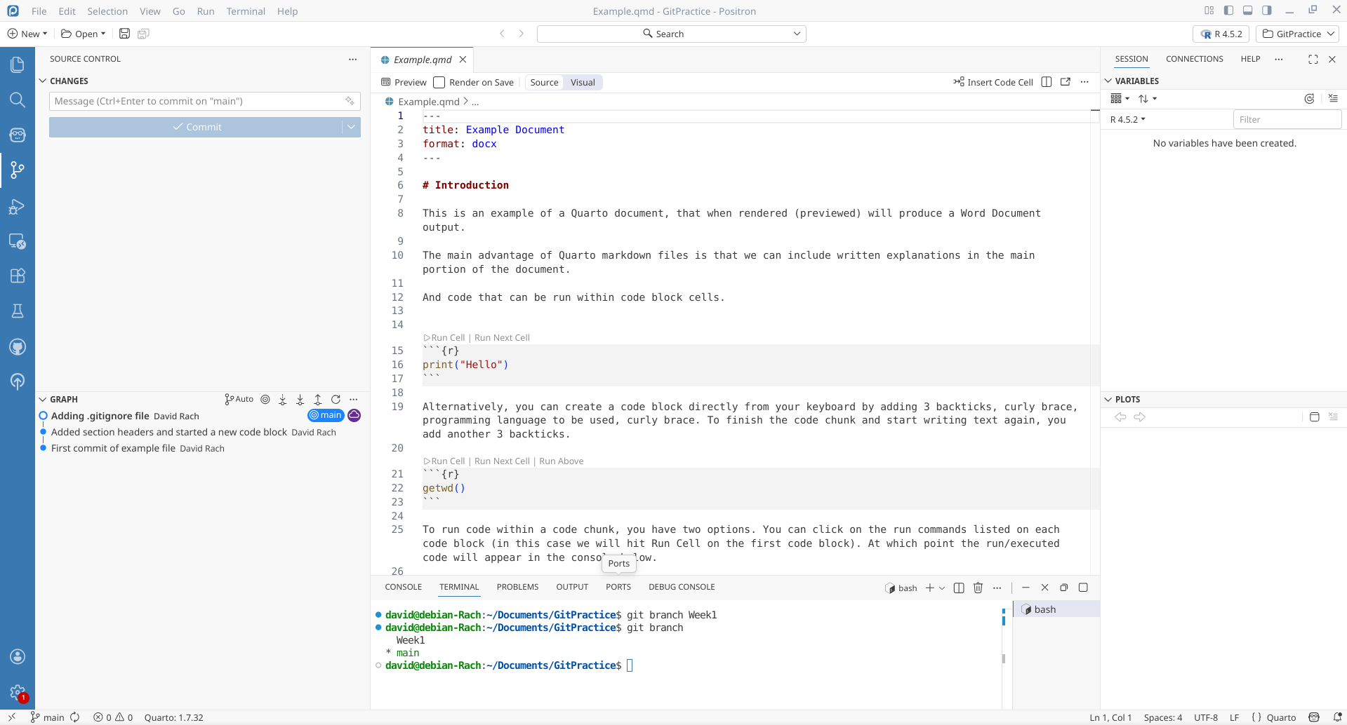 If we turn our attention to the left primary sidebar, we can see that within our GitPractie folder there are three files, our Example.qmd, and the default README.md and .gitignore files. These all show up in green text with U’s to the right of the file names.