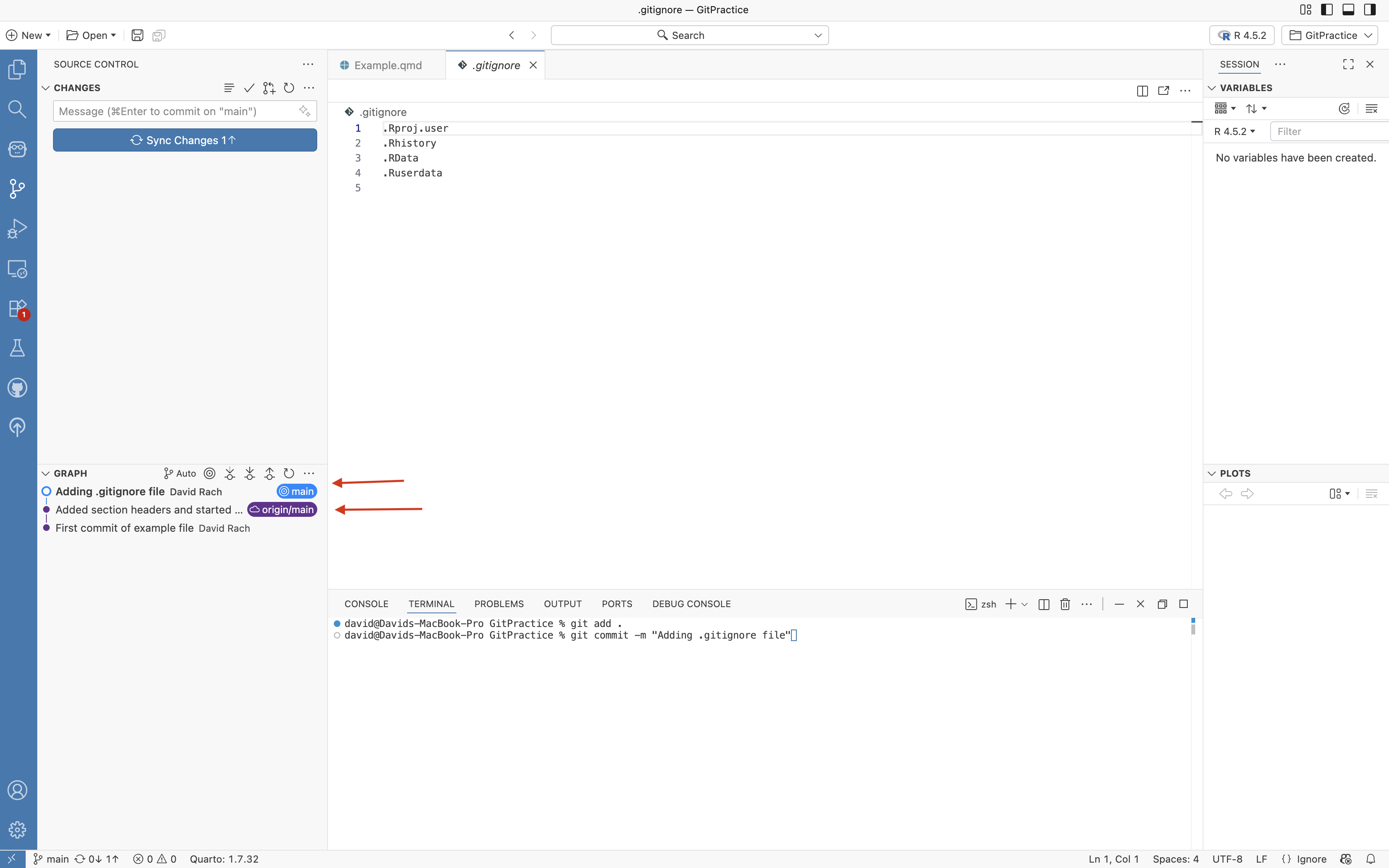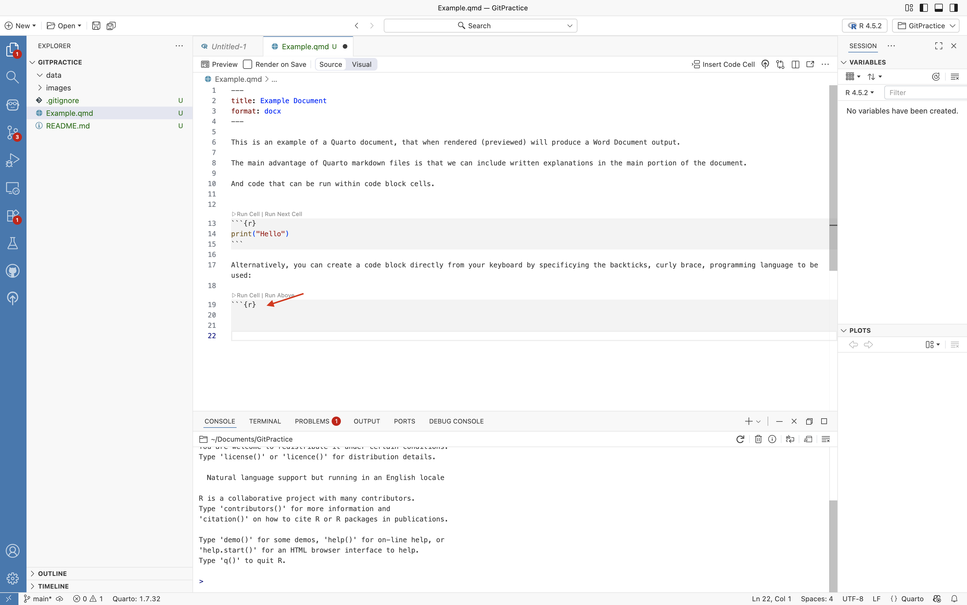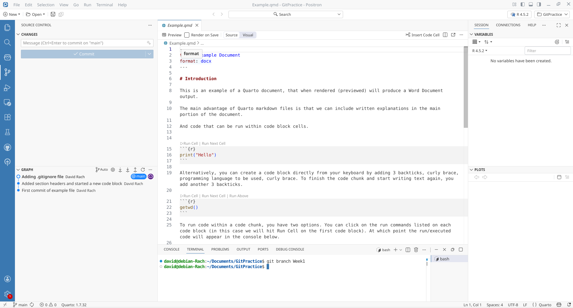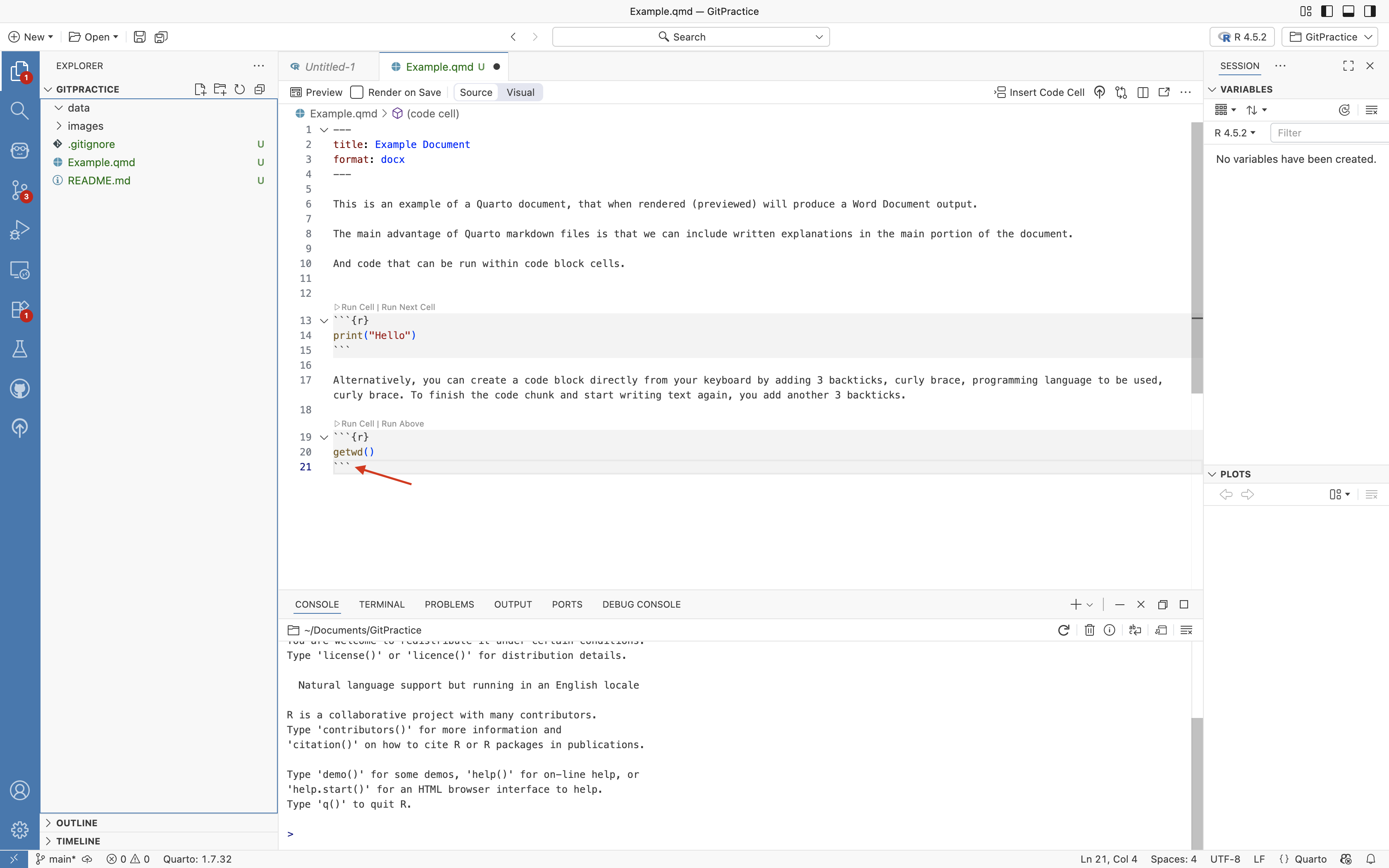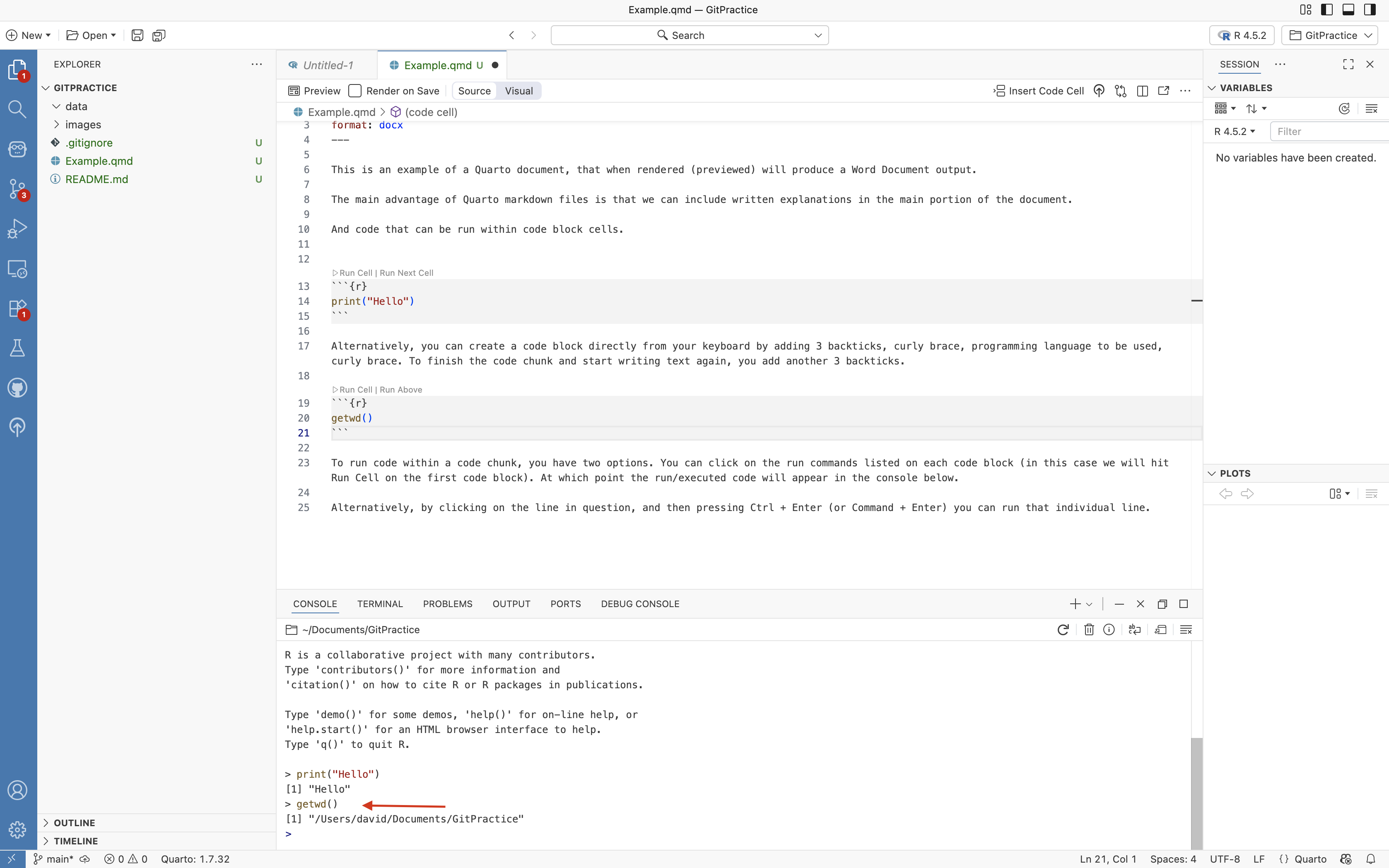 If we turn our attention to the left primary sidebar, we can see that within our GitPractie folder there are three files, our Example.qmd, and the default README.md and .gitignore files. These all show up in green text with U’s to the right of the file names.