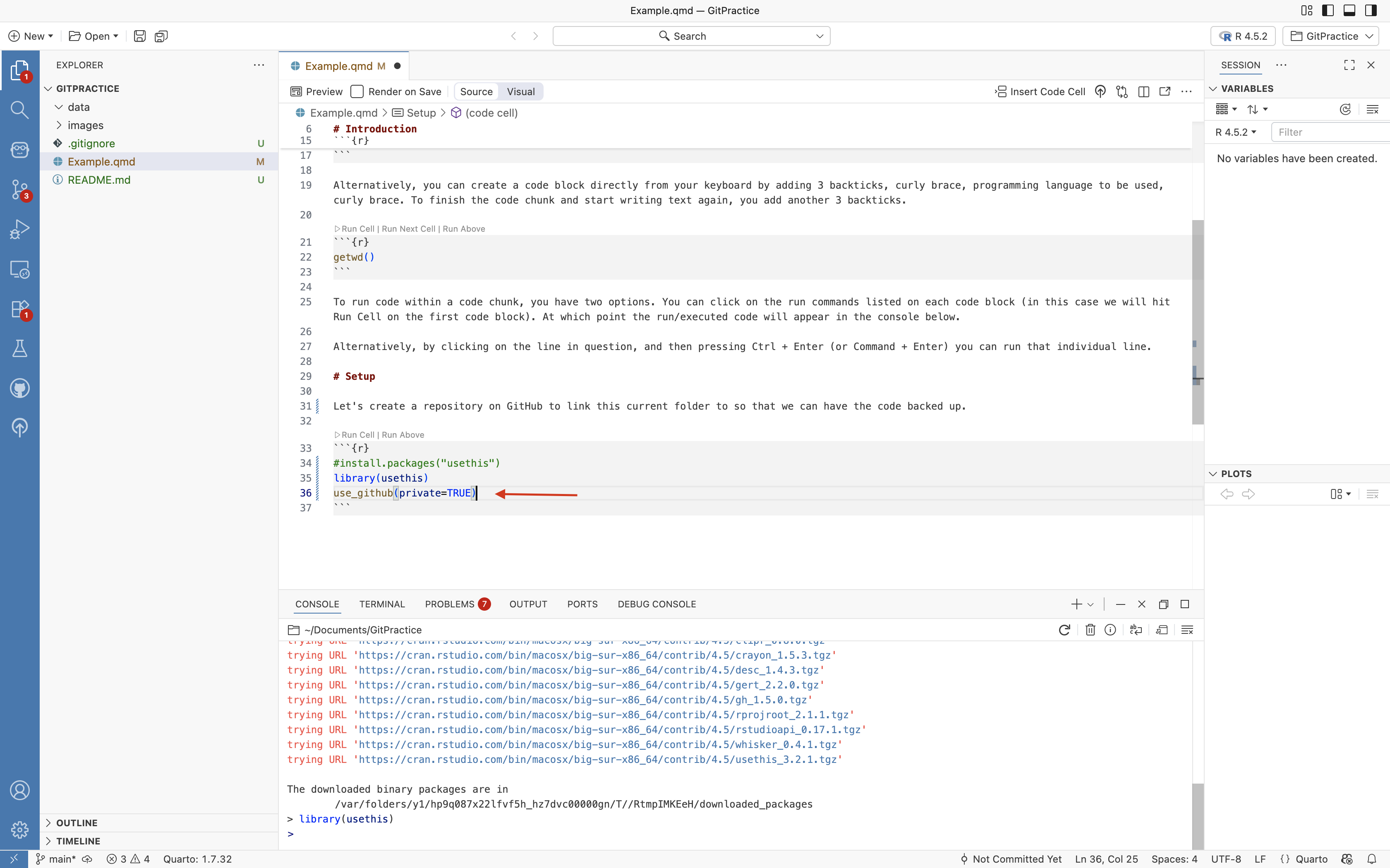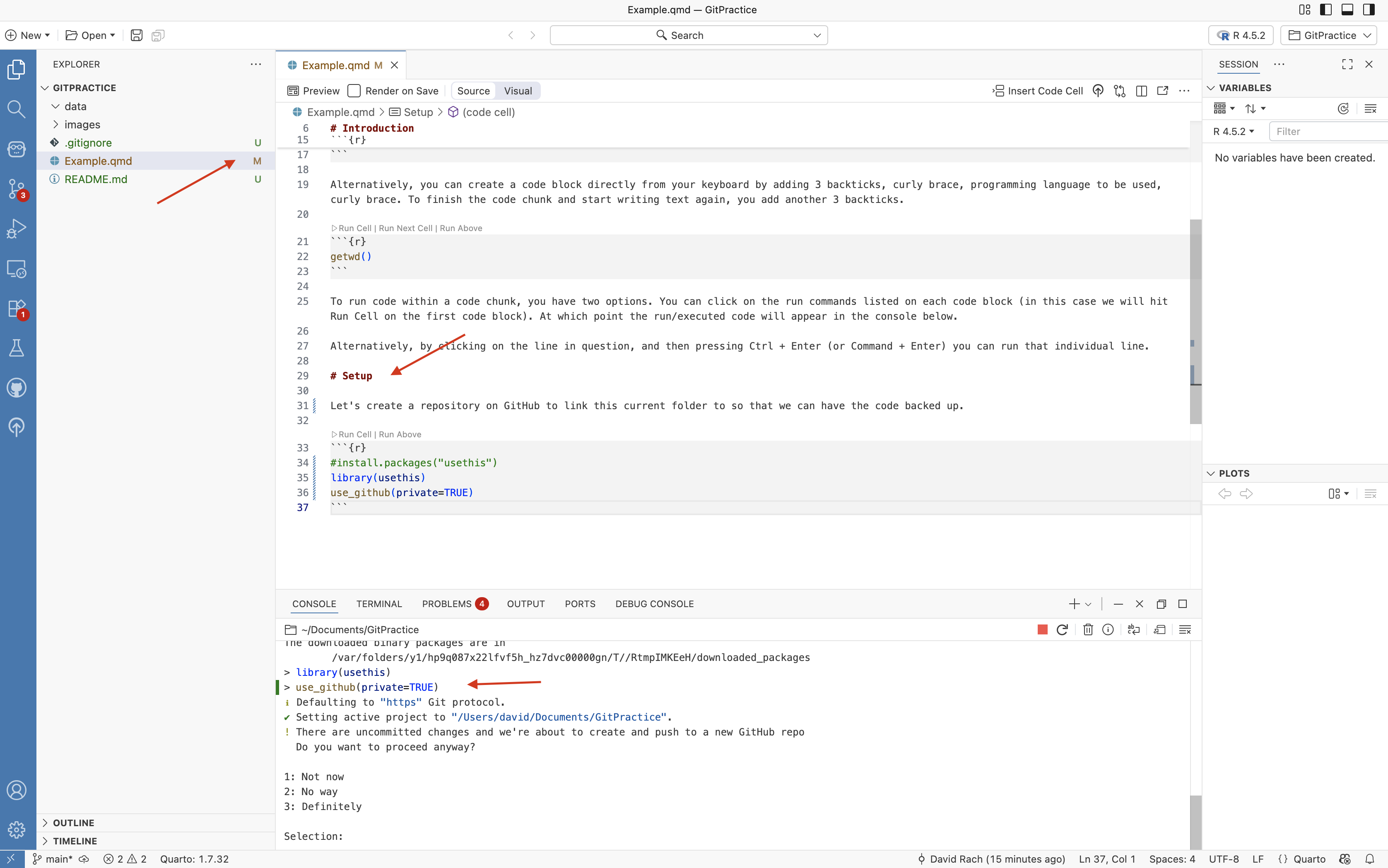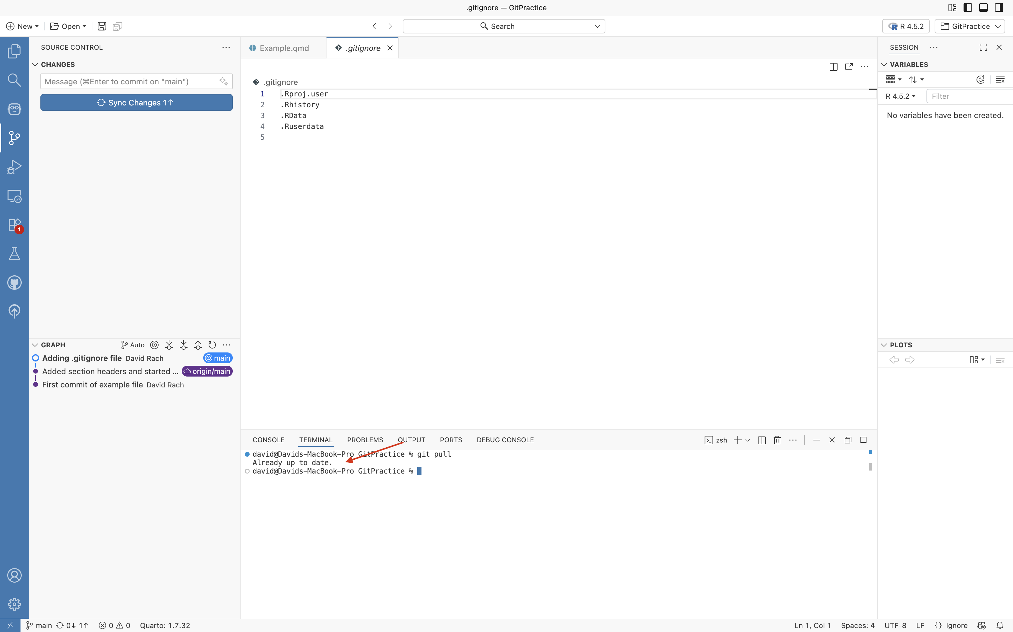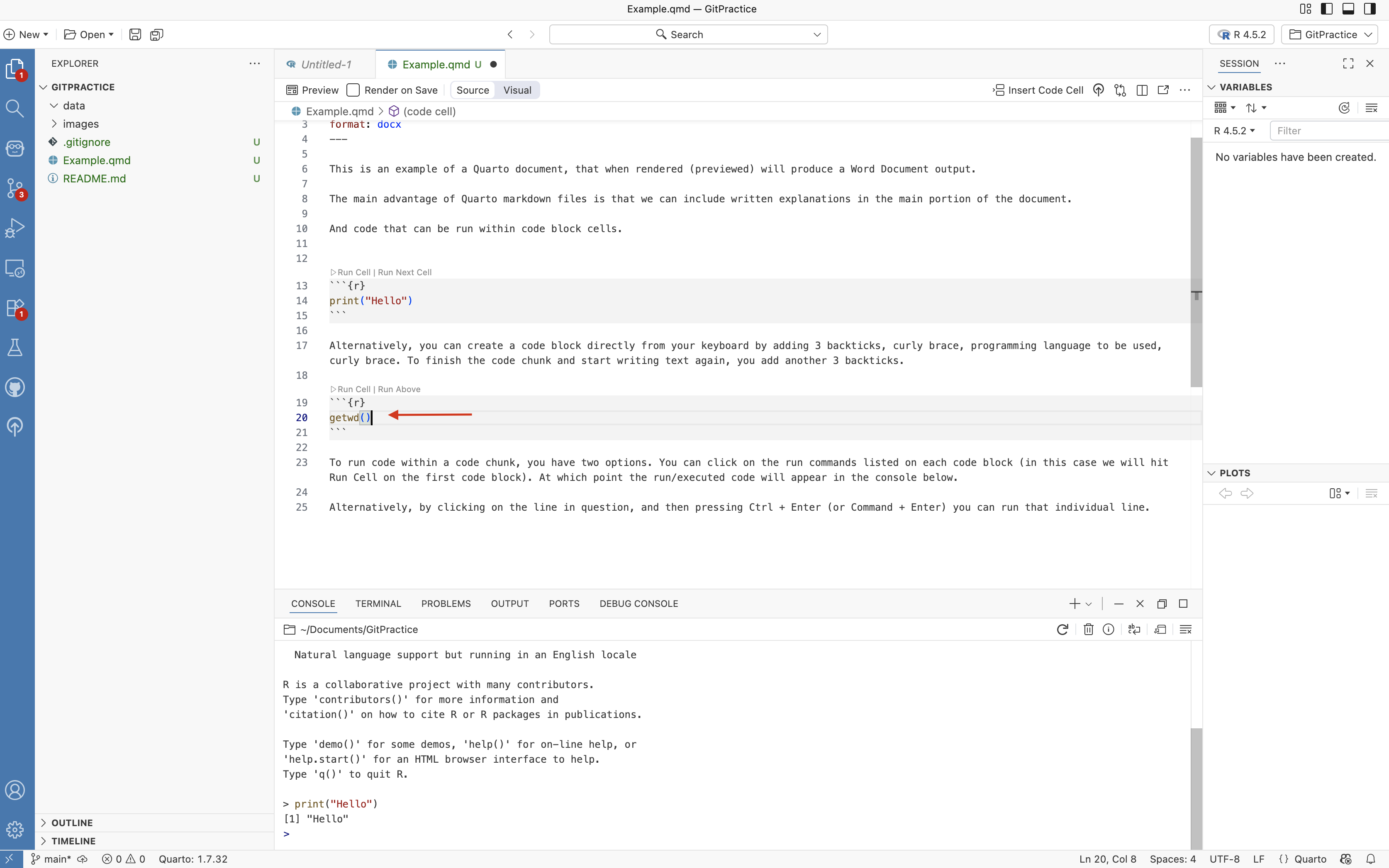 If we turn our attention to the left primary sidebar, we can see that within our GitPractie folder there are three files, our Example.qmd, and the default README.md and .gitignore files. These all show up in green text with U’s to the right of the file names.
