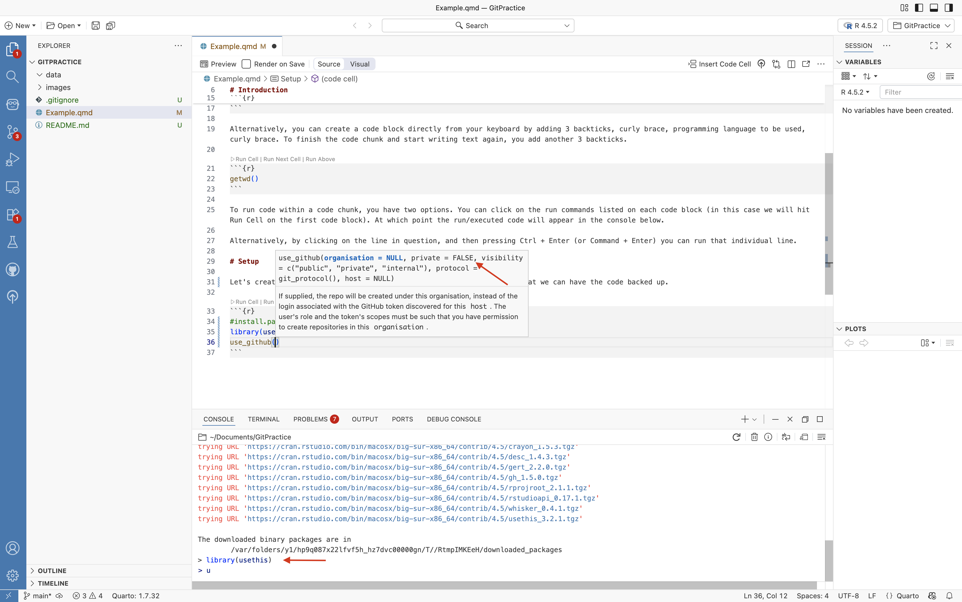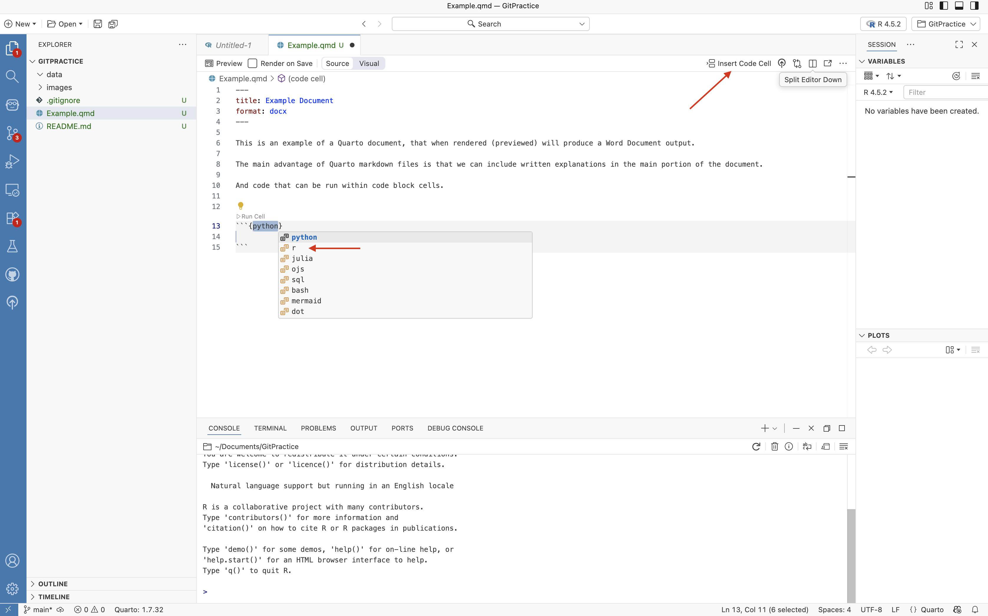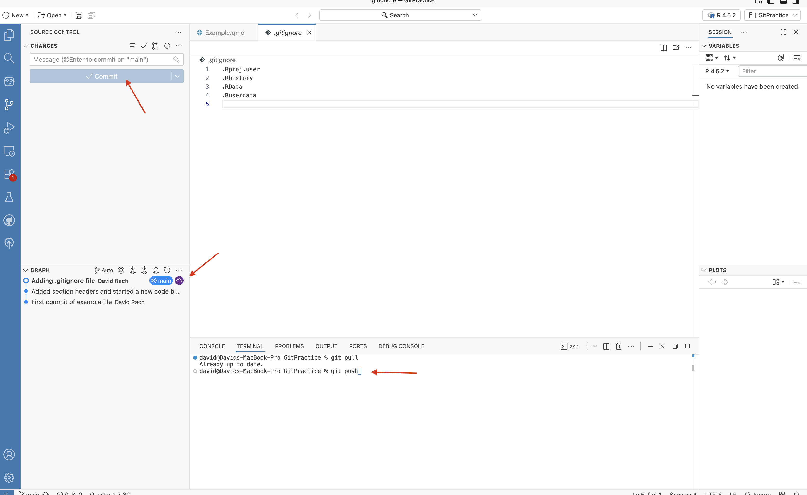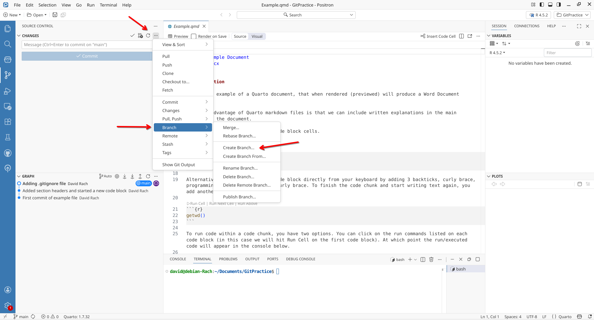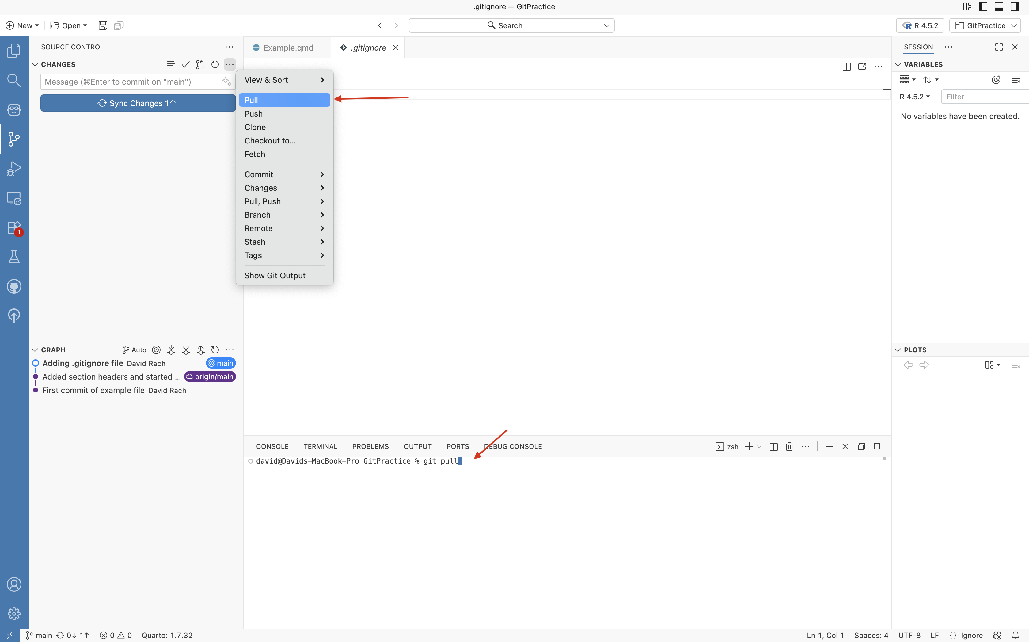 If we turn our attention to the left primary sidebar, we can see that within our GitPractie folder there are three files, our Example.qmd, and the default README.md and .gitignore files. These all show up in green text with U’s to the right of the file names.