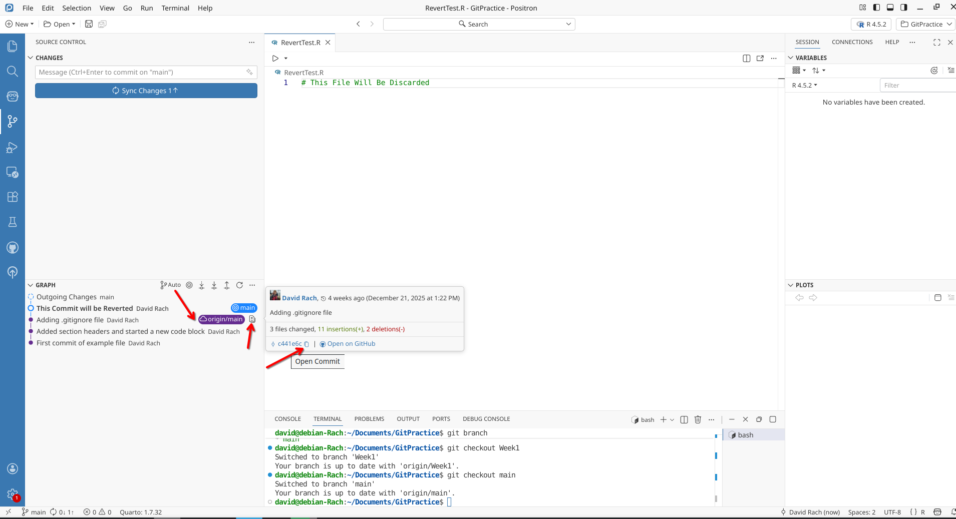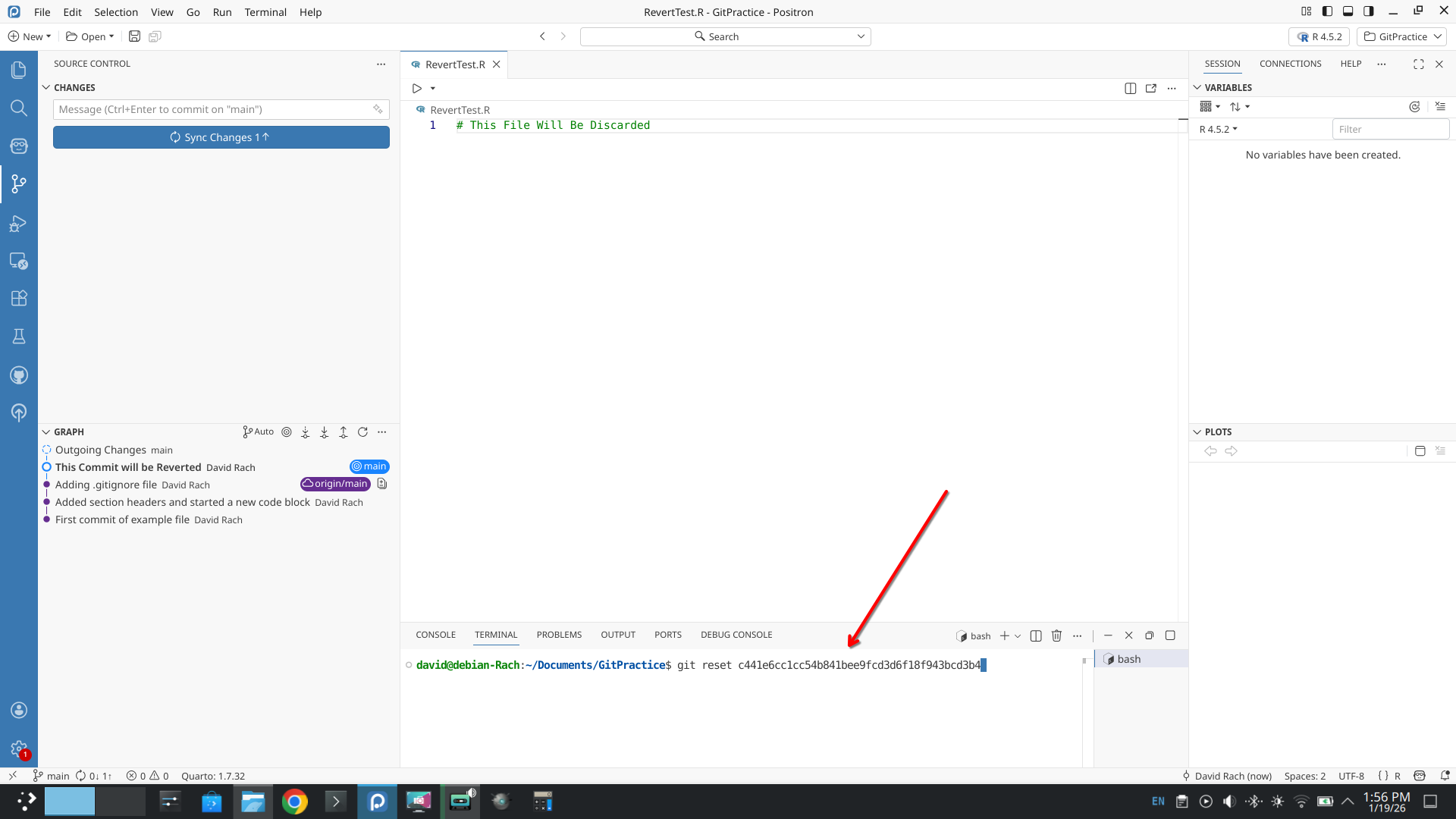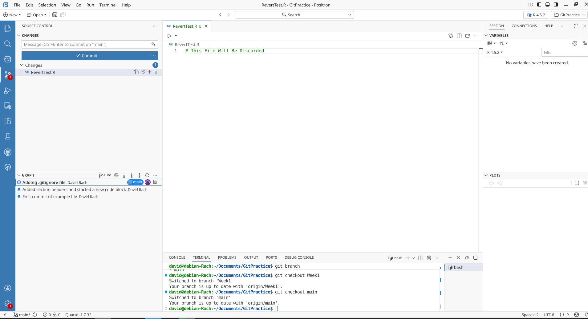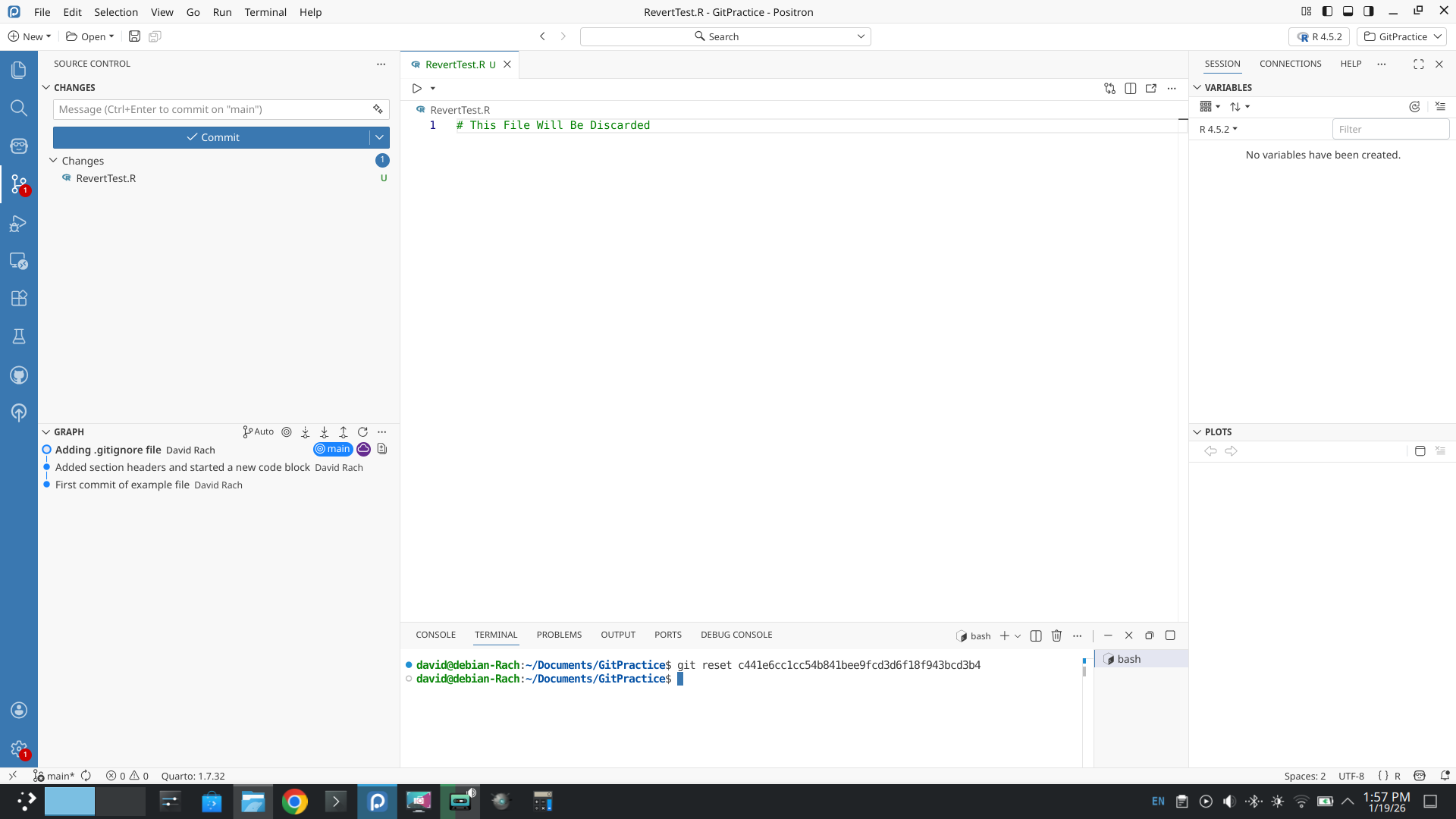 Then, enter “git reset –hard thecommithashnumber” into the terminal, which would result in a “hard” return to the previous commits save-state. You may need to close and reopen Positron to see the changes reflected.