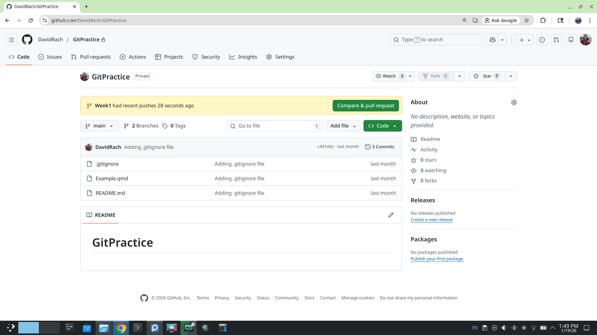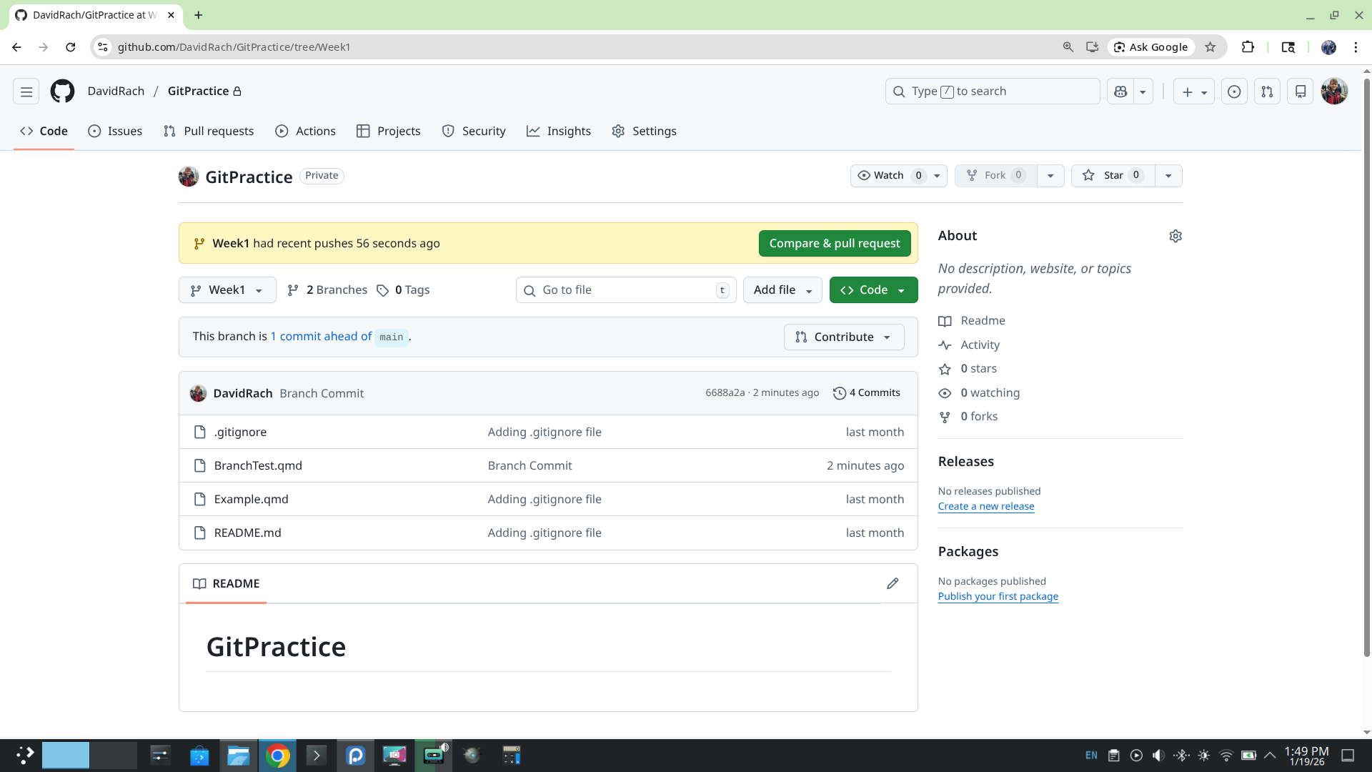 If we were to check on GitHub, we can see that no new files are present on the main branch, but can see the notification listing recent changes to Week1 branch.