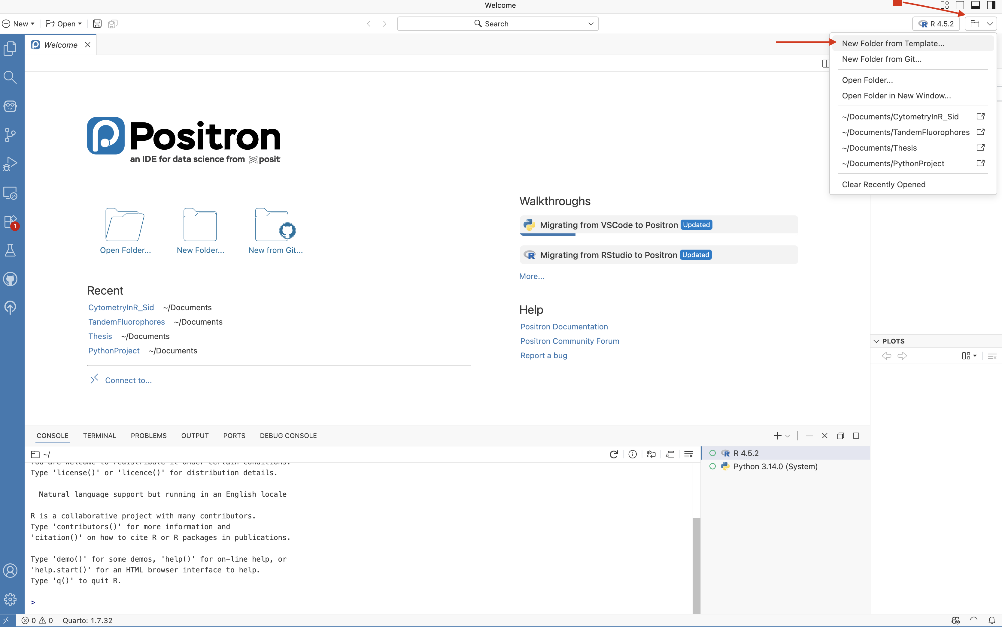From here we can see we have two options, create a “New Folder from a Template”, and create a “New Folder from Git” (which was the option we used during workstation setup to bring in the forked CytometryInR and README repository folders locally).
