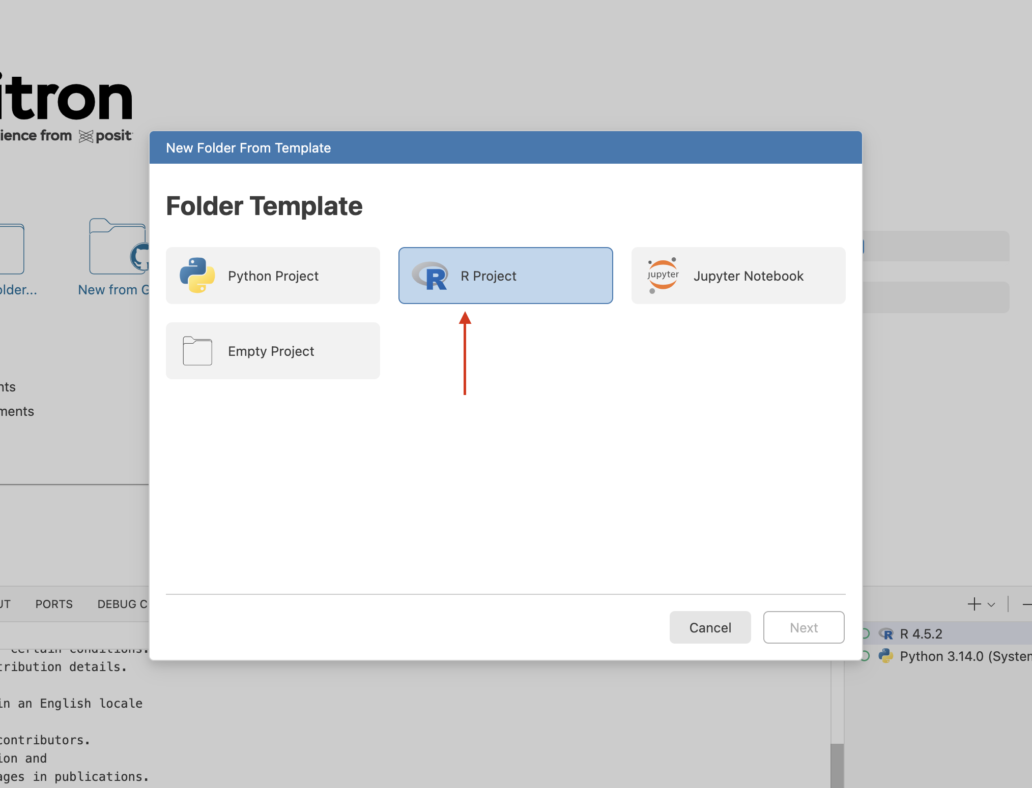 Since Positron can use multiple programming languages, when we select “New Folder from Template” we will be asked what kind of folder template we want to use. Since we are working in R, we will select the “R Project” option.