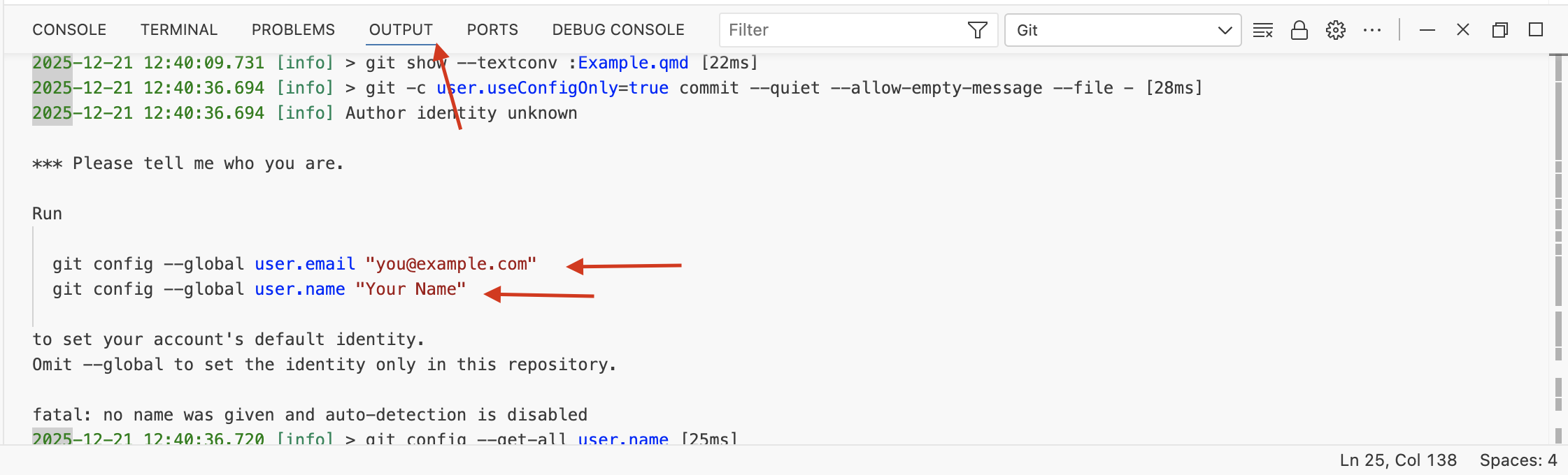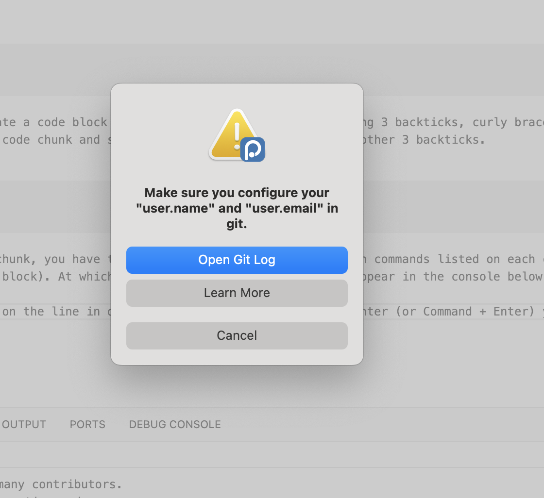 If this your first time using version control, you will likely encounter the following pop-up asking that you provide a user.name and user.email. This is used to designate the author of the changes.If you get this popup, go ahead and select “Open Git Log”