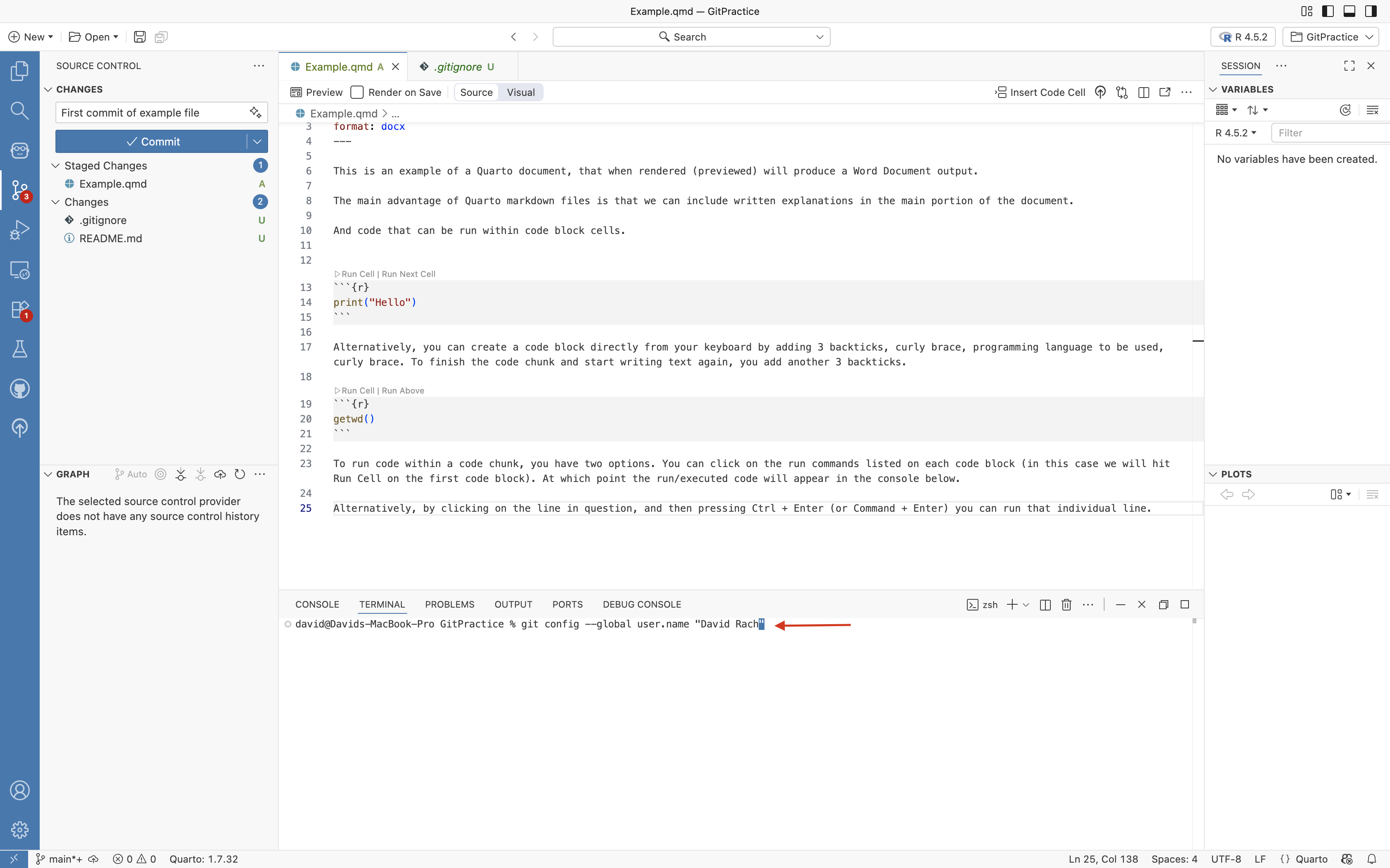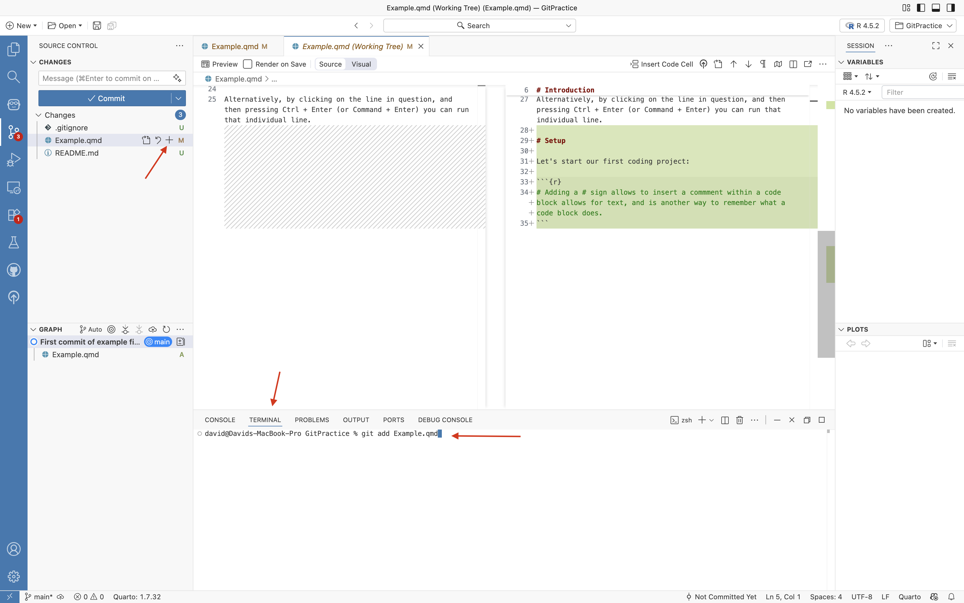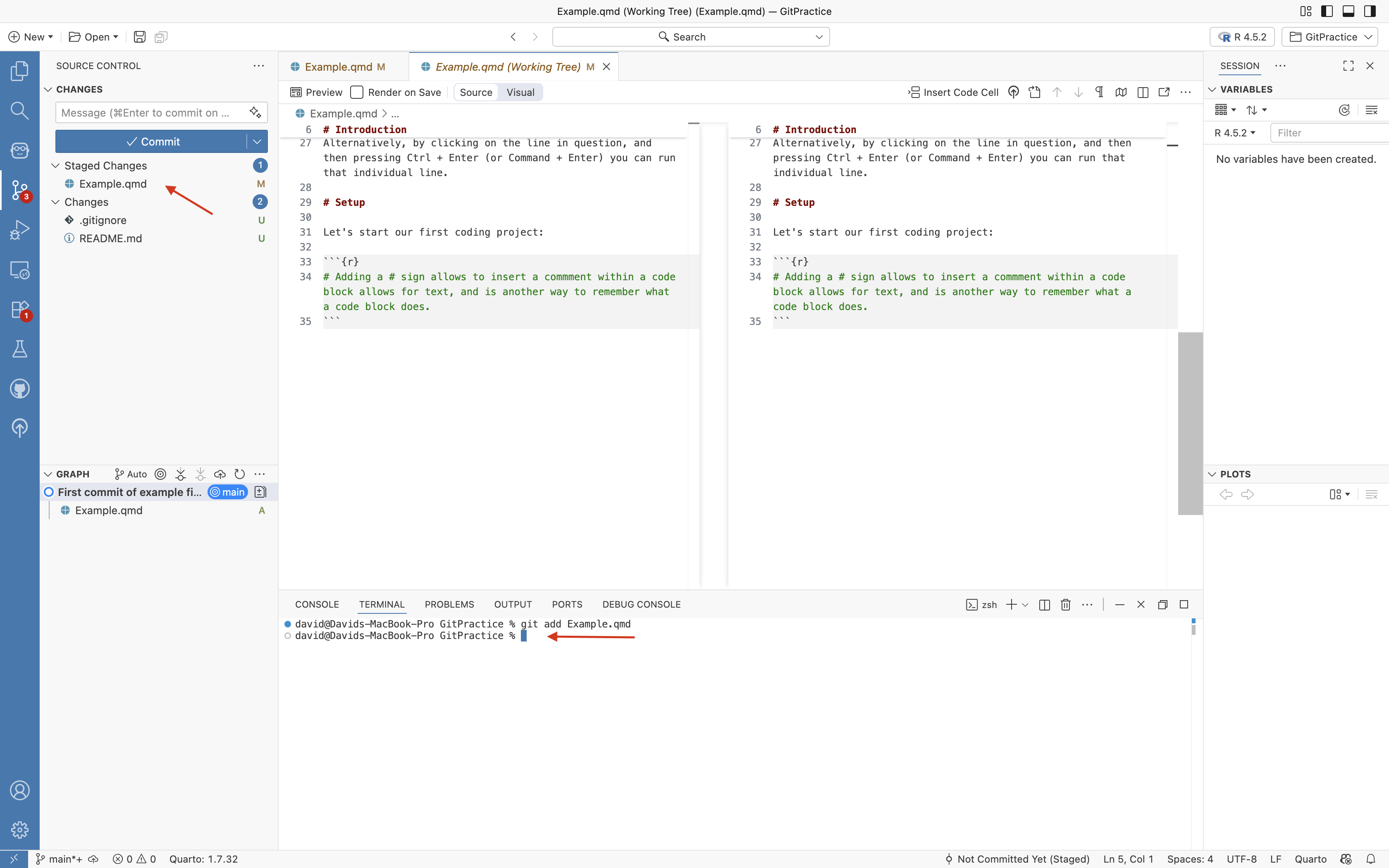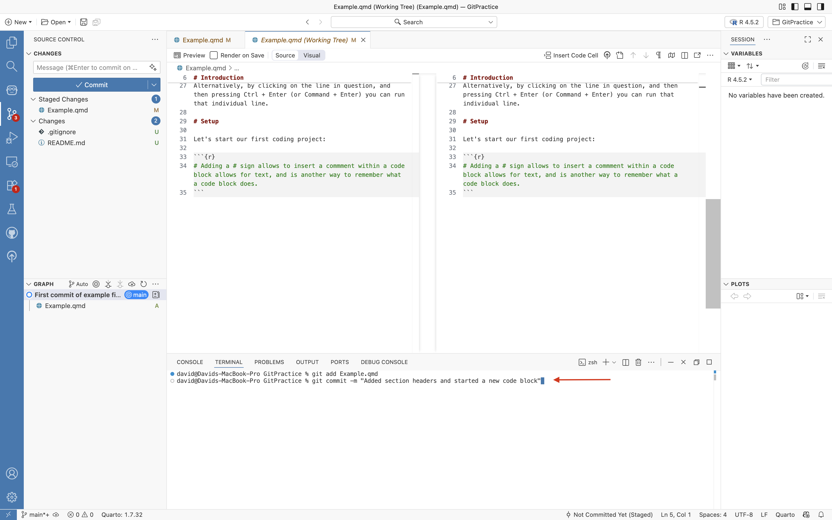 You will see after pressing enter a new blank terminal line appear. If you glance at the left-sidebar, you can see that Example.qmd now appears under the Staged Changes dropdown.