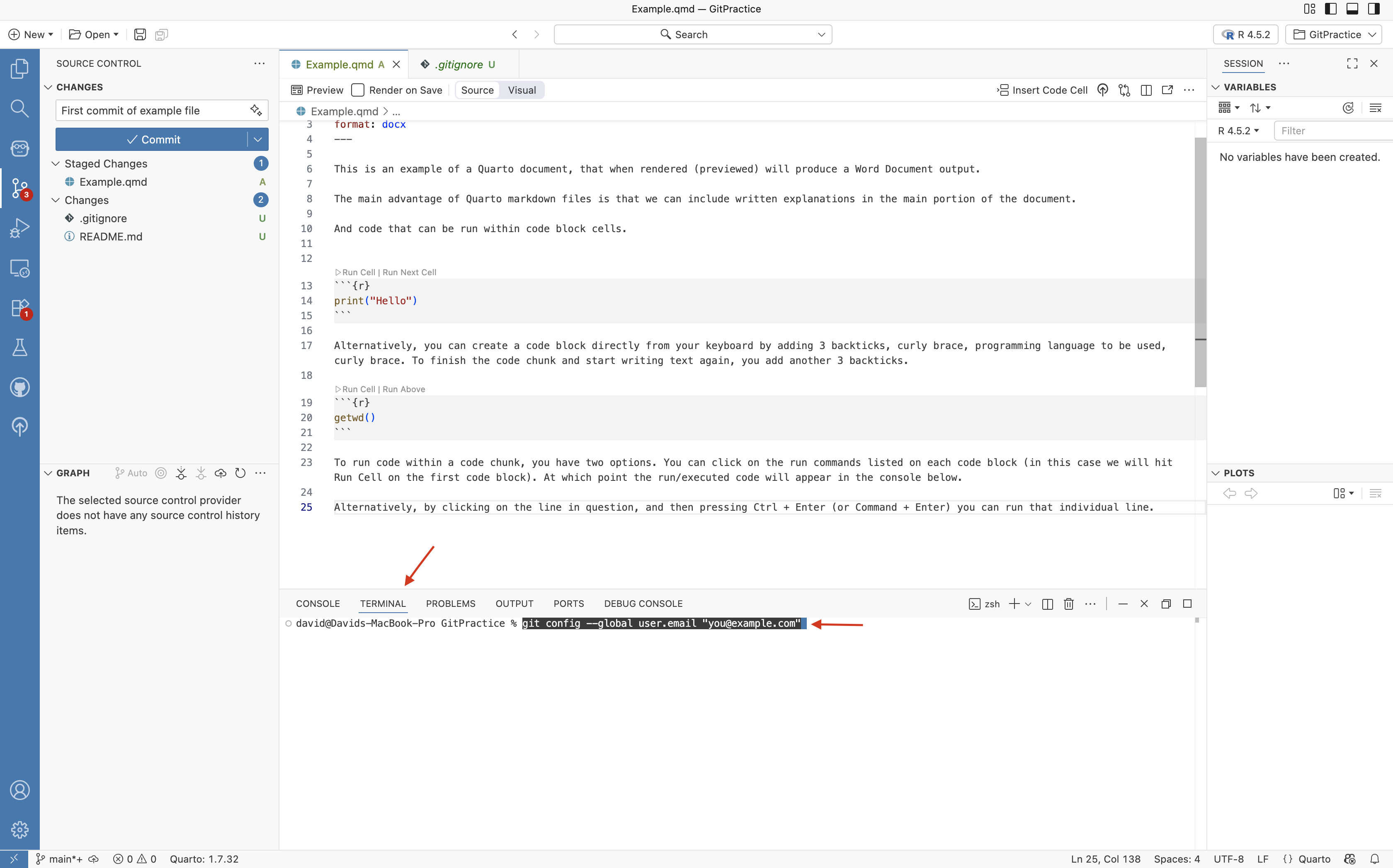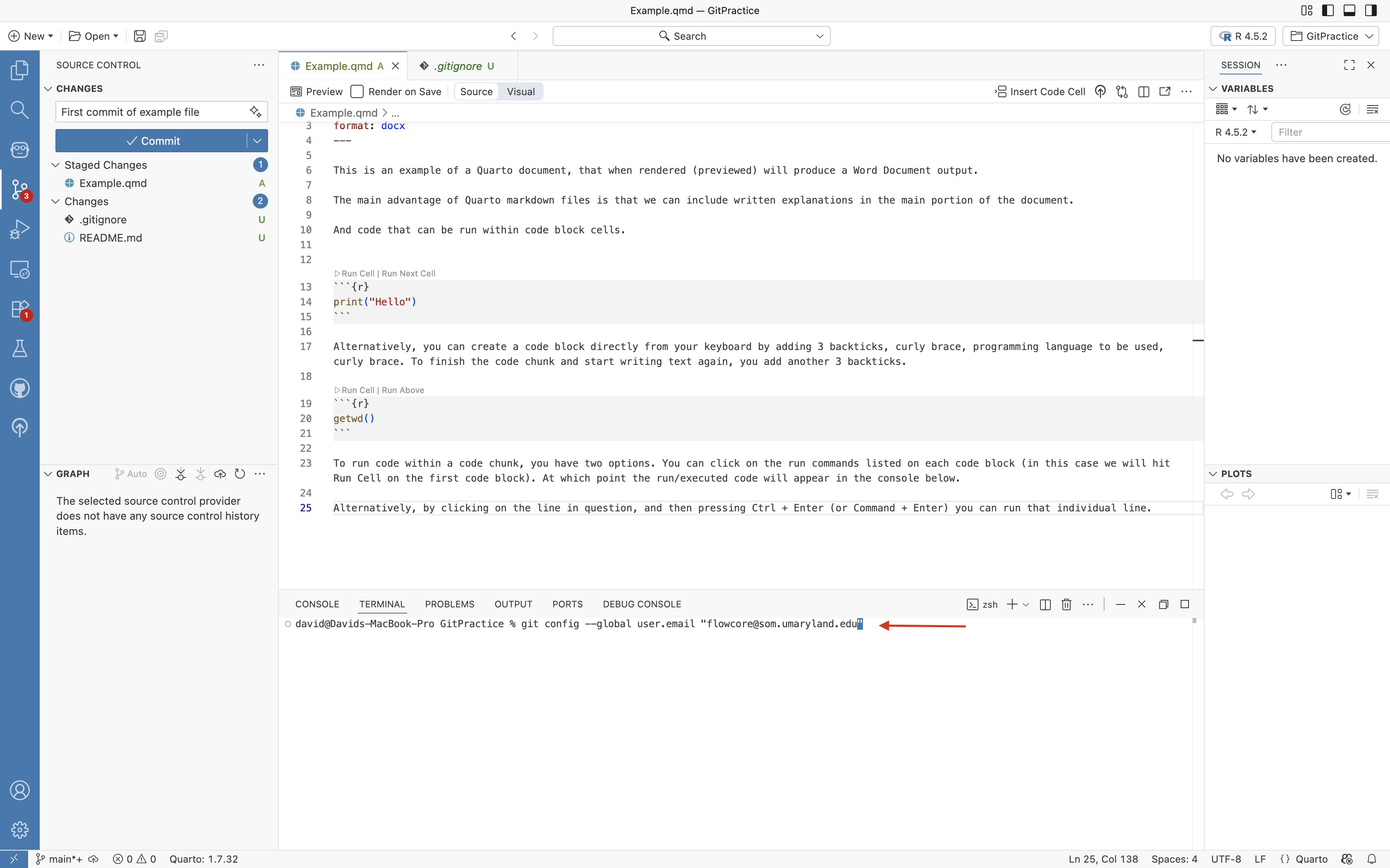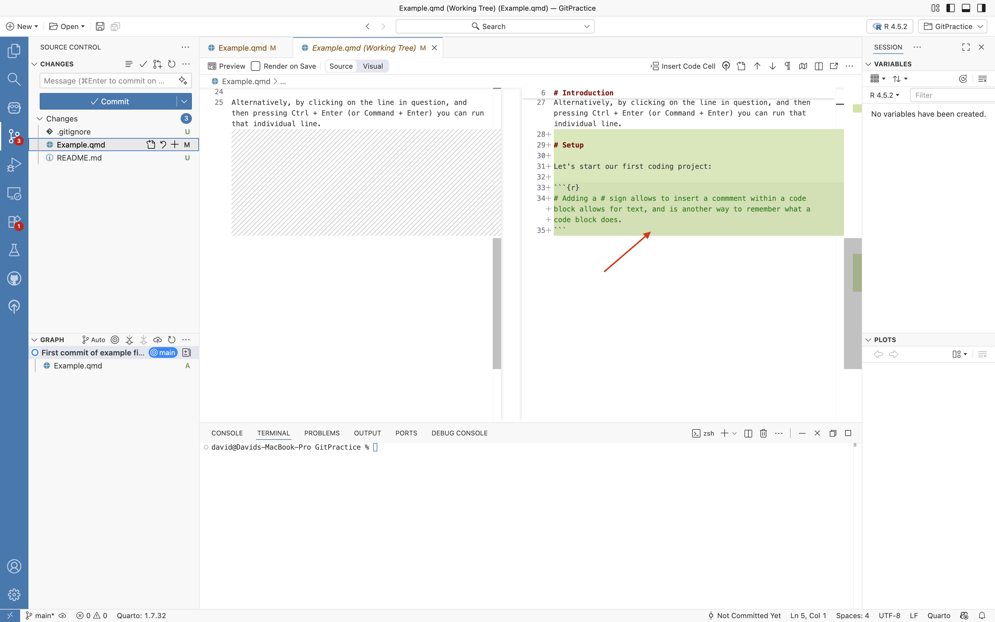 You will see after pressing enter a new blank terminal line appear. If you glance at the left-sidebar, you can see that Example.qmd now appears under the Staged Changes dropdown.