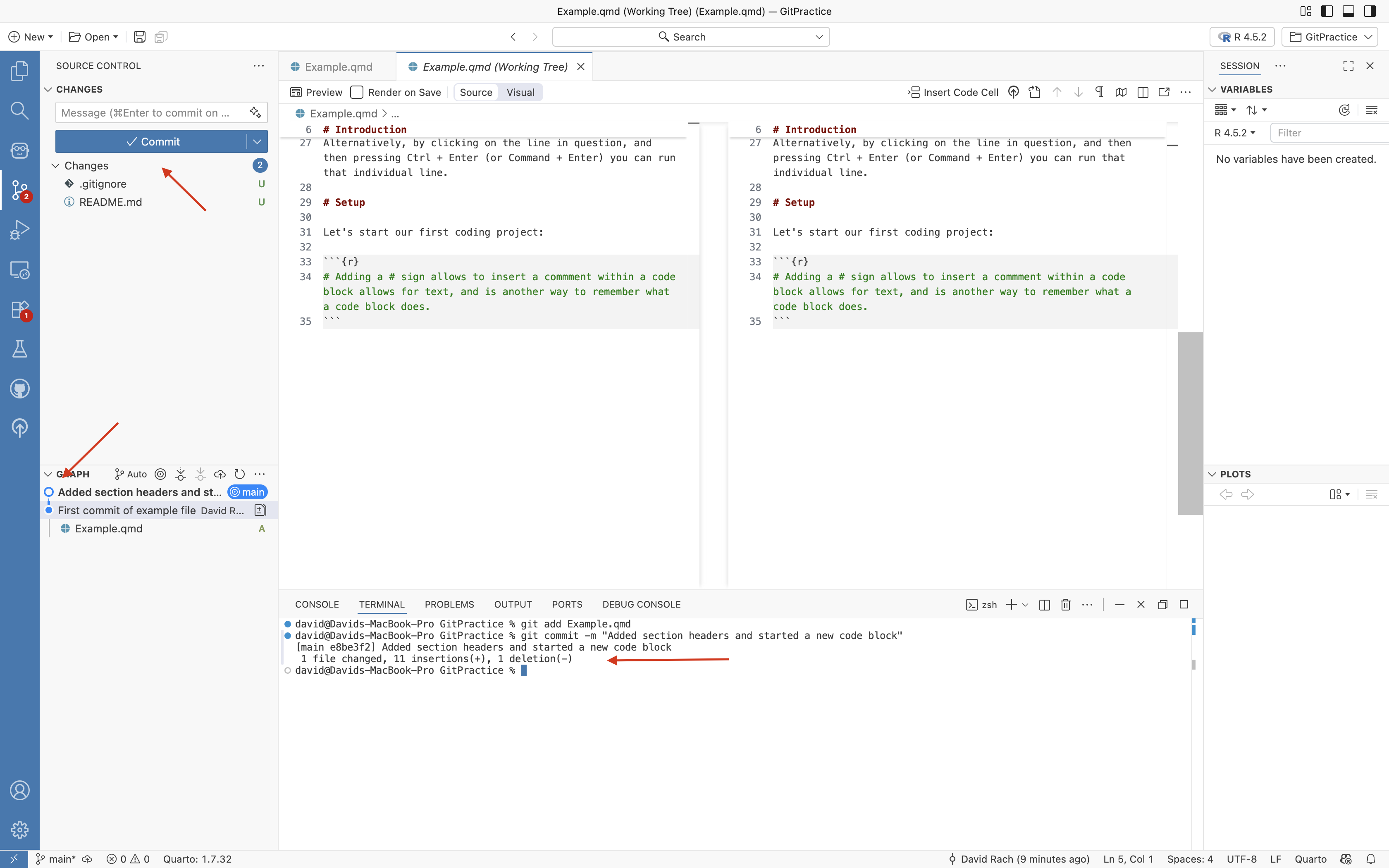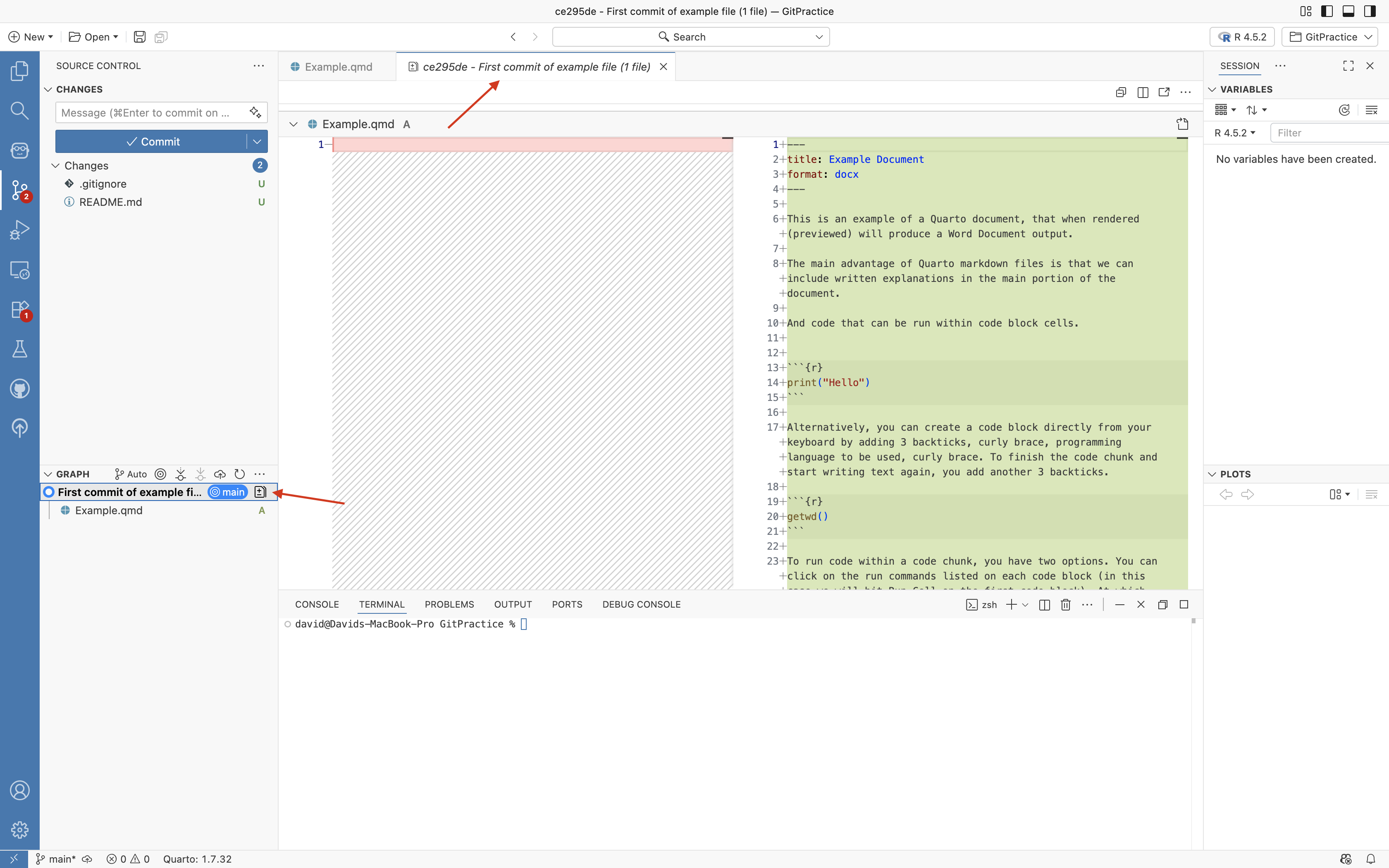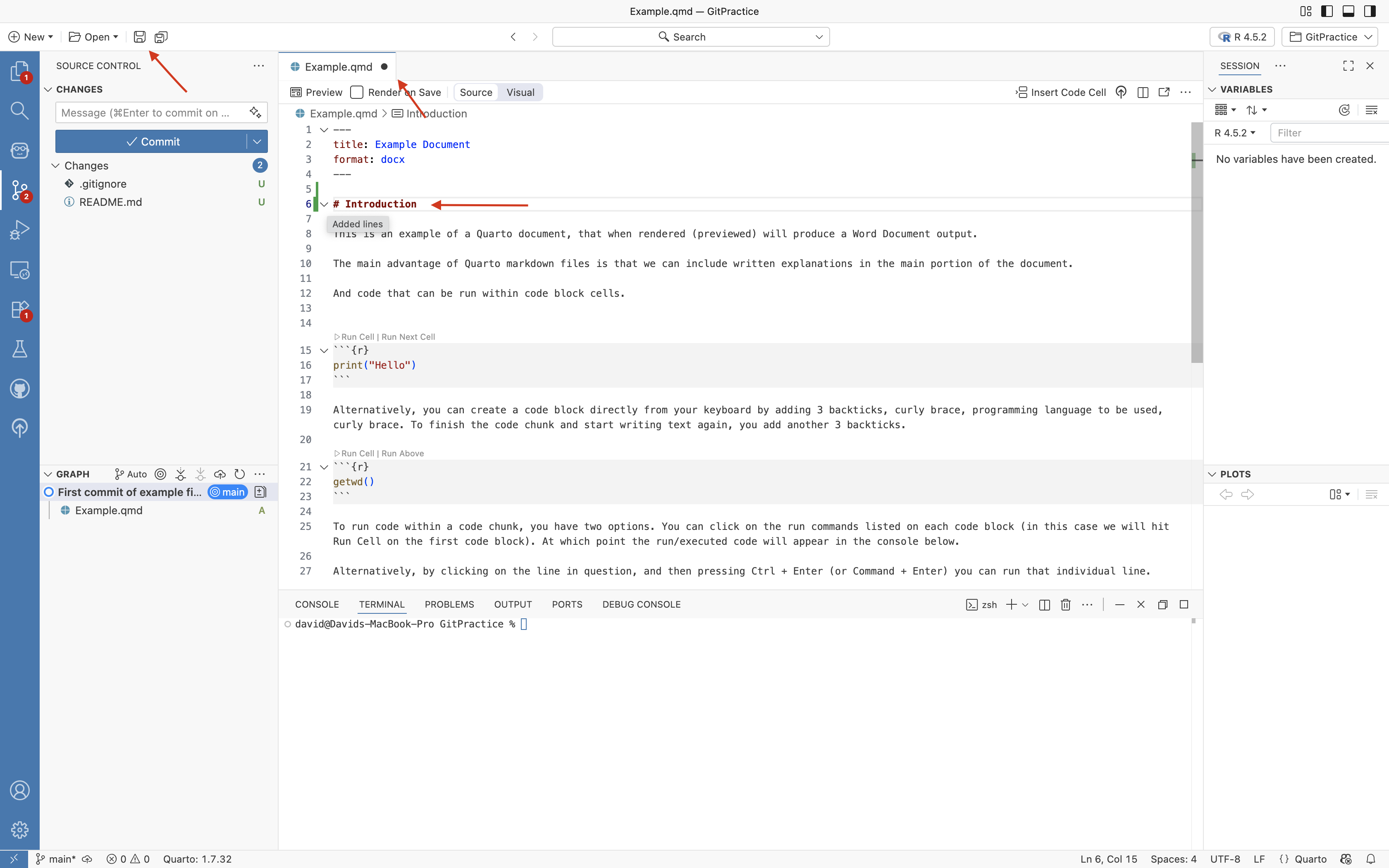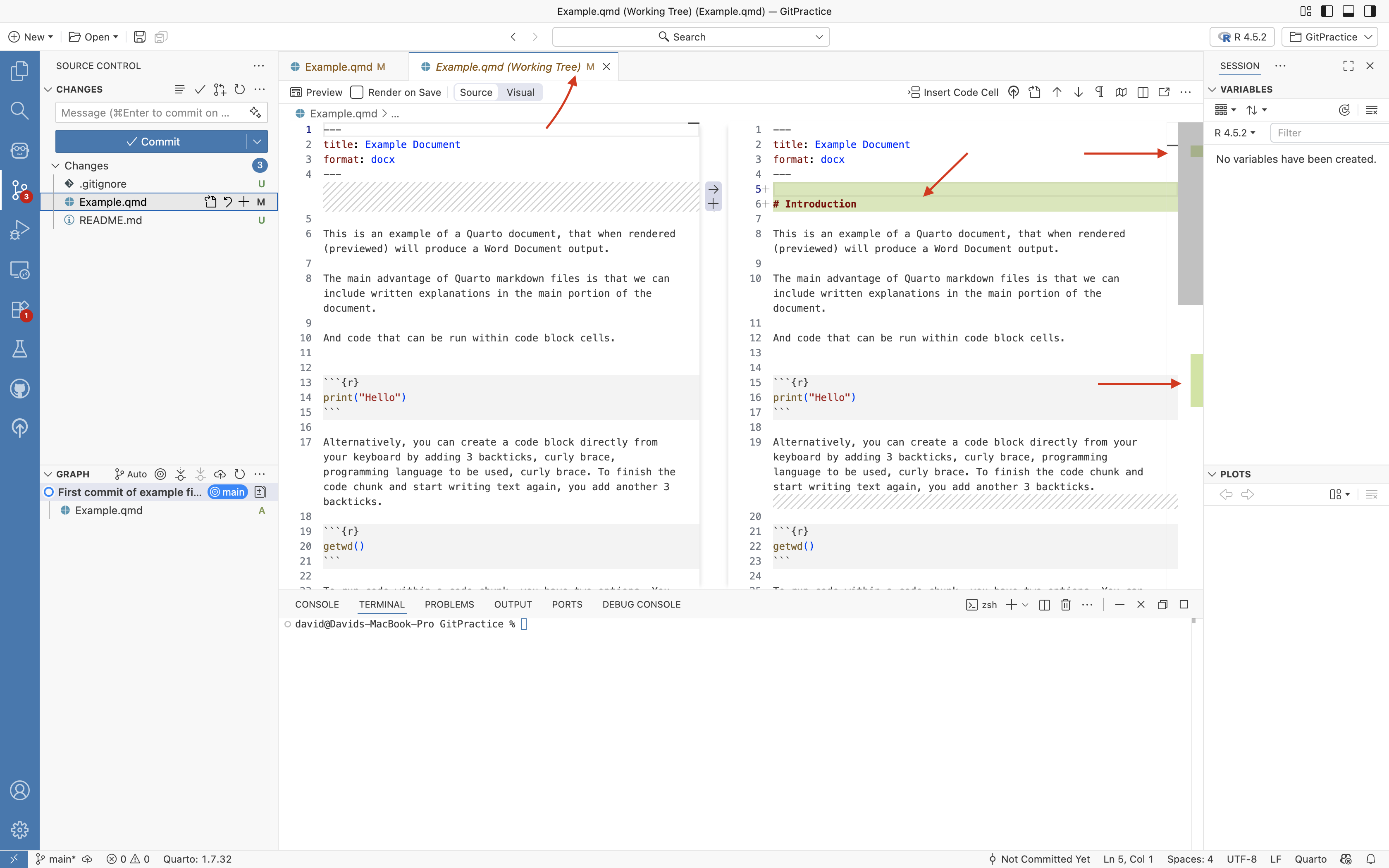 You will see after pressing enter a new blank terminal line appear. If you glance at the left-sidebar, you can see that Example.qmd now appears under the Staged Changes dropdown.
