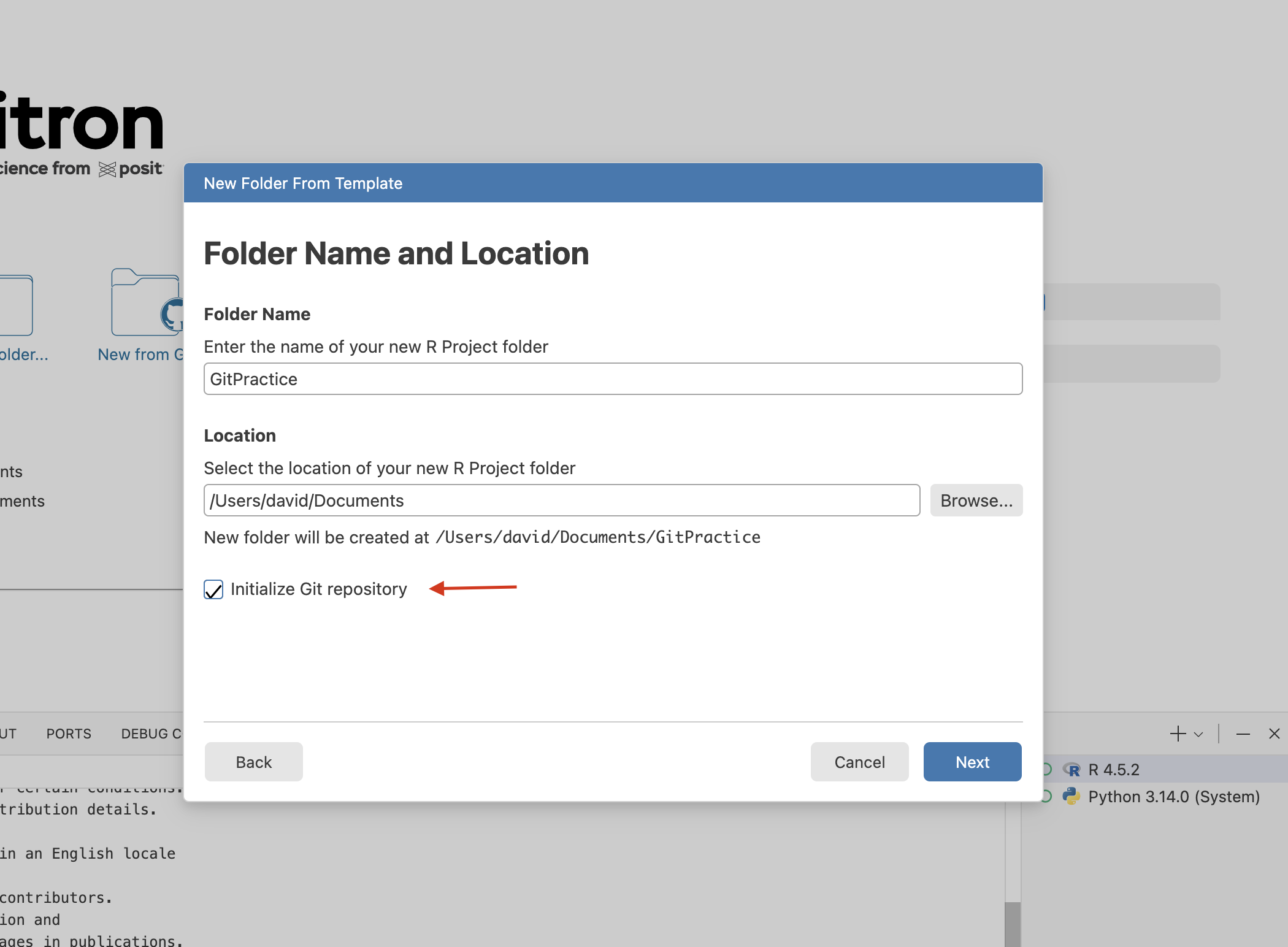 Having named our new Project Folder, and designated a storage location, go ahead and check the Initialize Git Repository option. This will indicate to version control to monitor content and changes to files within this folder.