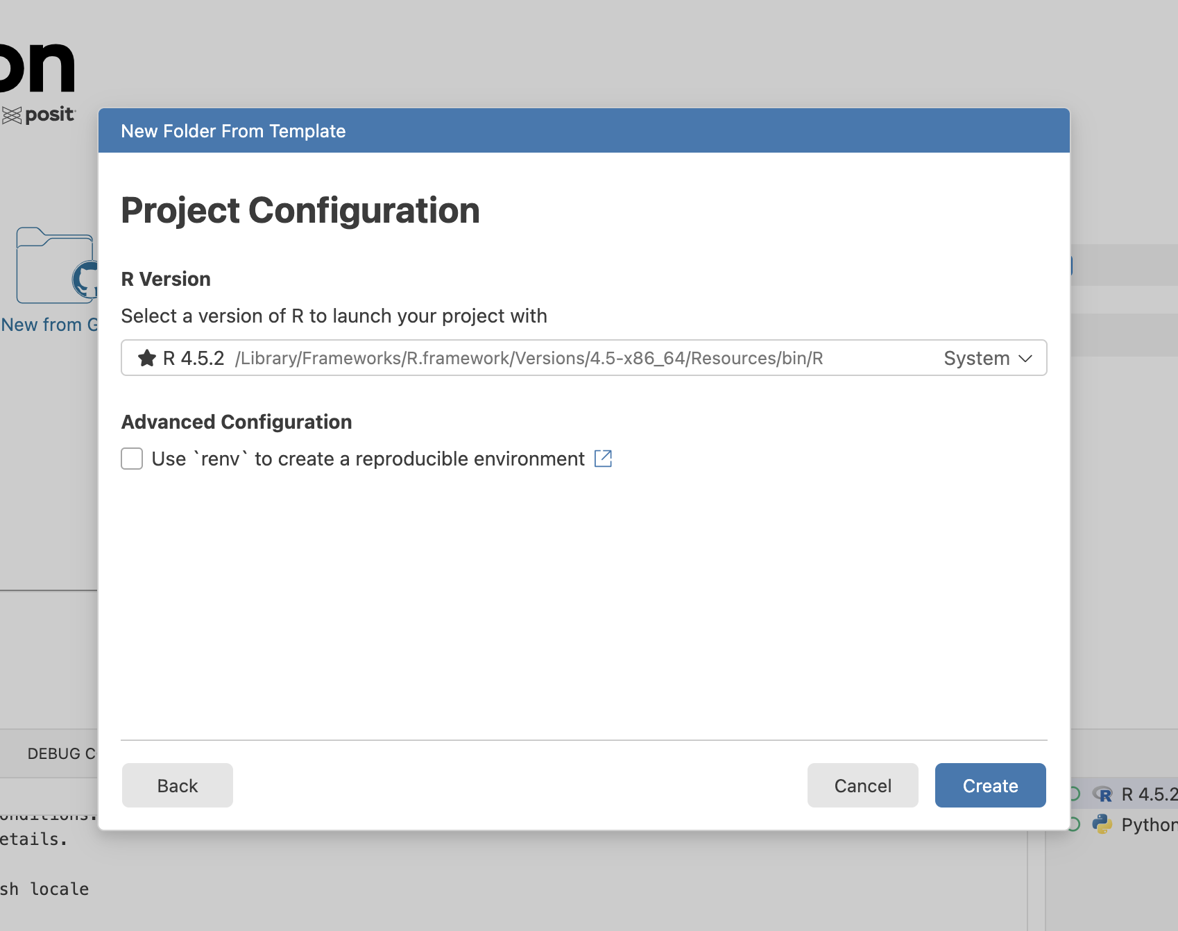 The next setup screen will verify which version of R you wish to use. Since we are just getting started, your most recent version of R (usually system) should work. We will also leave the “renv” (reproducible environment setup) option unchecked for the time being (we will revisit the concept later in the course).