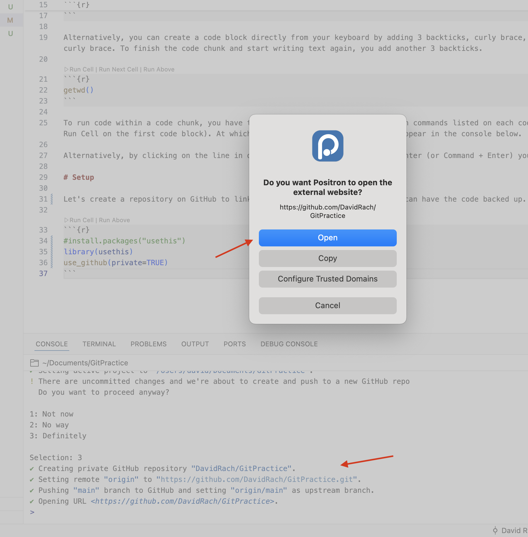 The usethis R package will then execute the series of git commands that are needed to set up a GitHub repository (ie. the messages being displayed in the console window), and when finished will open a pop-up asking whether you want to see your new repository in your default Web Browser. I will go ahead and select yes in this case.