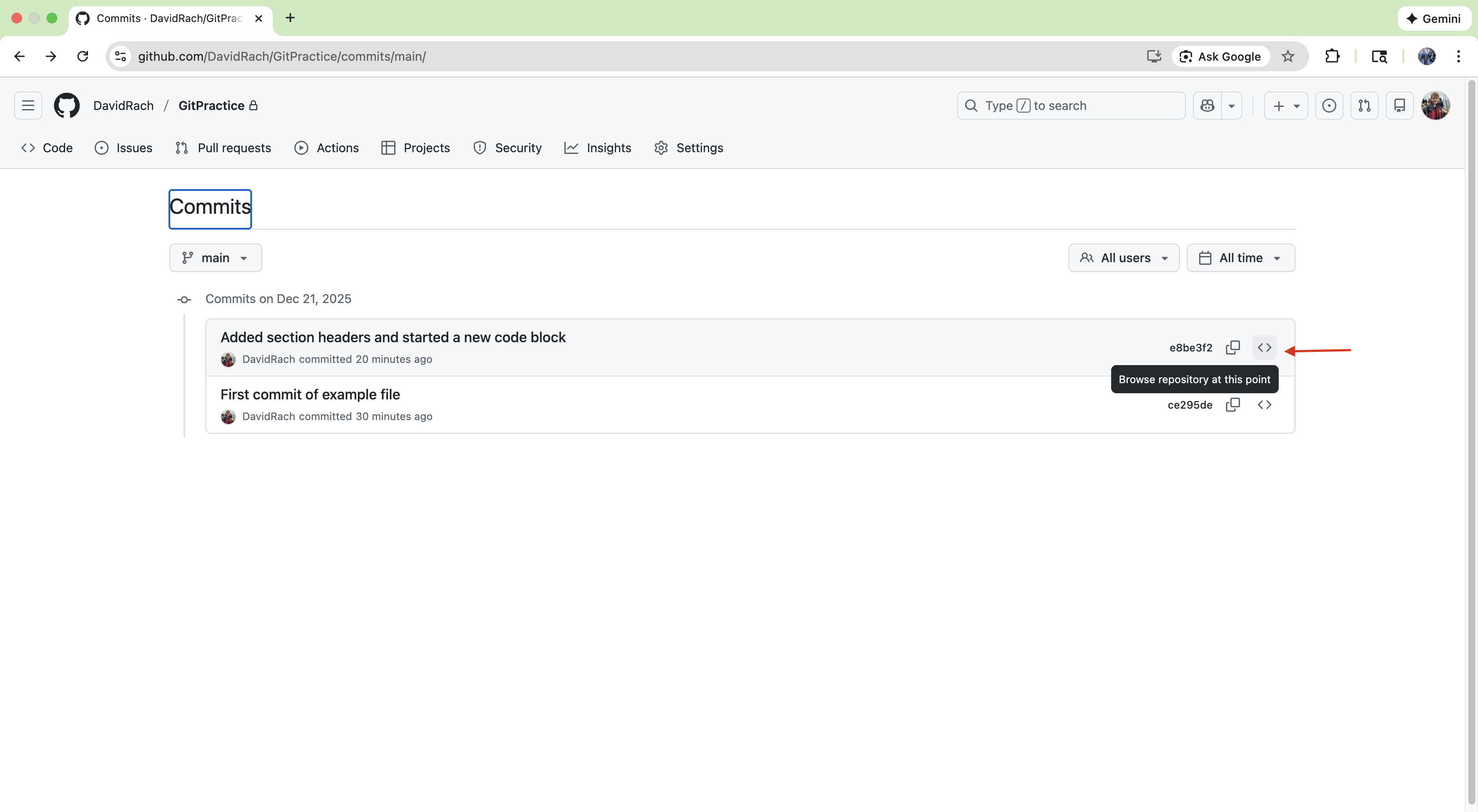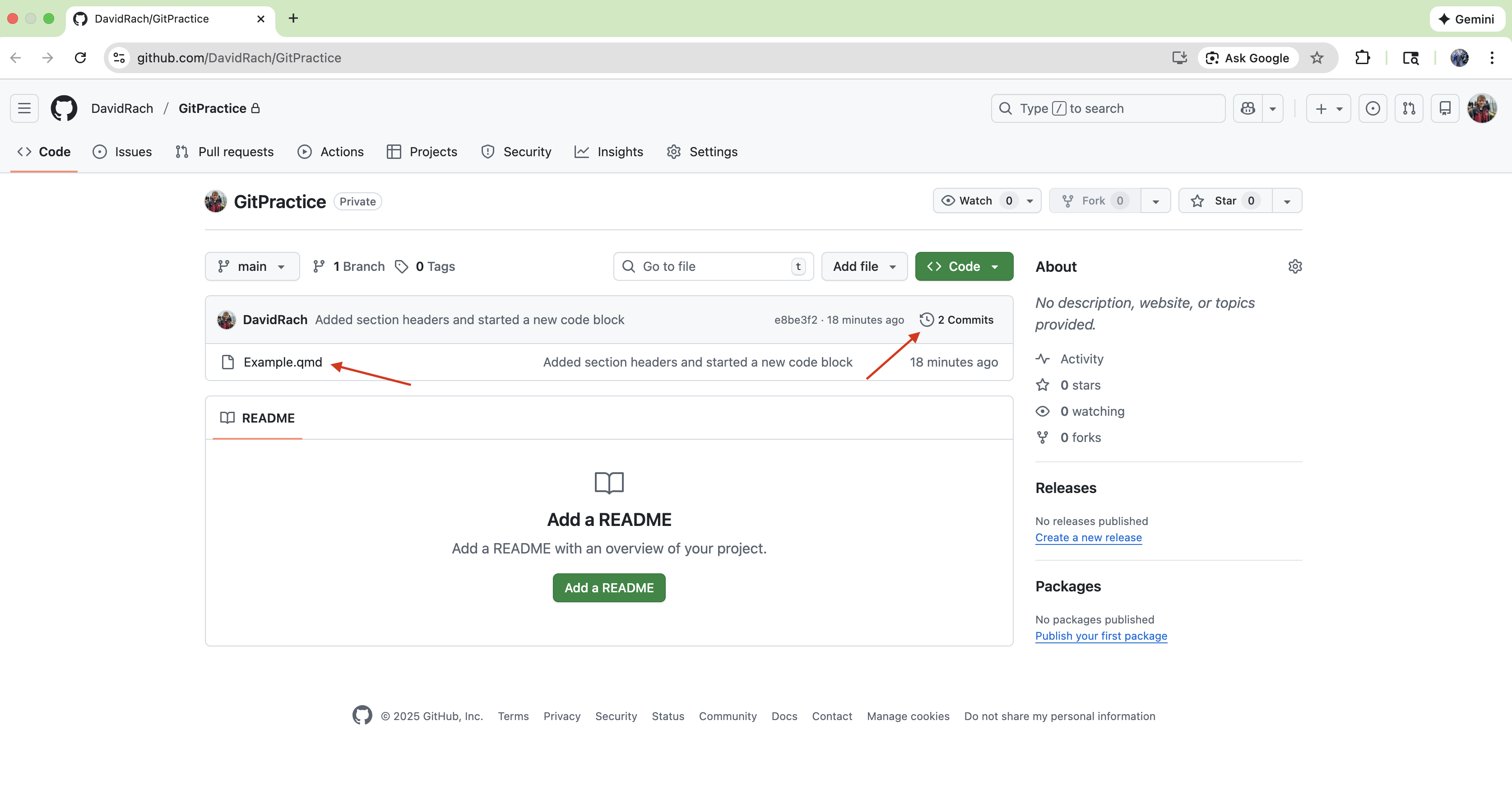 After the browser opens, you can see that the elements I had staged and committed within Positron are now present within the GitHub repository. Since I had only staged Example.qmd, it is the only file that was backed up. We can also see the commit history online by clicking on the commit clock.