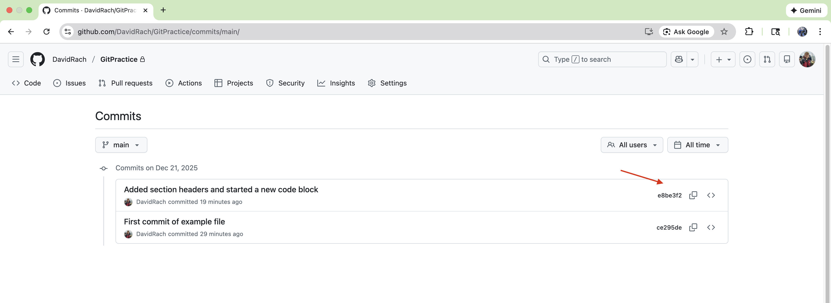 As we would expect, we only see our two commit messages. One important thing to note is the commit hash numbers, that denote a particular commit. If we decided to revert/fall back to a prior commit in the future, this would be the number we would need to provide to Git to return to that previous commit/save-state