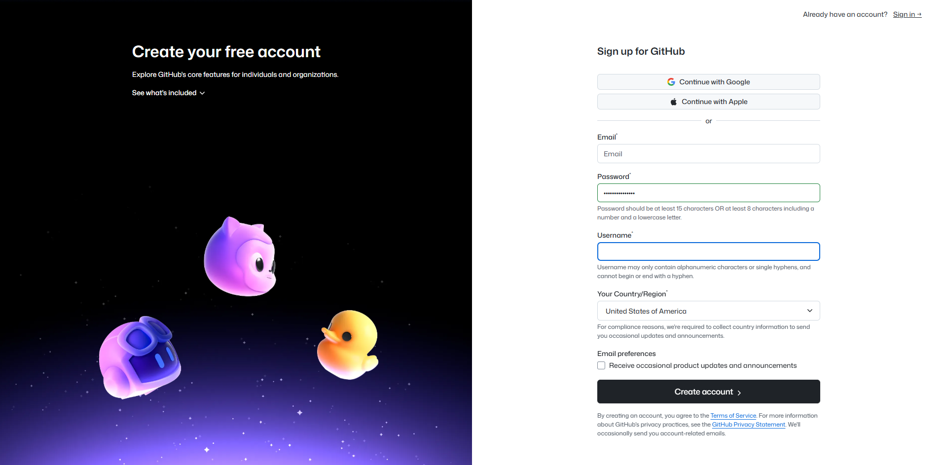 On the sign-up page, you will fill in various details needed to create an account. Please remember that GitHub usernames are visible to others. Additionally, if you end up sharing code with others as part of a manuscript, or use GitHub to create a personal portfolio website in the future, your username will appear as part of the URL.