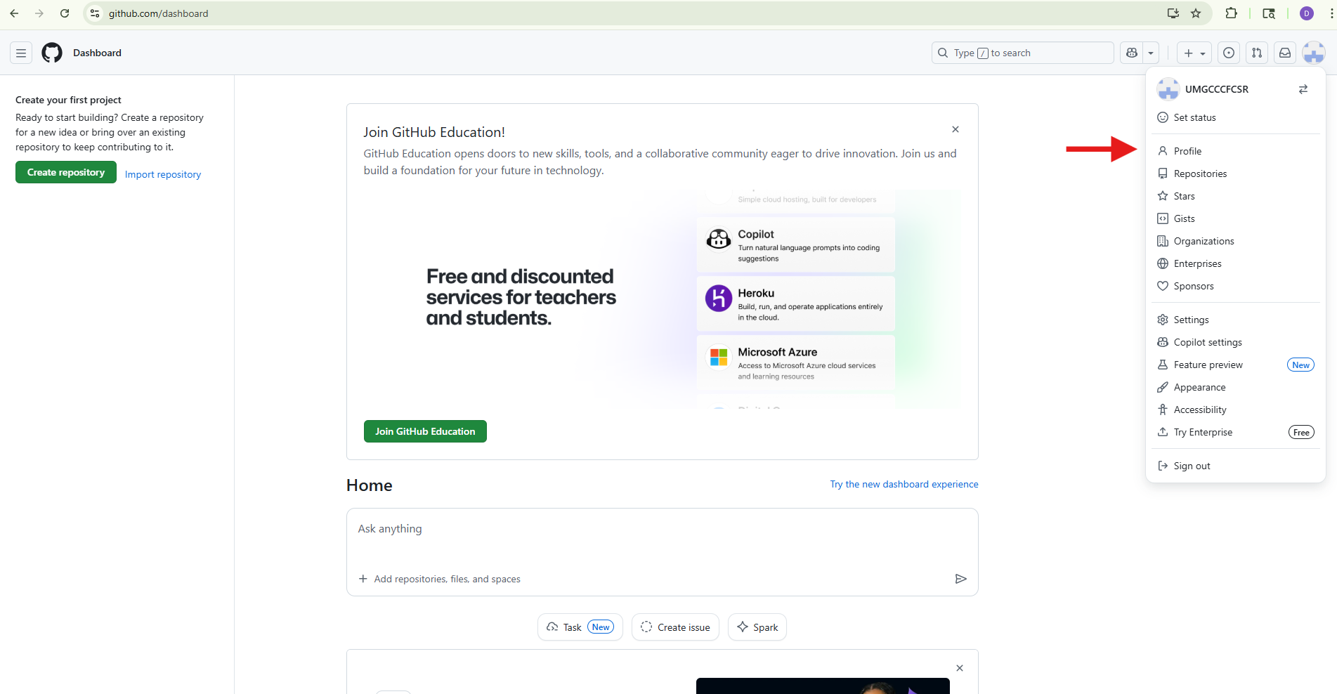 To see projects that you have starred, you can select the Stars option from the same dropdown you used to get to Settings.
