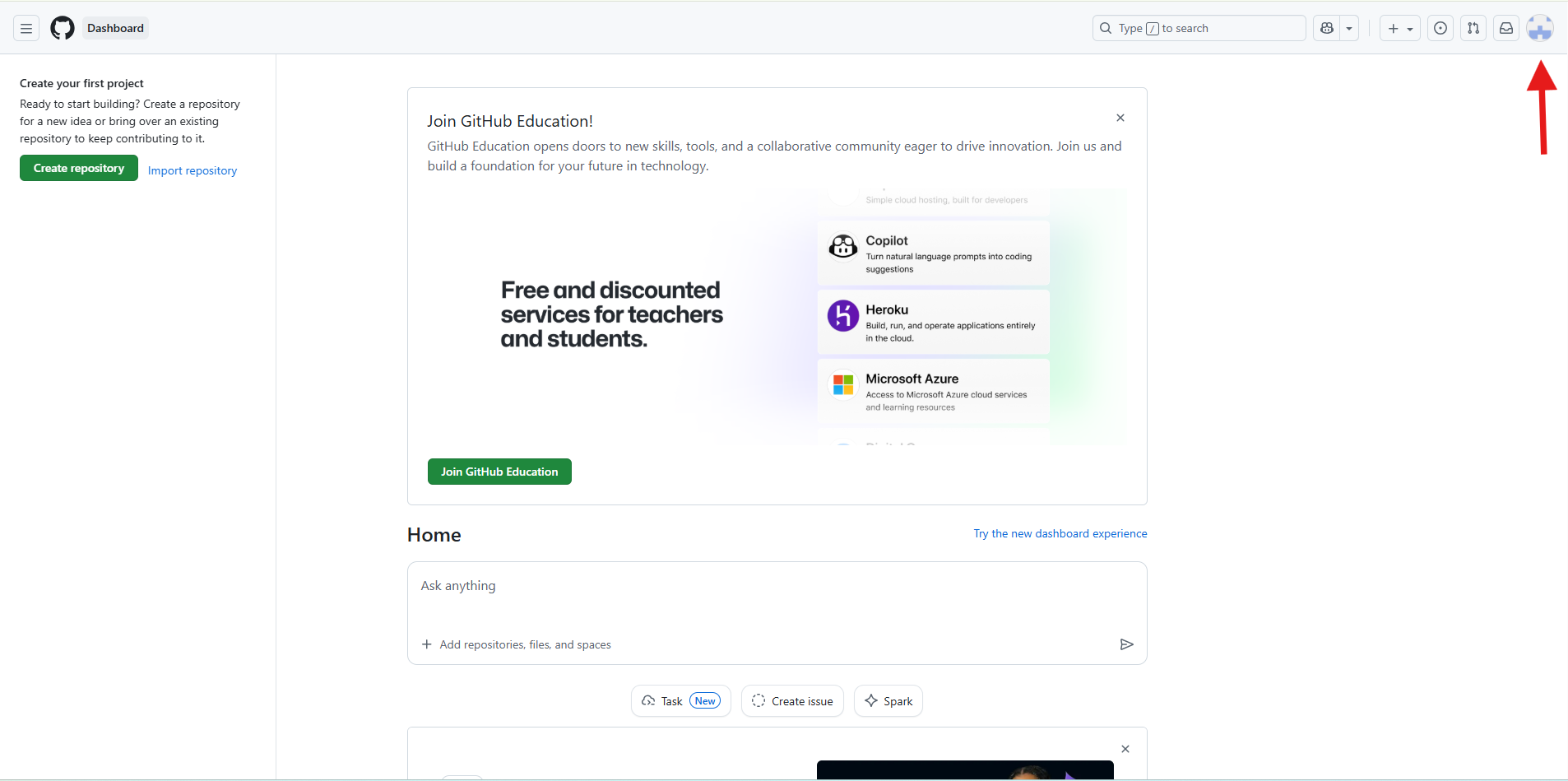 To create a ReadMe page for your profile, we will navigate to the upper right of the screen and click on the + sign.