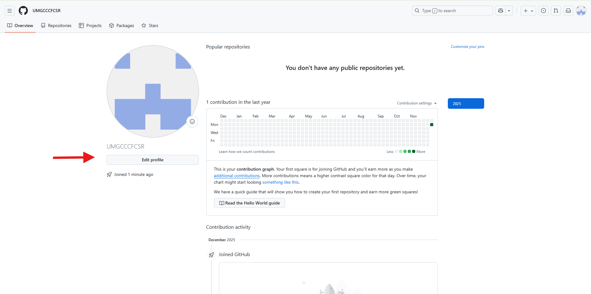 At the top of the profile, you will see a “Your contributions” calendar graph. For a new account, it will look like this: