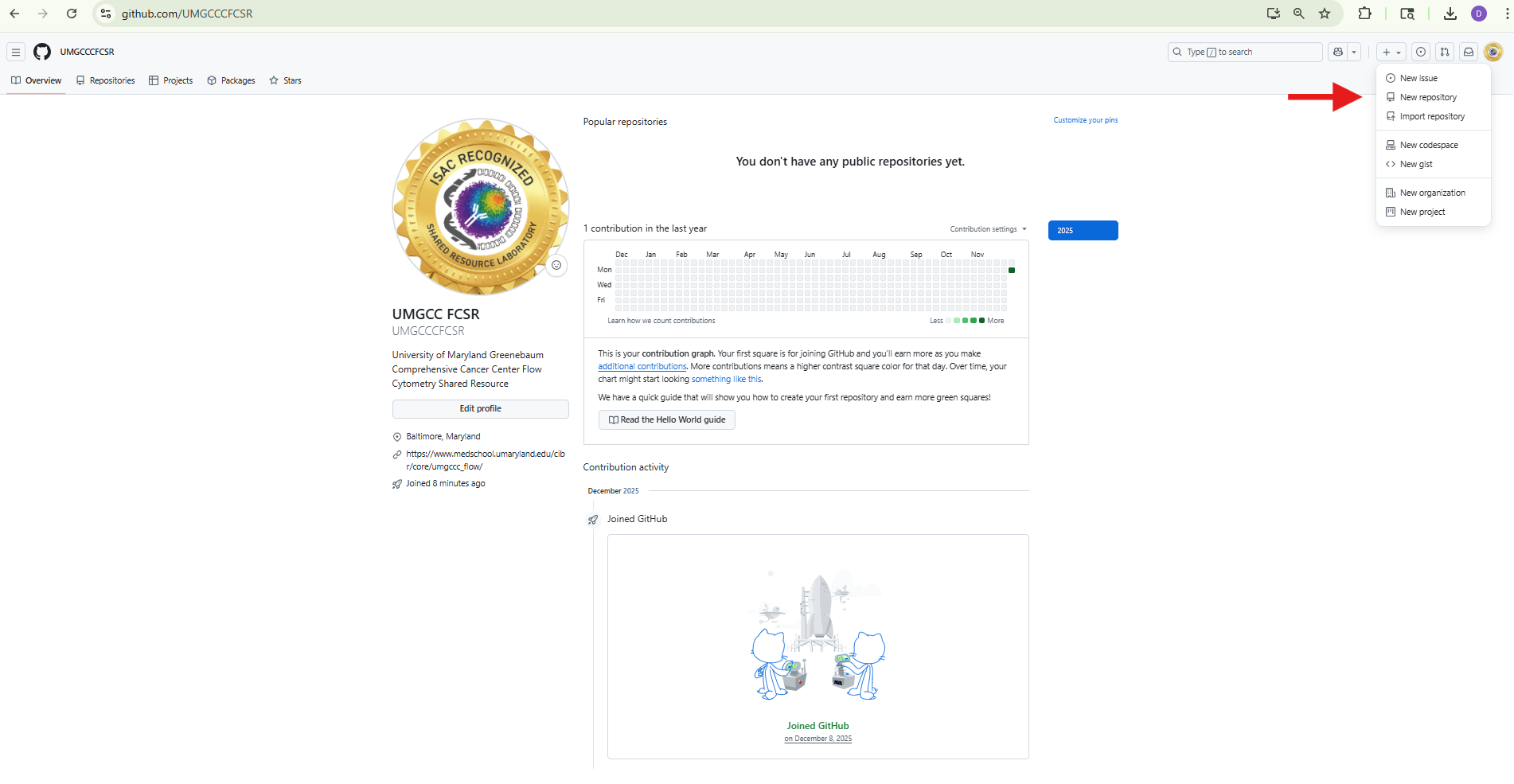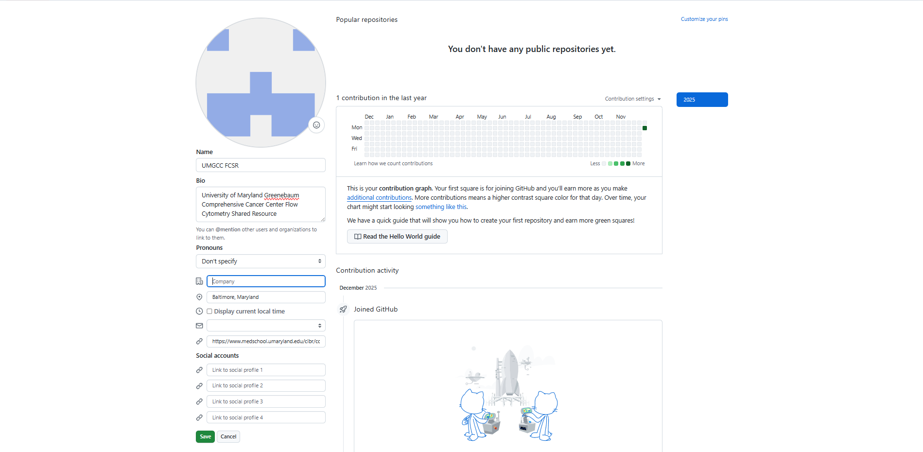 On the profile page, you will be able to see our version of the README, our repositories, and the Contributions graph and Contribution activity sections.