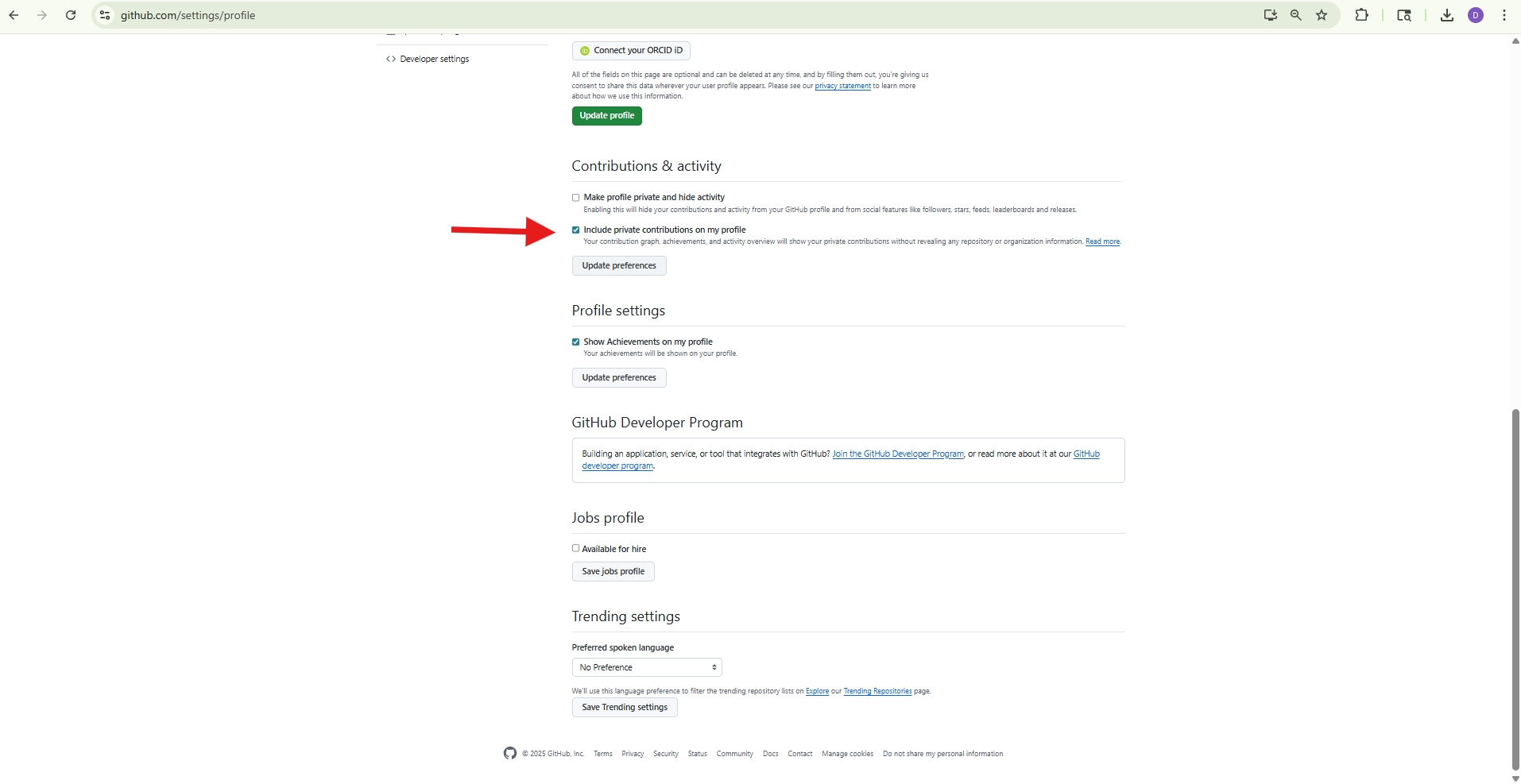 When you reach Contributions and Activity, go ahead and select the option to include private repositories in the activity summary graphic. Then scroll down and click save. You will now be returned to your GitHub profile page.