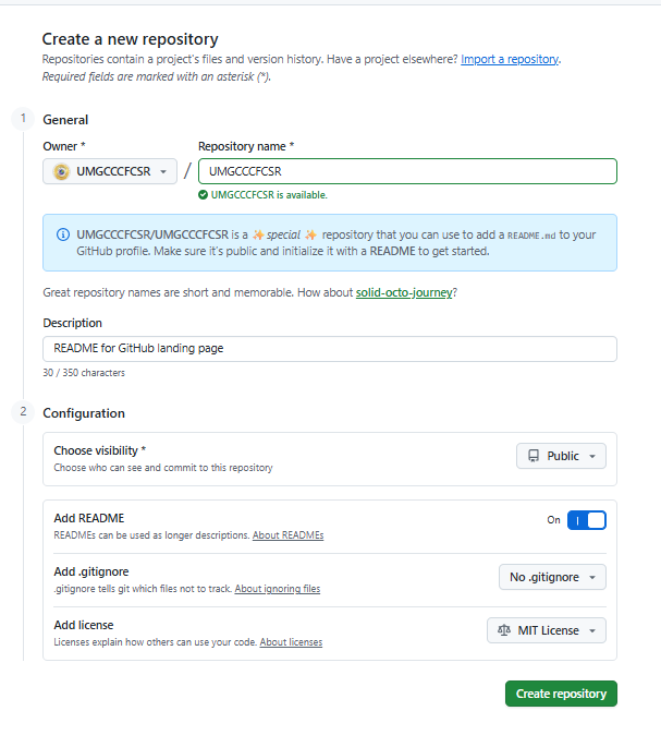 You will next create a repository (folder), naming it exactly the same as your username. This will be recognized by GitHub as being a special type of repository corresponding to the ReadMe section of your profile.