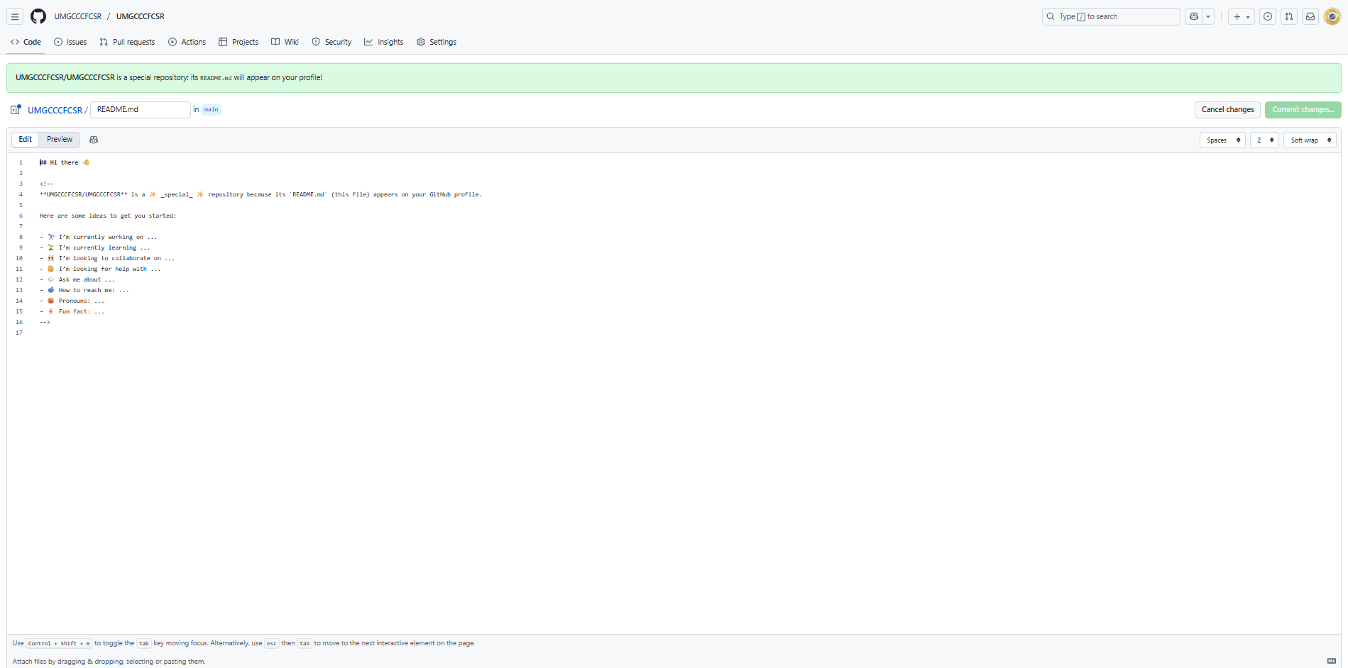 Next, to save you will select the green “Commit changes” button. We will cover the meaning of “Commit” more in-depth during the Git section.