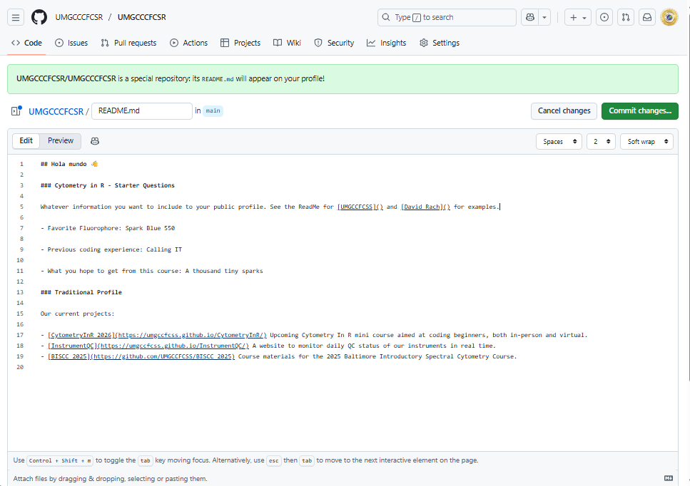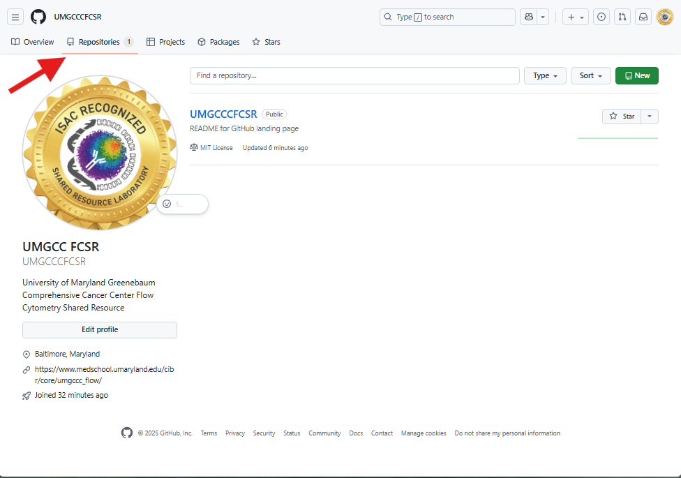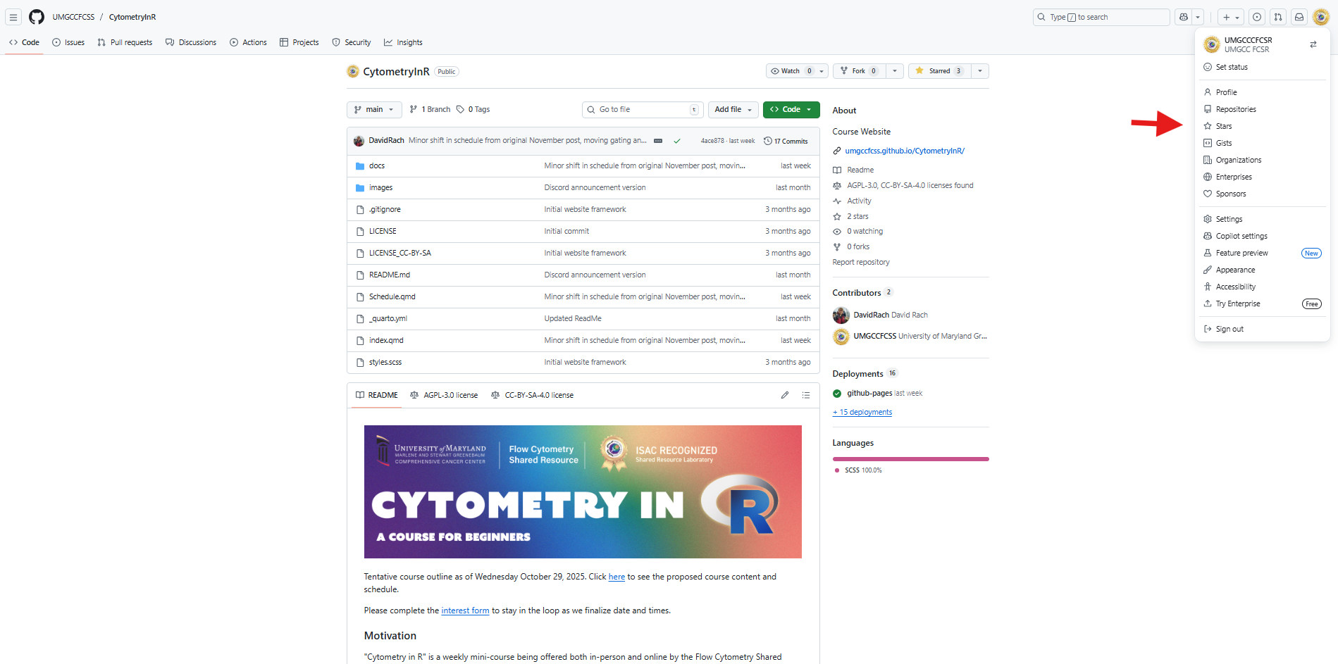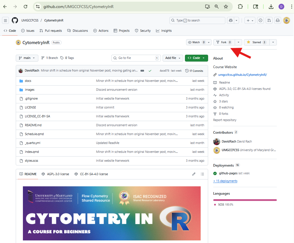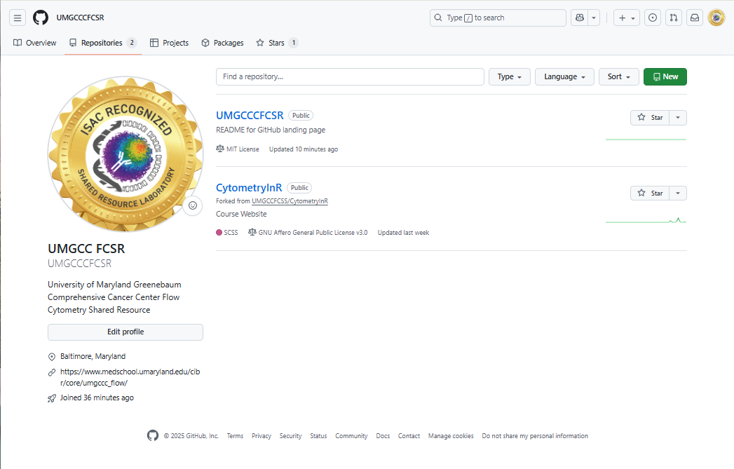 For example, in my case, my user name is DavidRach, so my GitHub profile ends up as: https://github.com/DavidRach. For our course, the core’s GitHub user name is UMGCCCFCSR, so the github profile ends up as https://github.com/UMGCCCFCSR, while the course website ends up as https://umgcccfcsr.github.io/CytometryInR/