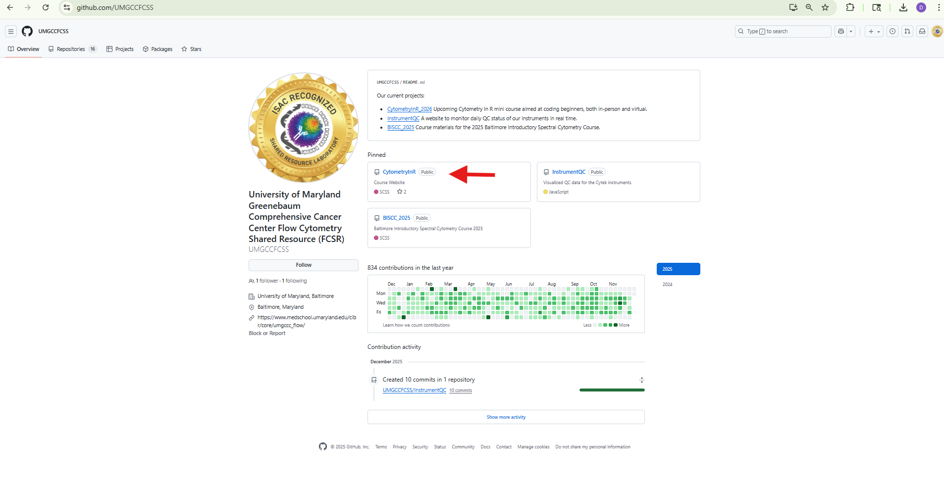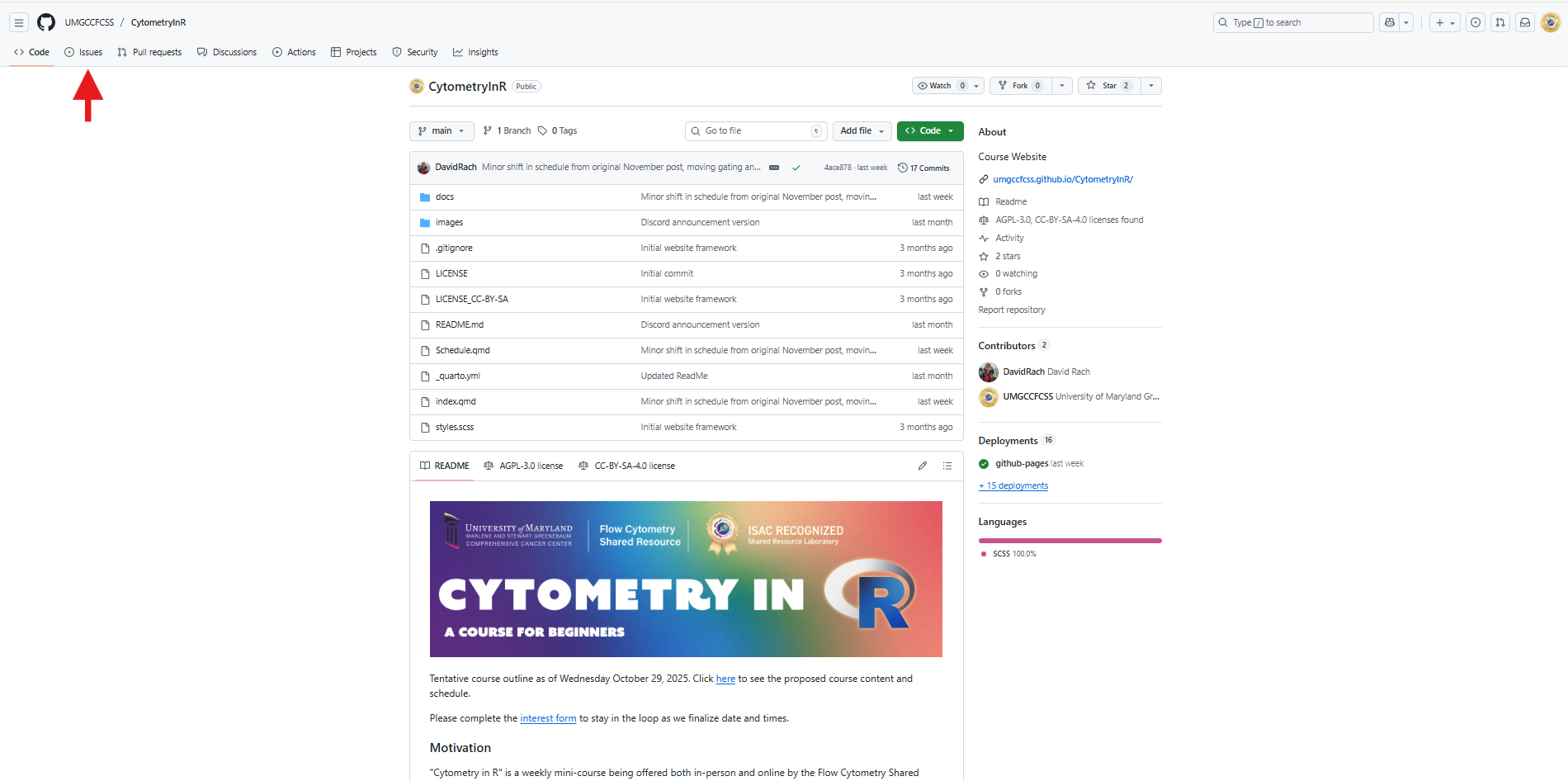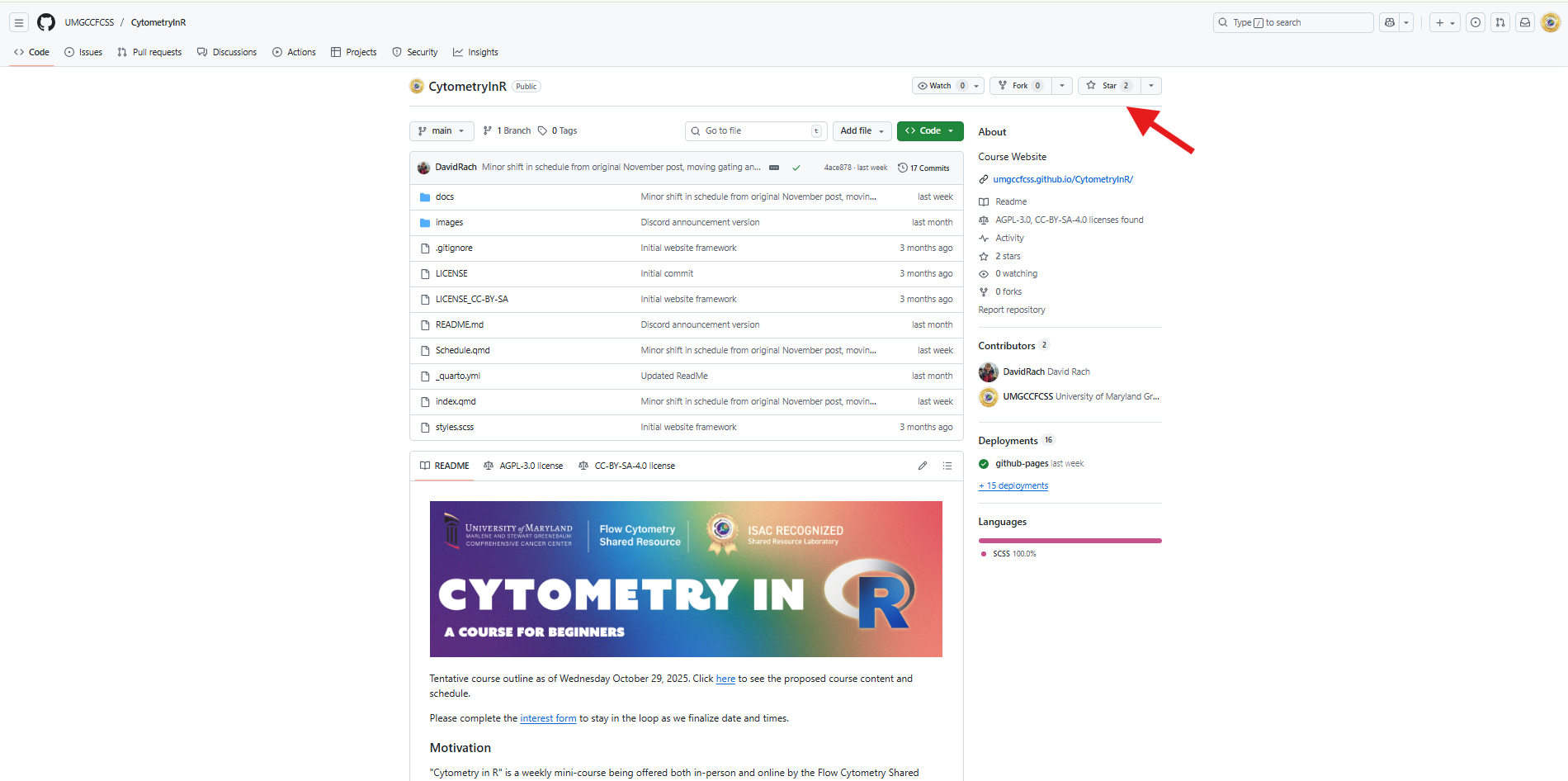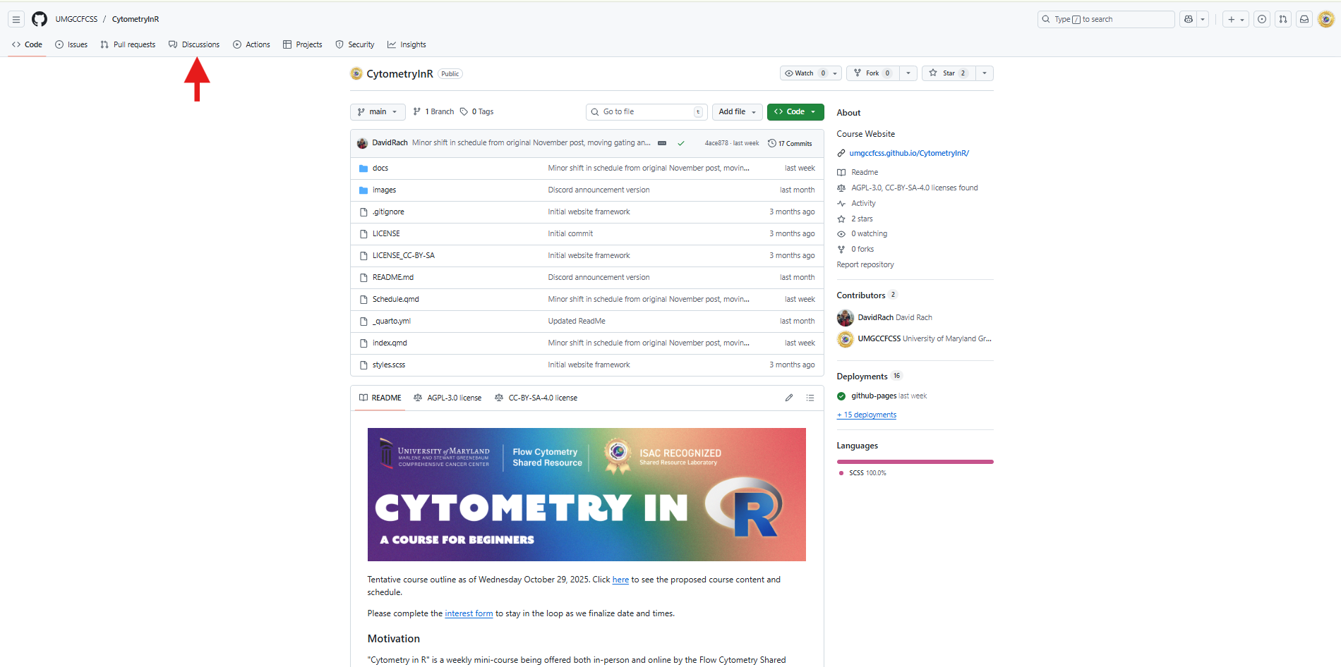 For example, in my case, my user name is DavidRach, so my GitHub profile ends up as: https://github.com/DavidRach. For our course, the core’s GitHub user name is UMGCCCFCSR, so the github profile ends up as https://github.com/UMGCCCFCSR, while the course website ends up as https://umgcccfcsr.github.io/CytometryInR/