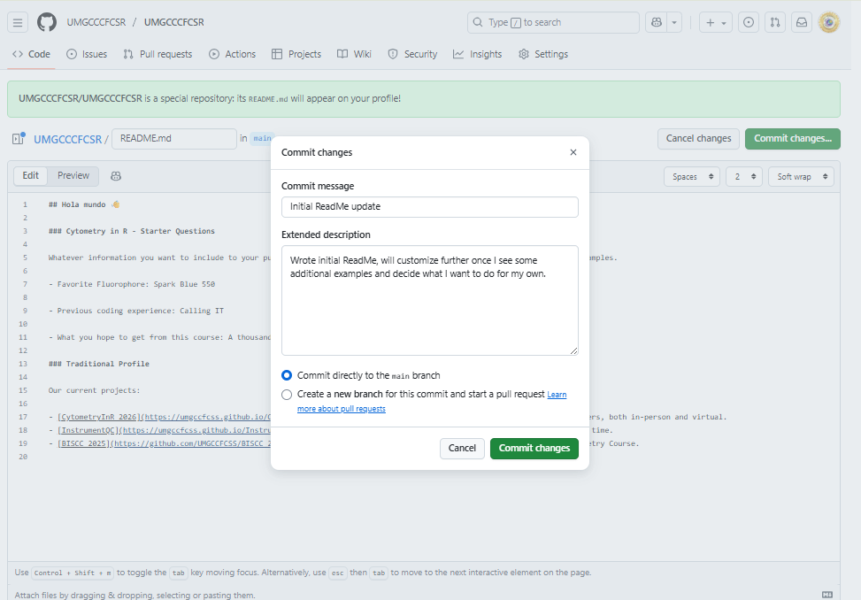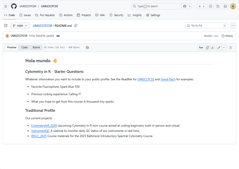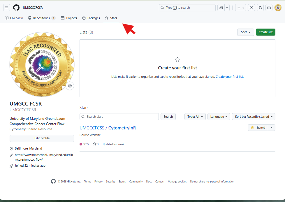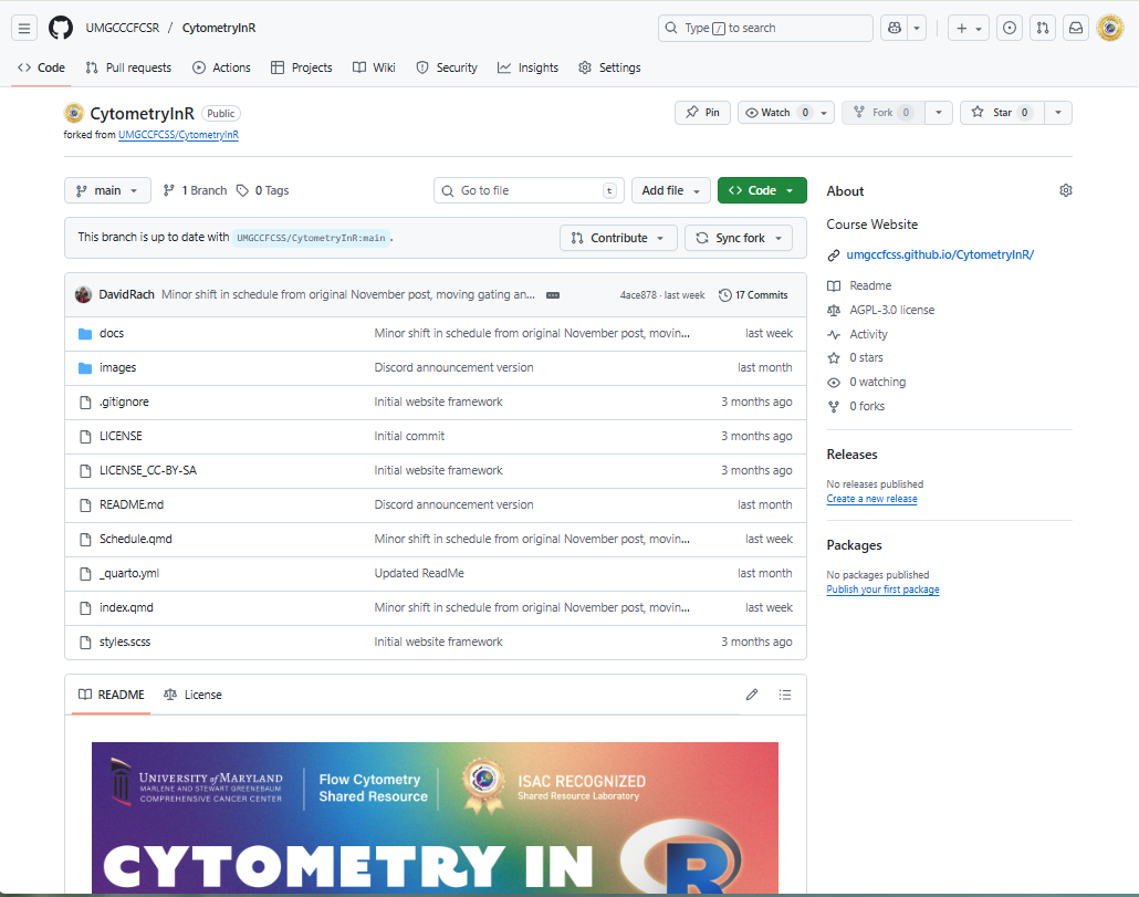 We have now completed our walk-through of setting up a GitHub account. At this point, you should have modified your GitHub profile, added a README section, and most importantly, forked the CytometryInR repository so that you can easily retrieve the new course materials each week.
