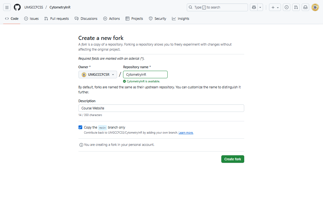 For this course, when you create the fork, keep the existing repository name (“CytometryInR”). Importantly, select the copy main branch option. This will ensure you only get the code and data needed for the course copied over, and don’t end up with your entire hard-drive filled will website elements, or other people’s solutions to the take-home problems.