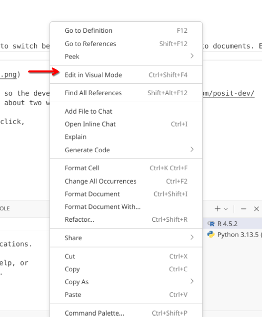 However, we can also switch to Visual mode (by right clicking and selecting Edit Visual Mode) which will visualize it in a similar manner as if we had rendered the document as an .html webpage.