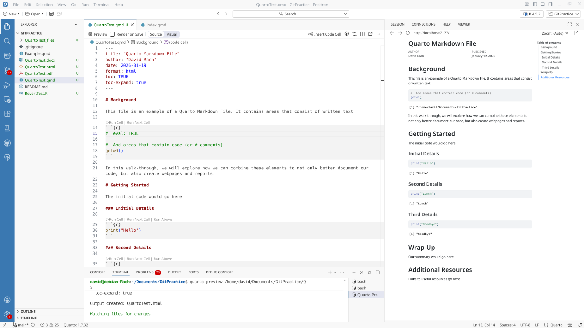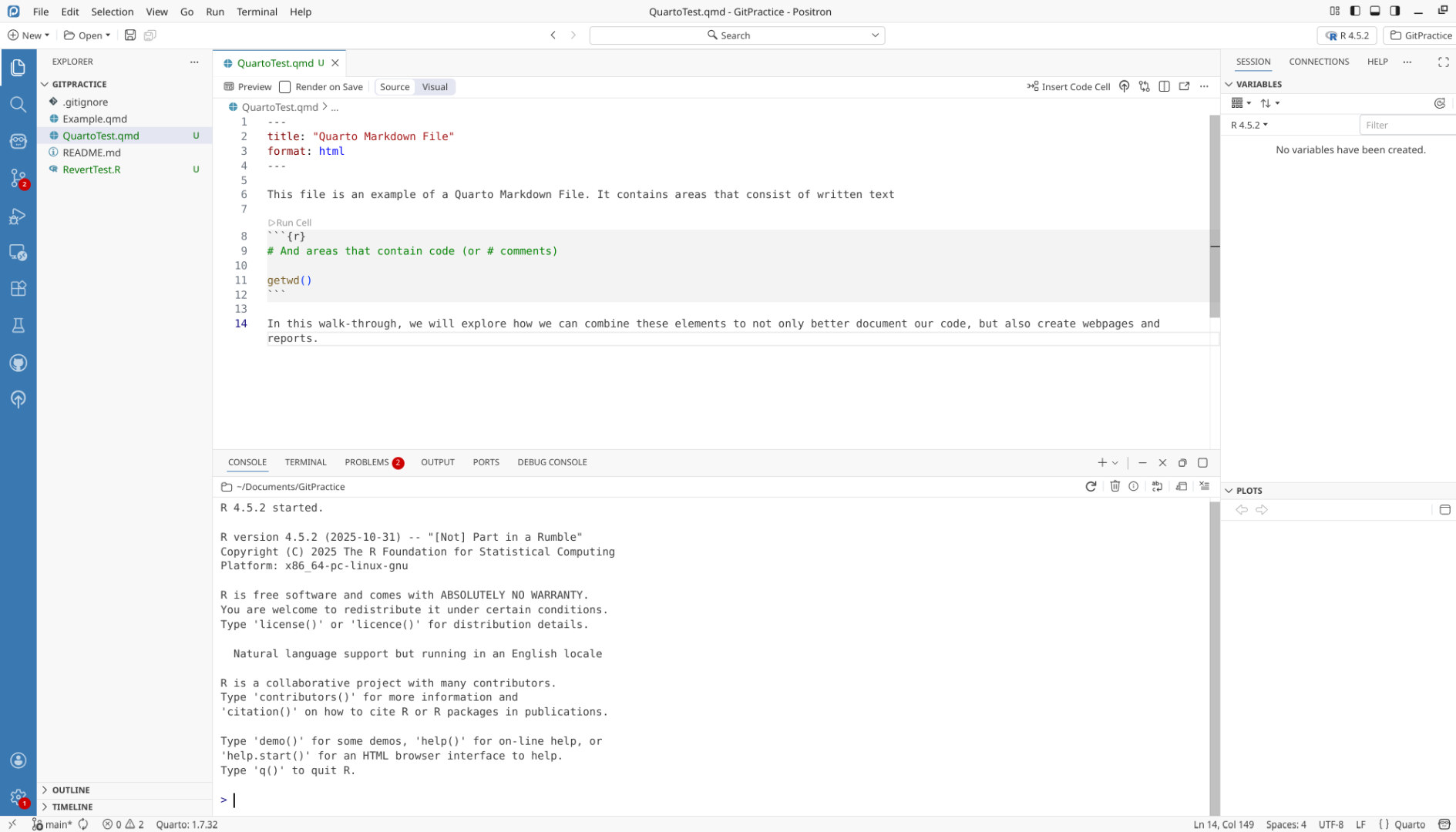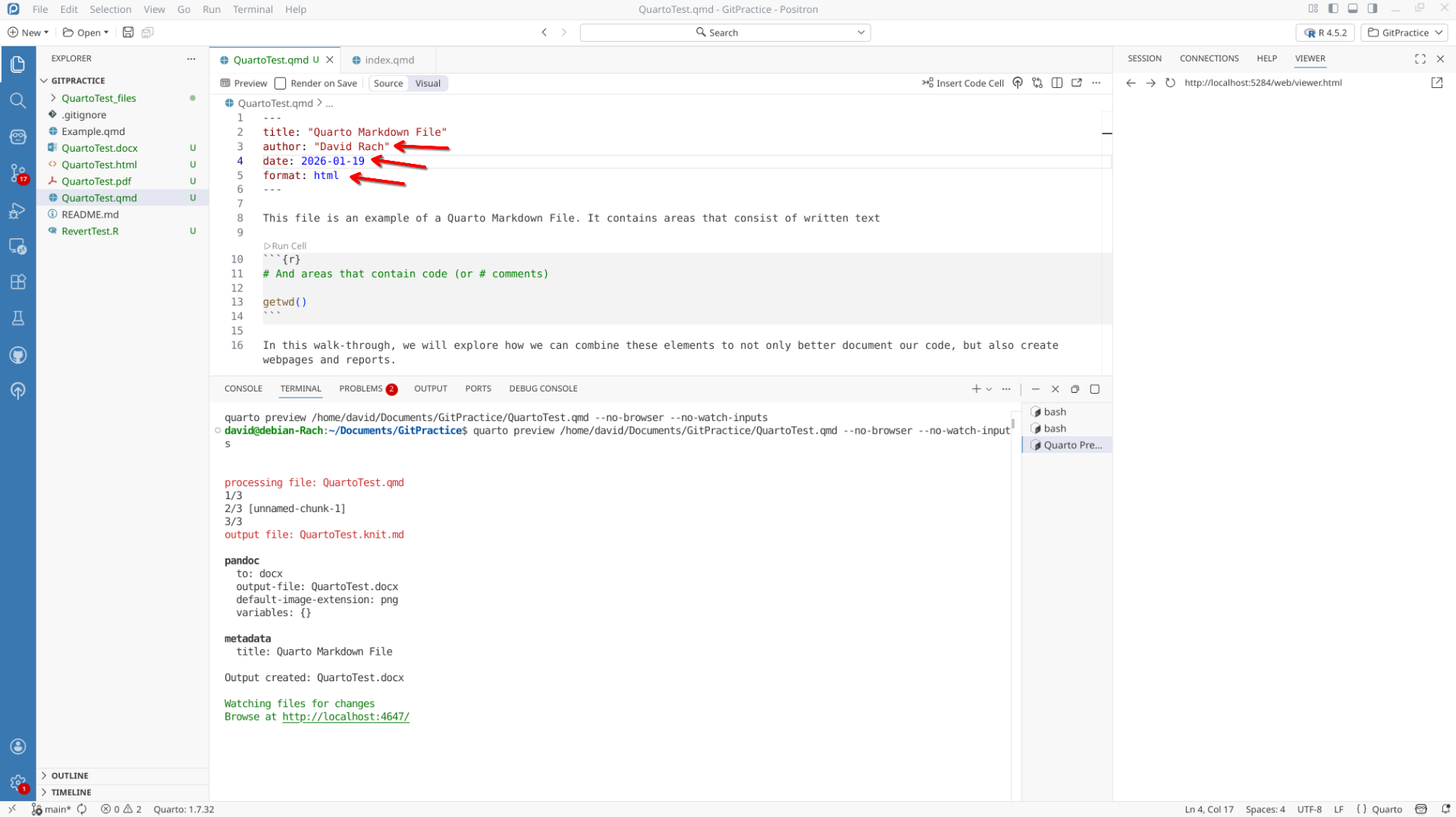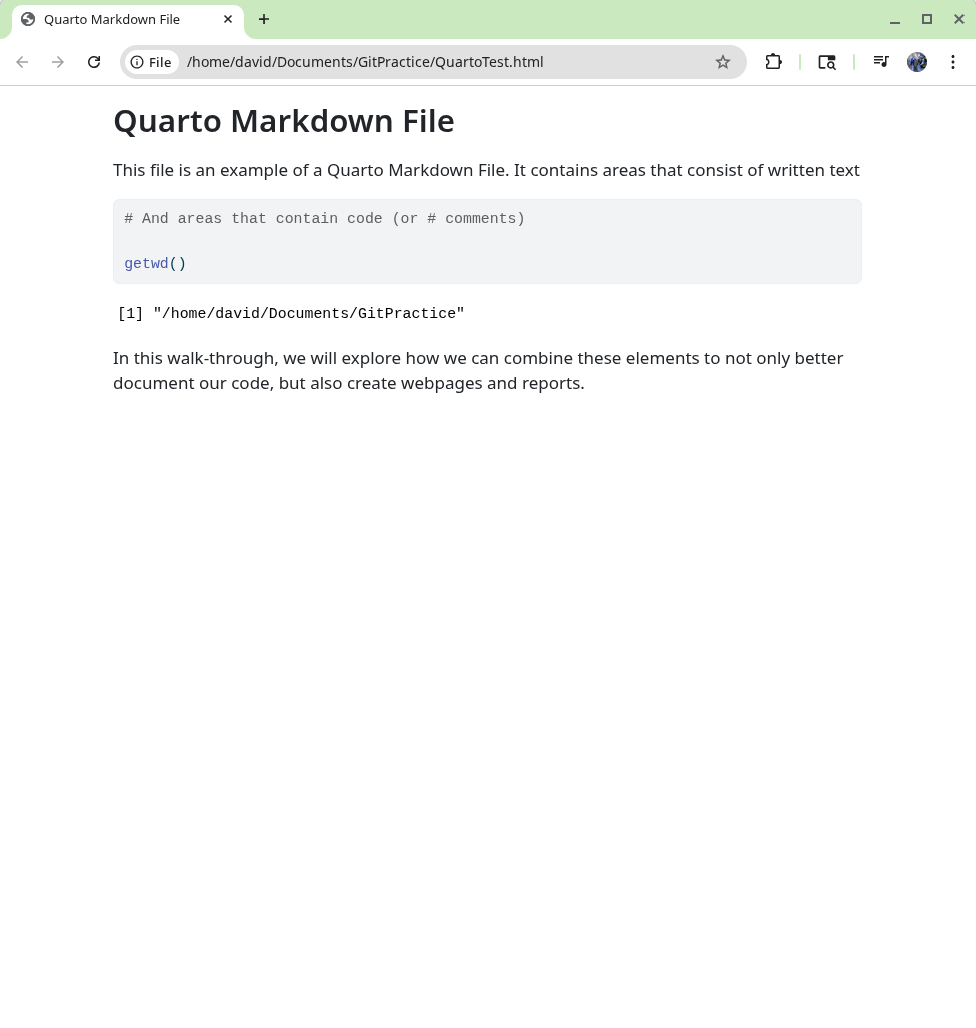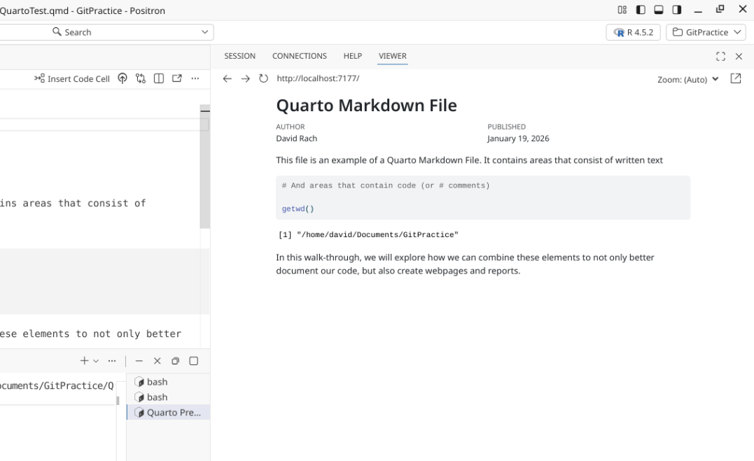 We will start off by creating a a new .QMD document within our GitPractice repository. As we saw in the previous section, the basic elements include:
