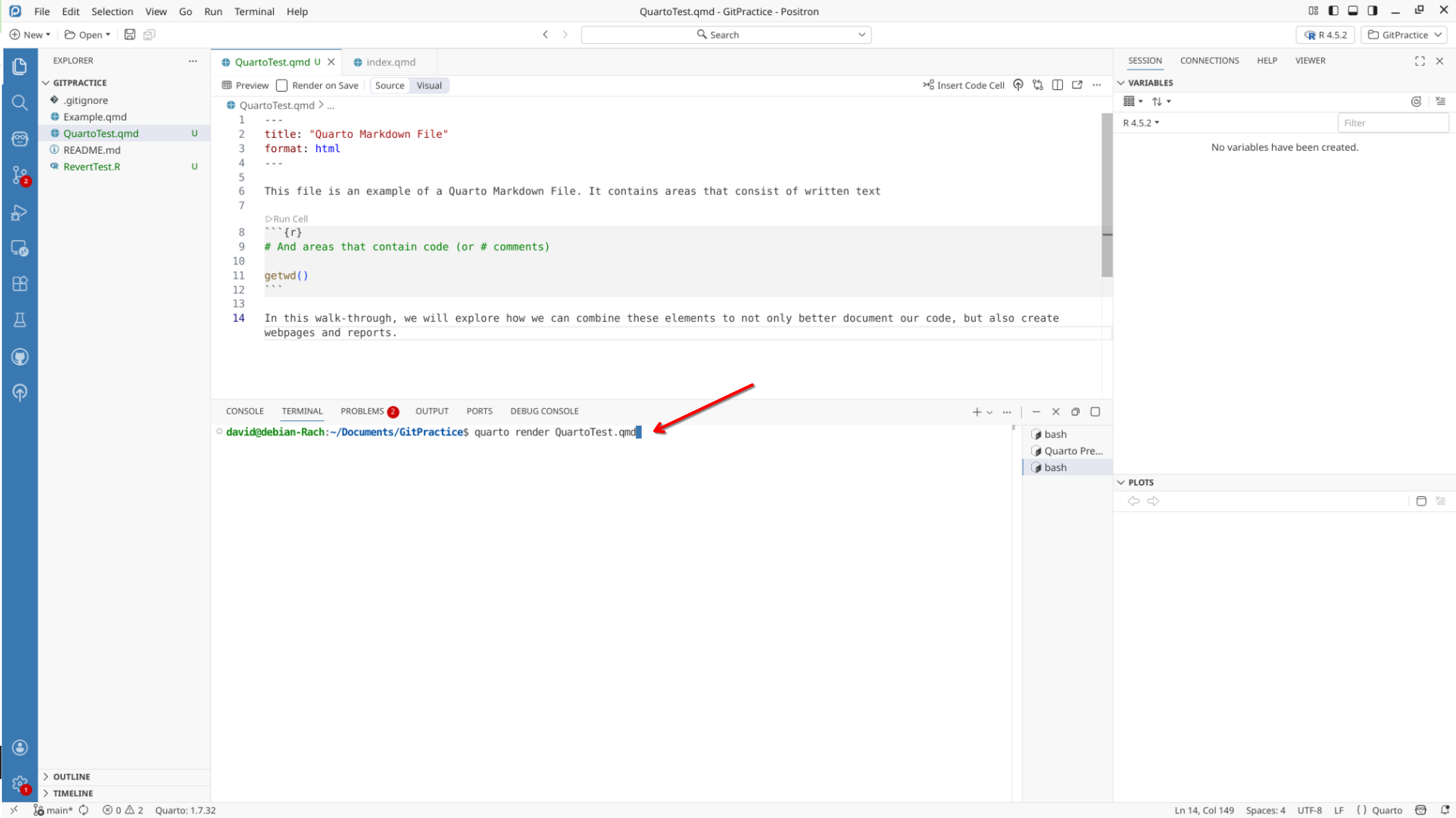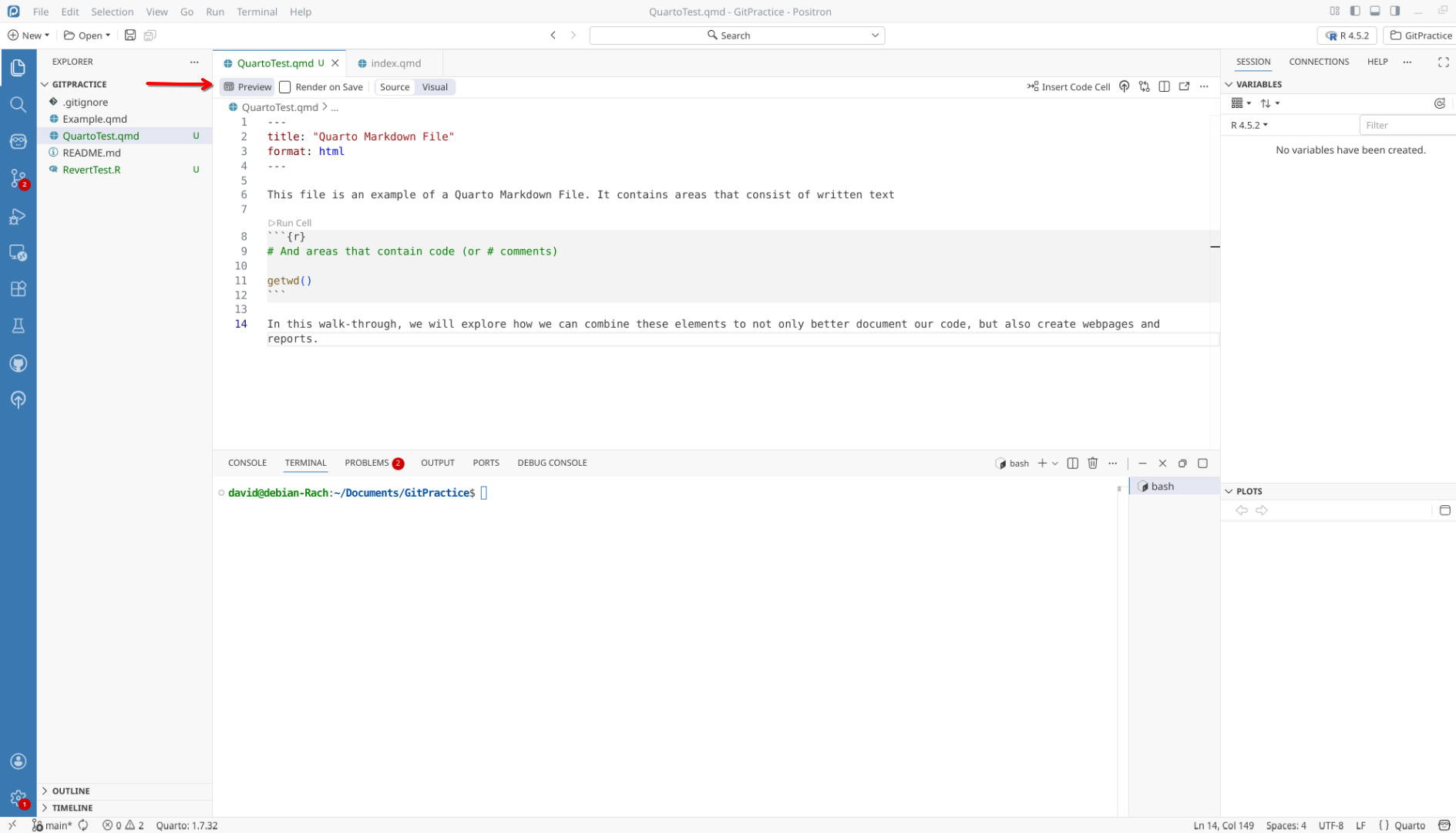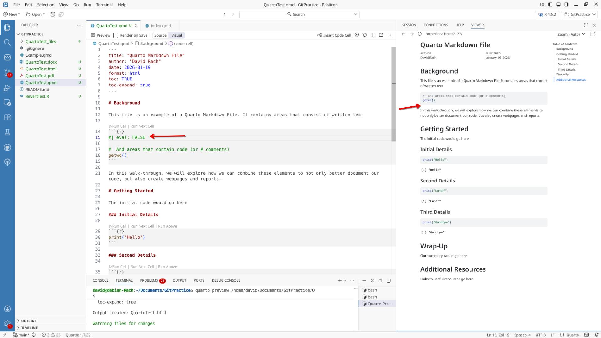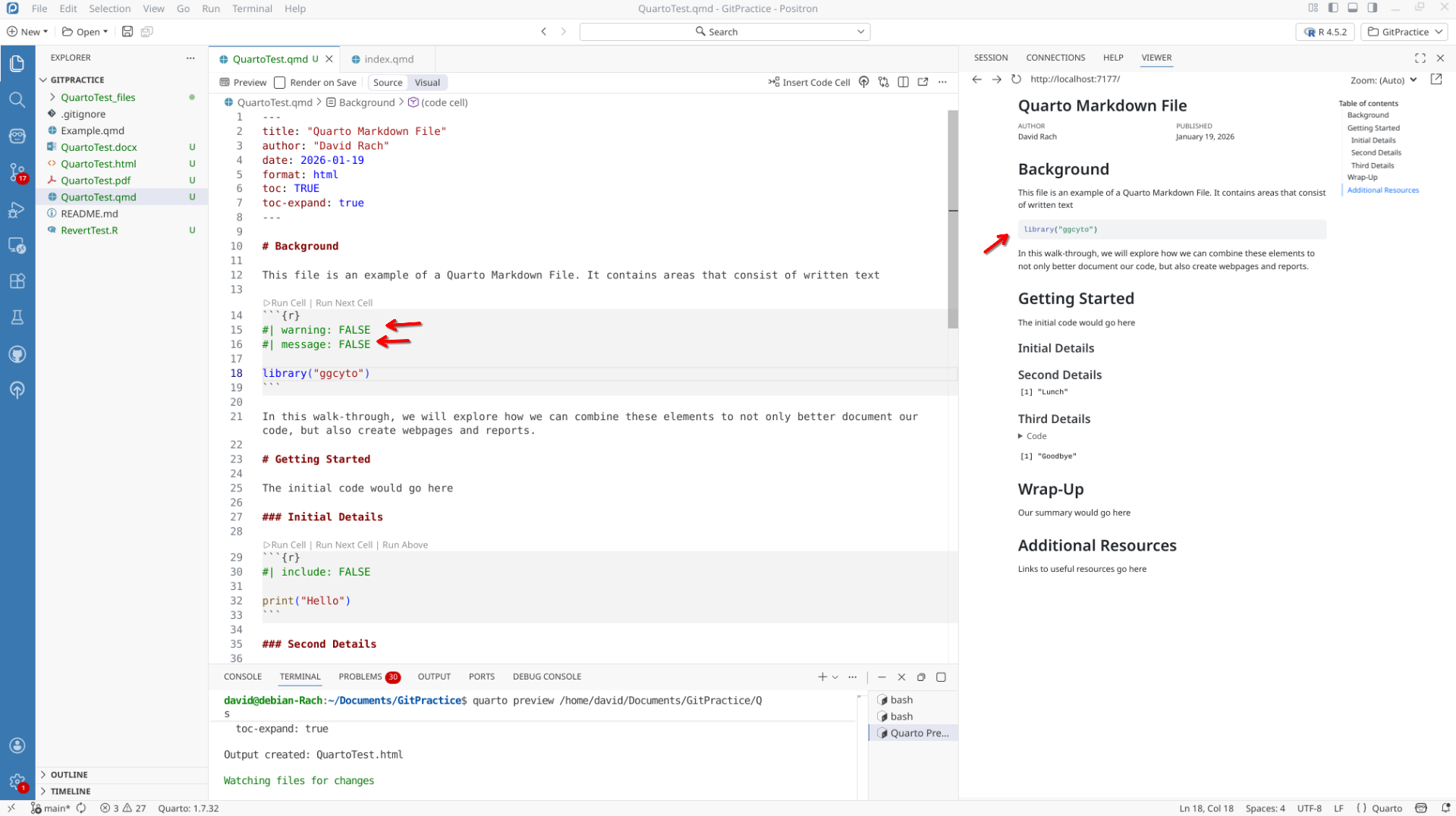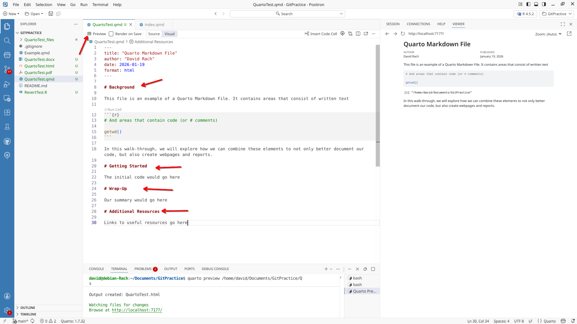 We will start off by creating a a new .QMD document within our GitPractice repository. As we saw in the previous section, the basic elements include: