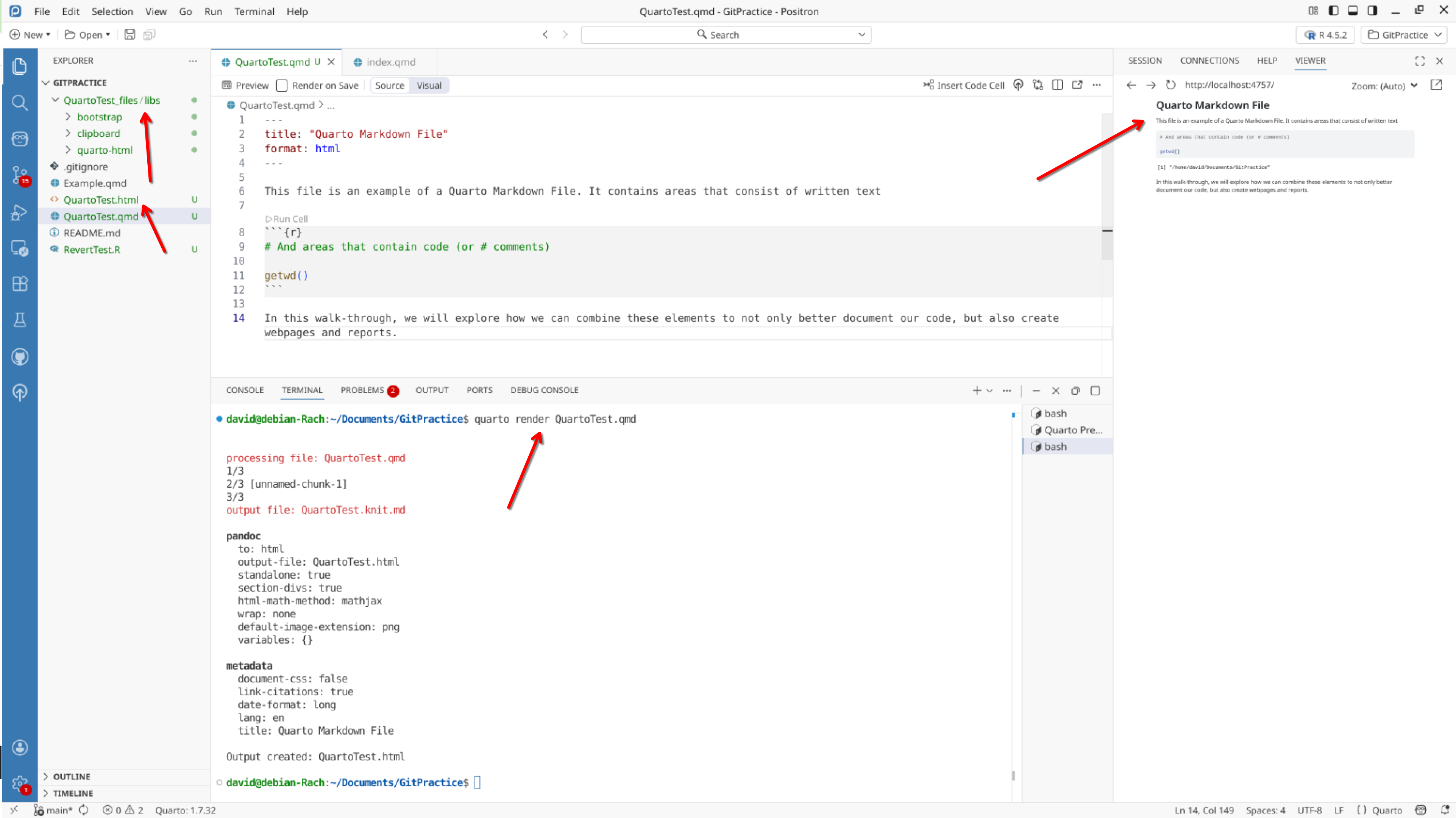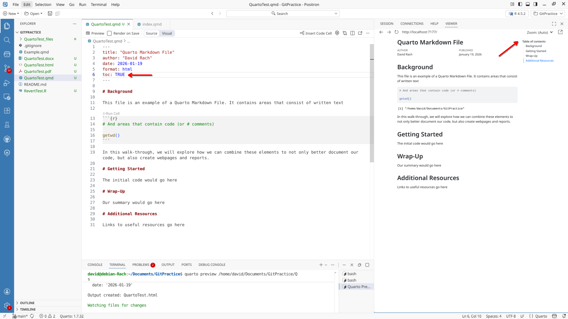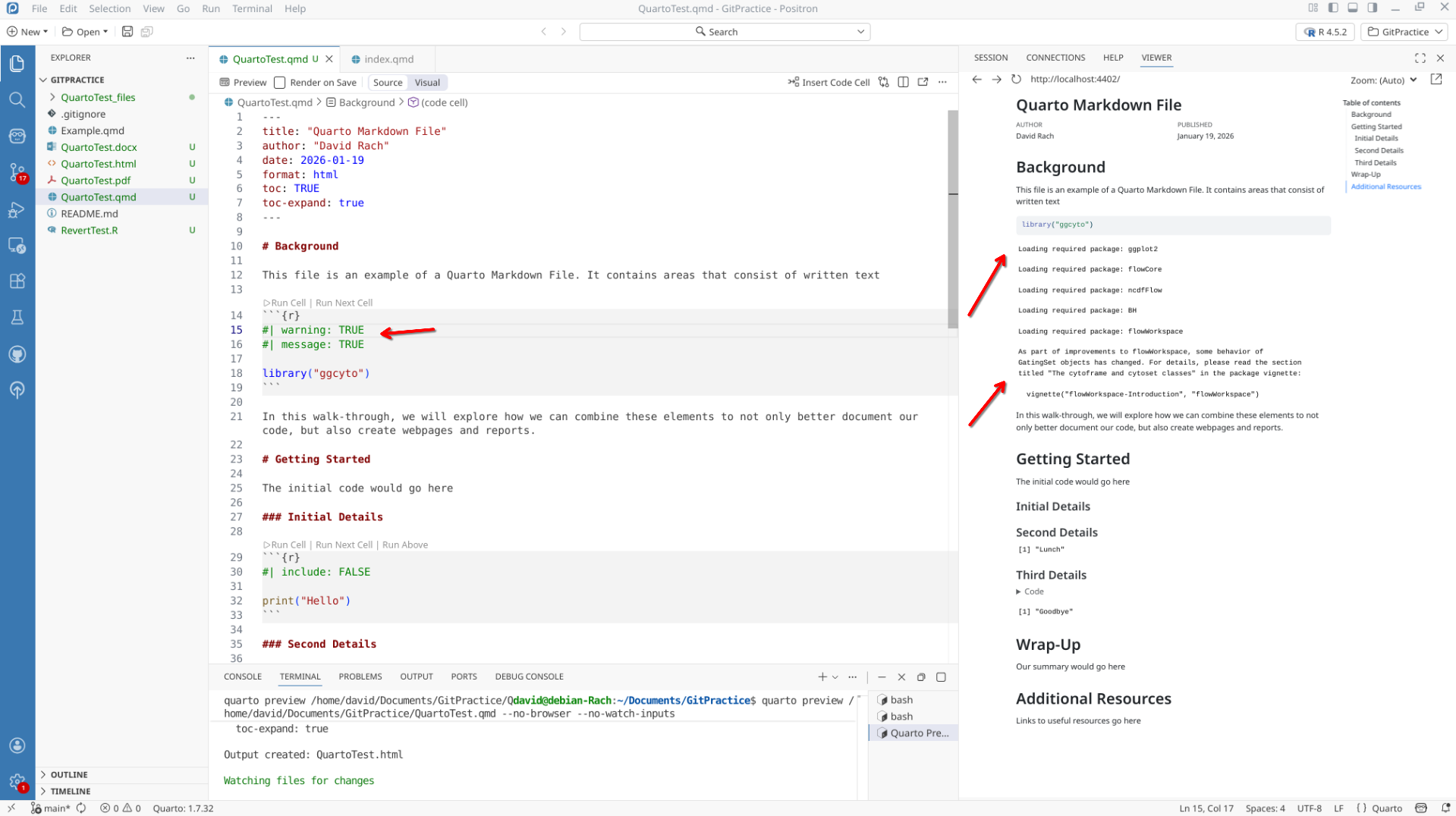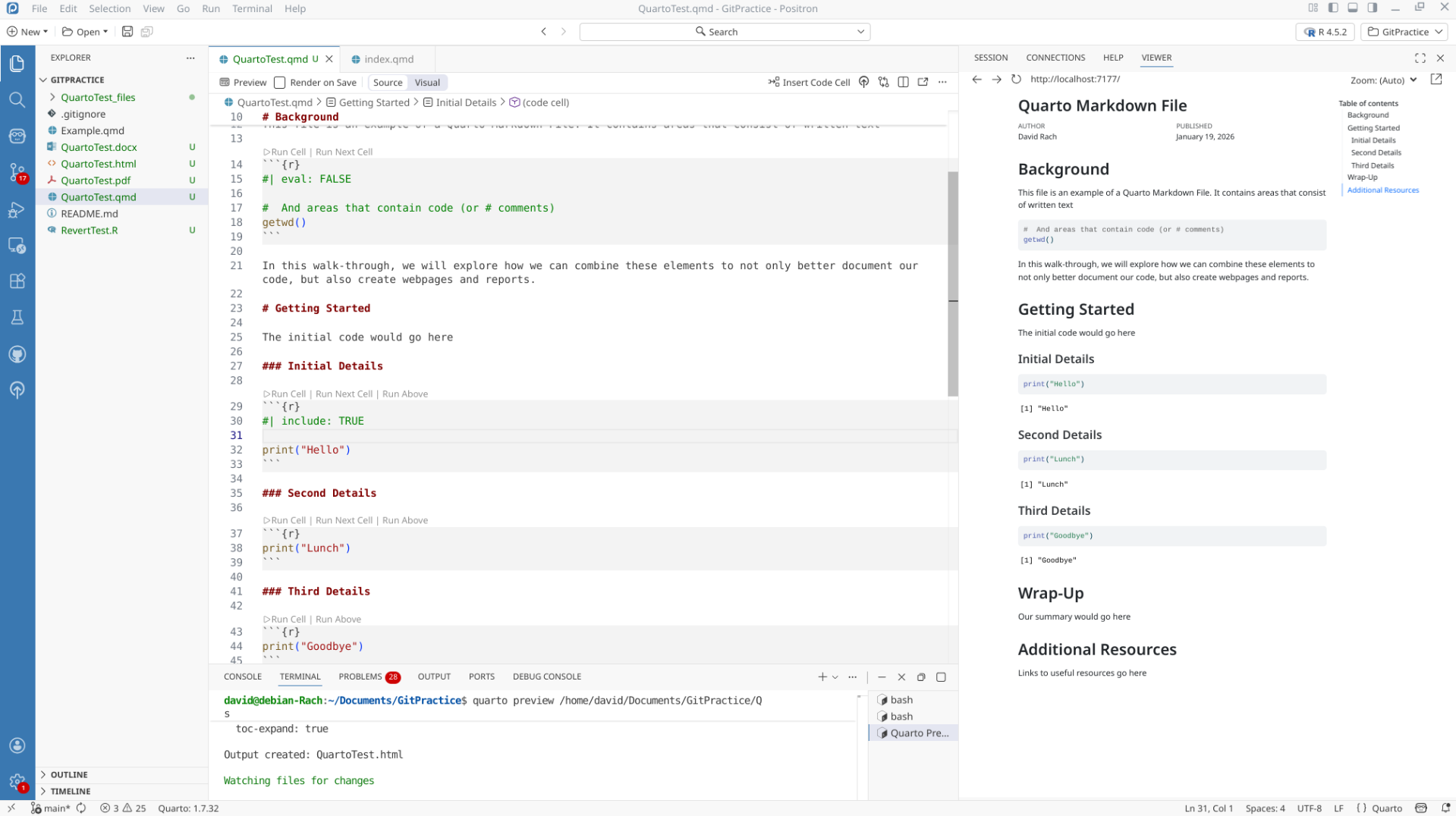 We will start off by creating a a new .QMD document within our GitPractice repository. As we saw in the previous section, the basic elements include: