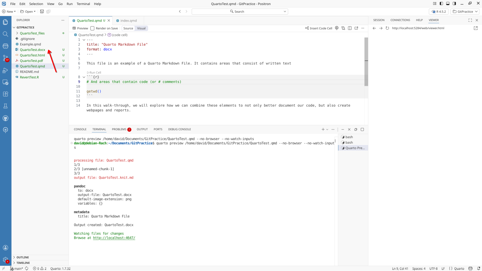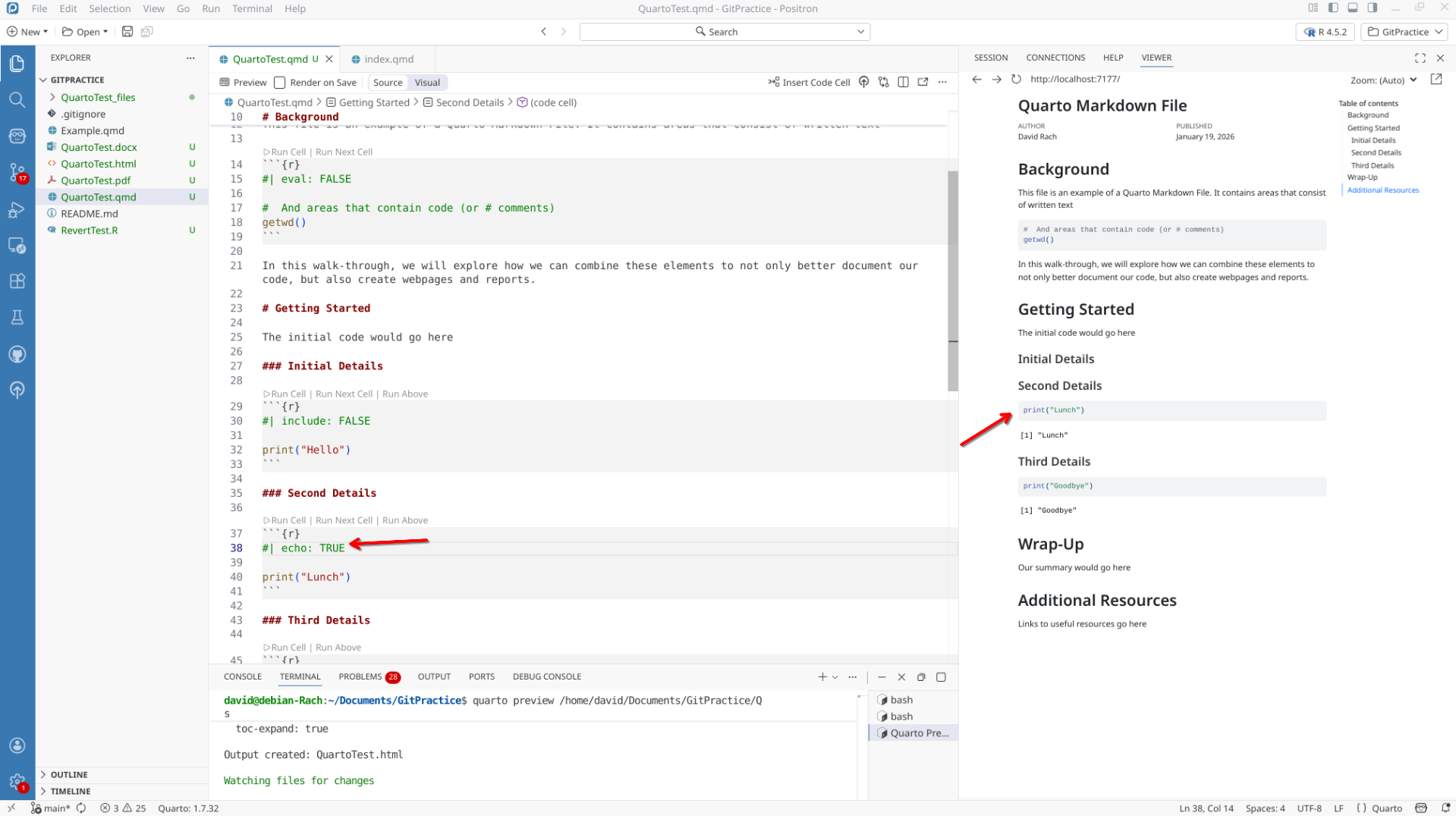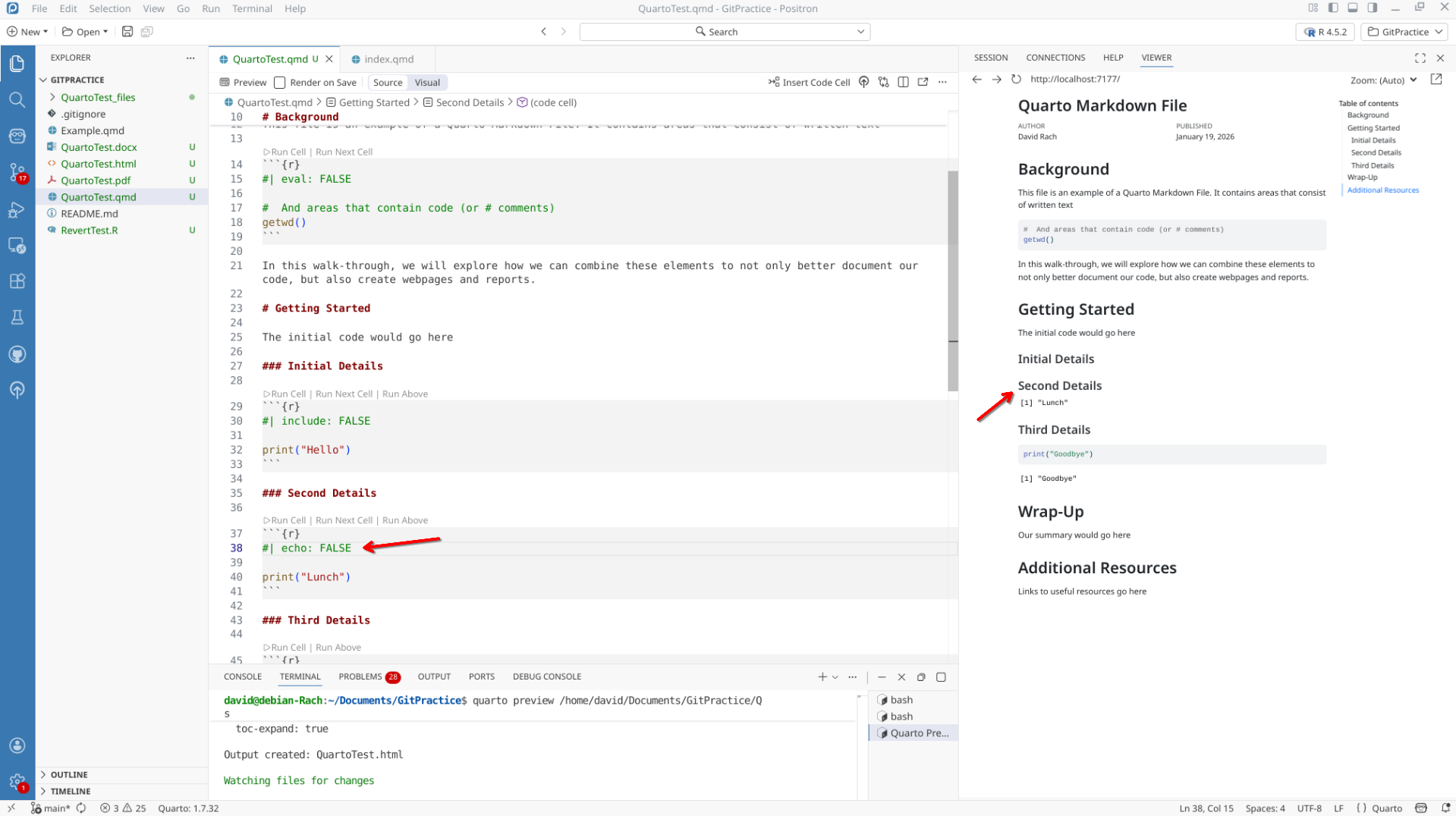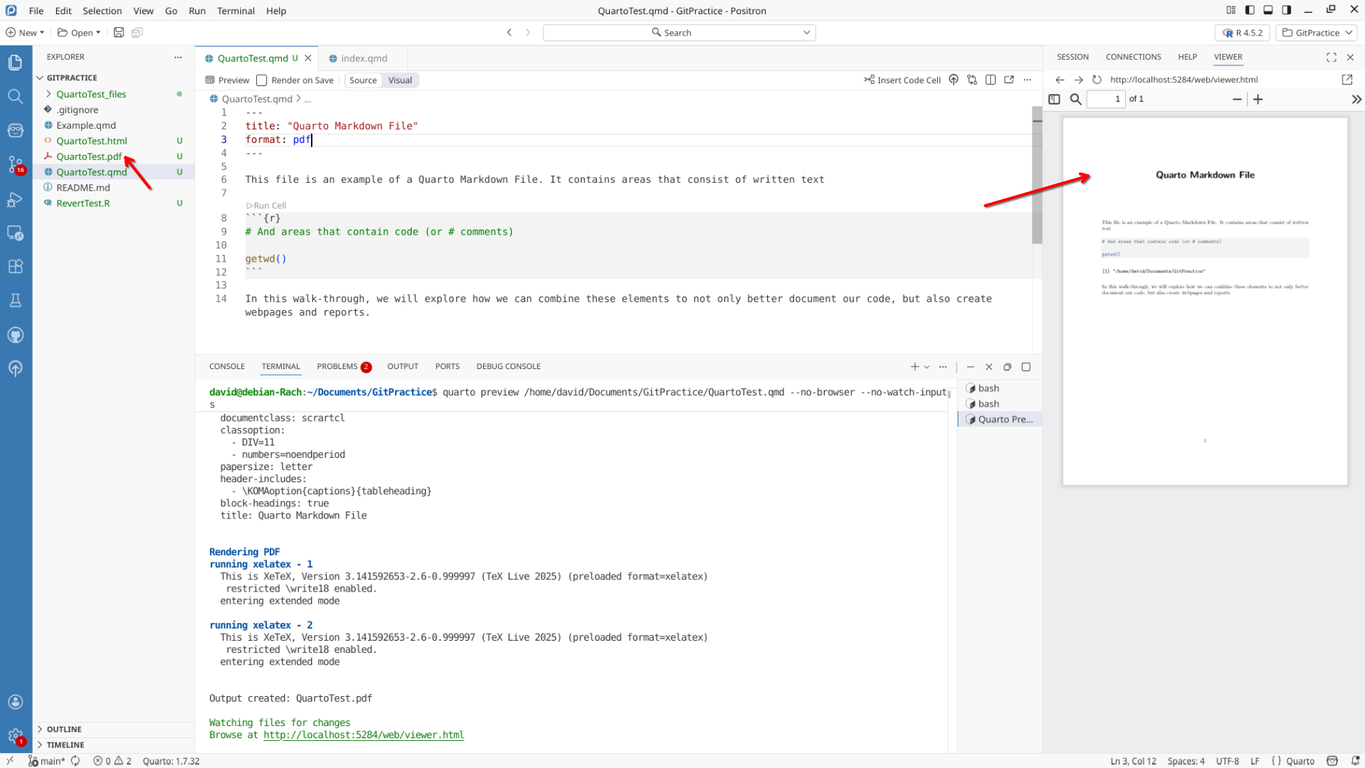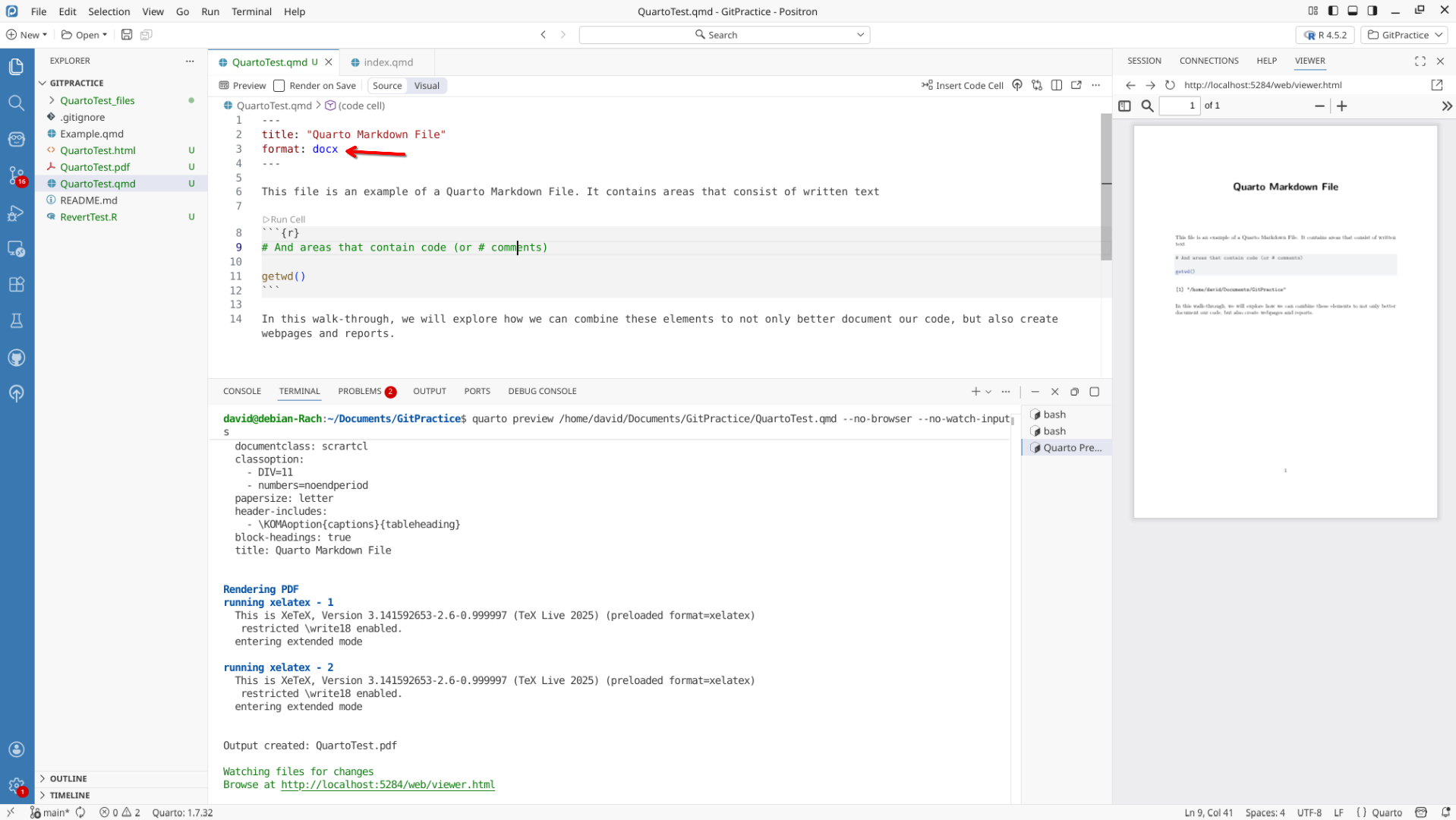 We will start off by creating a a new .QMD document within our GitPractice repository. As we saw in the previous section, the basic elements include: