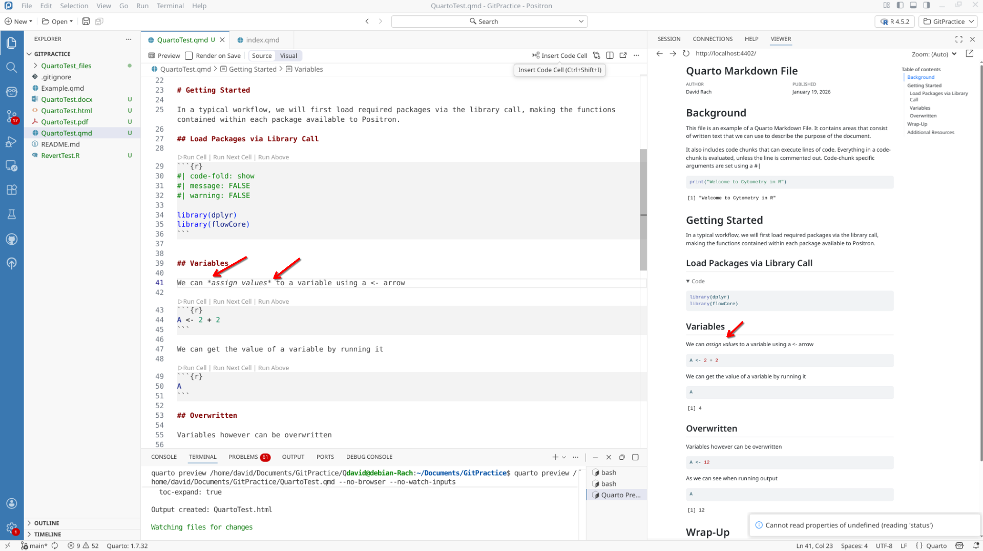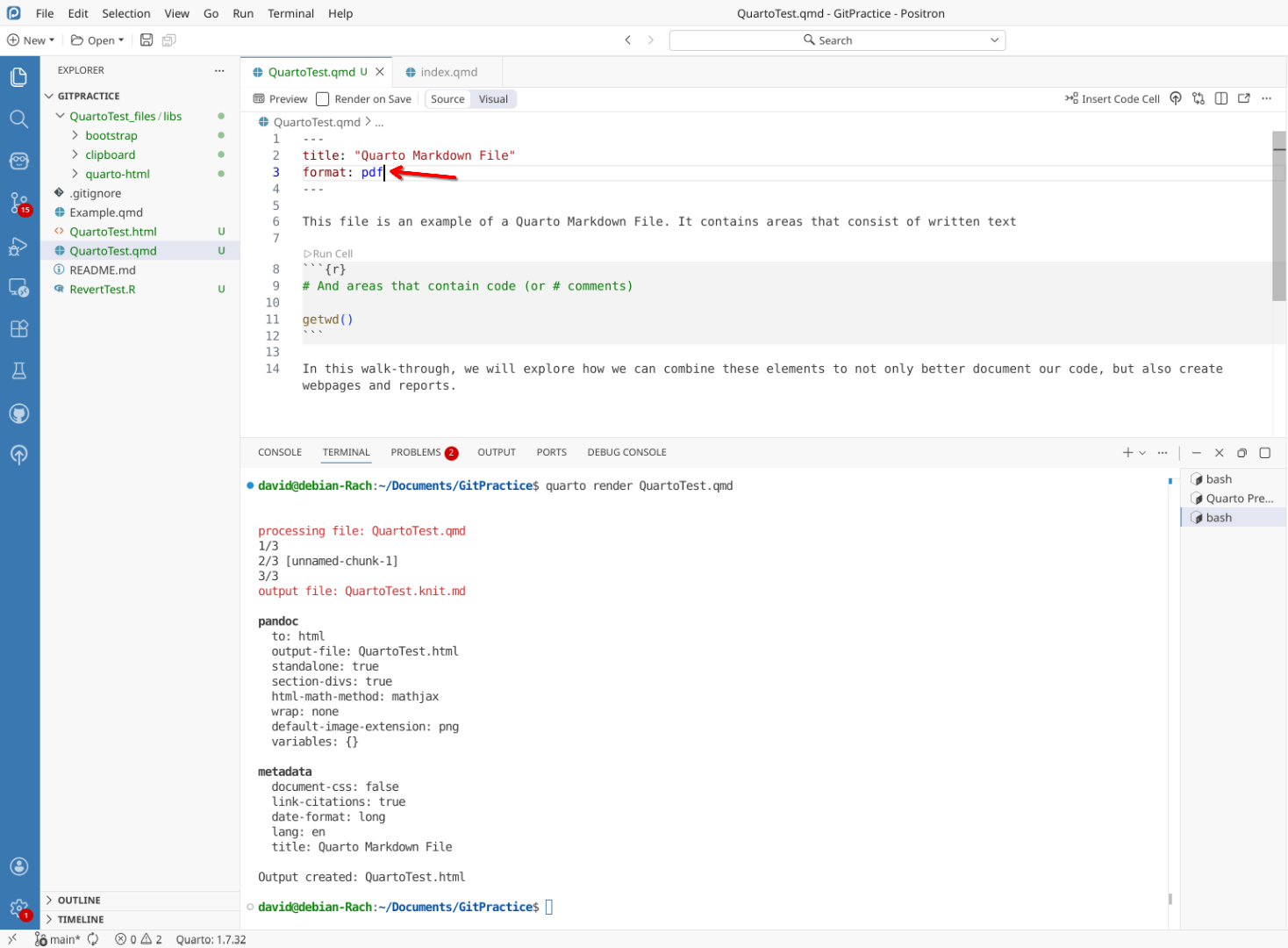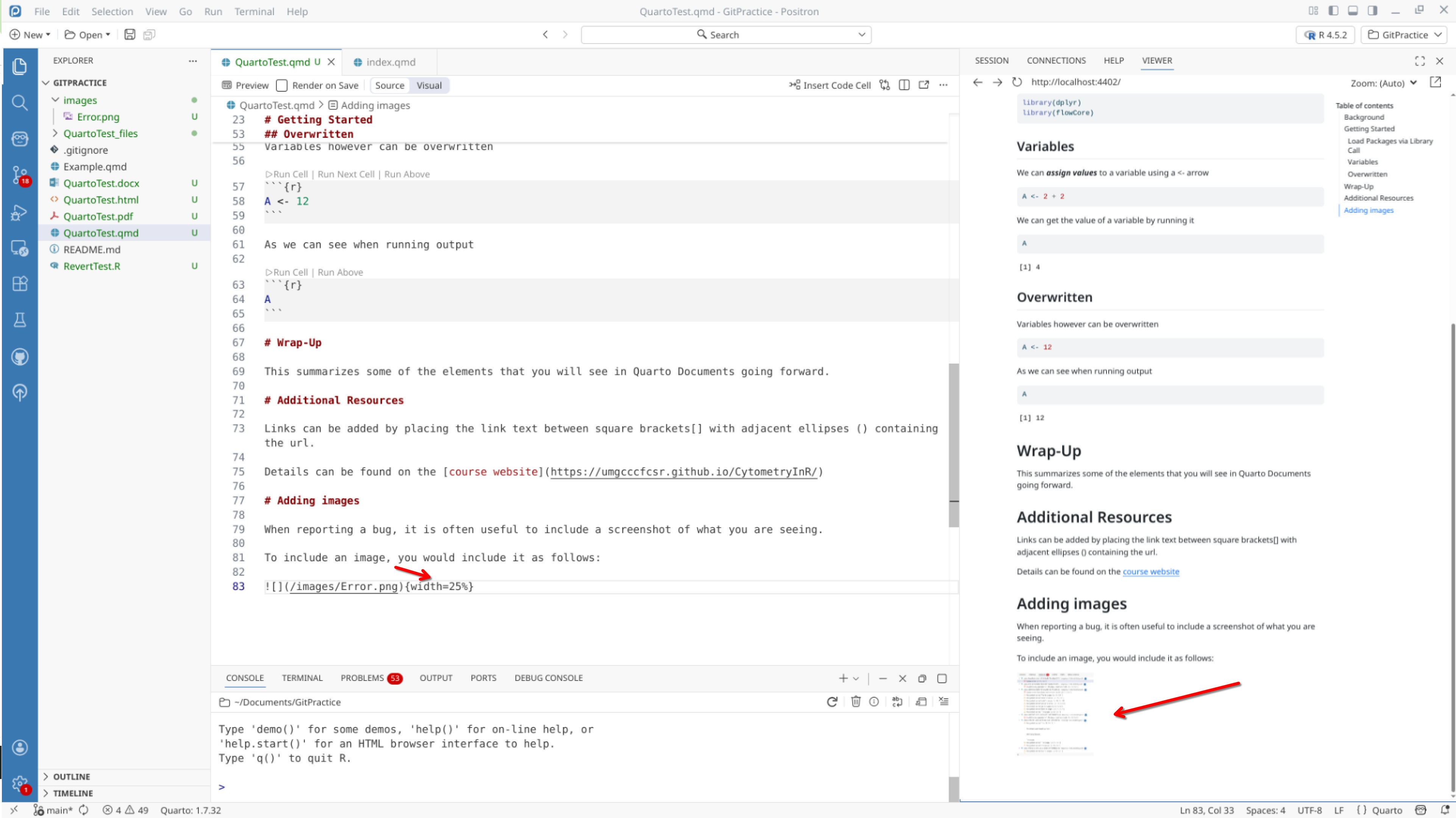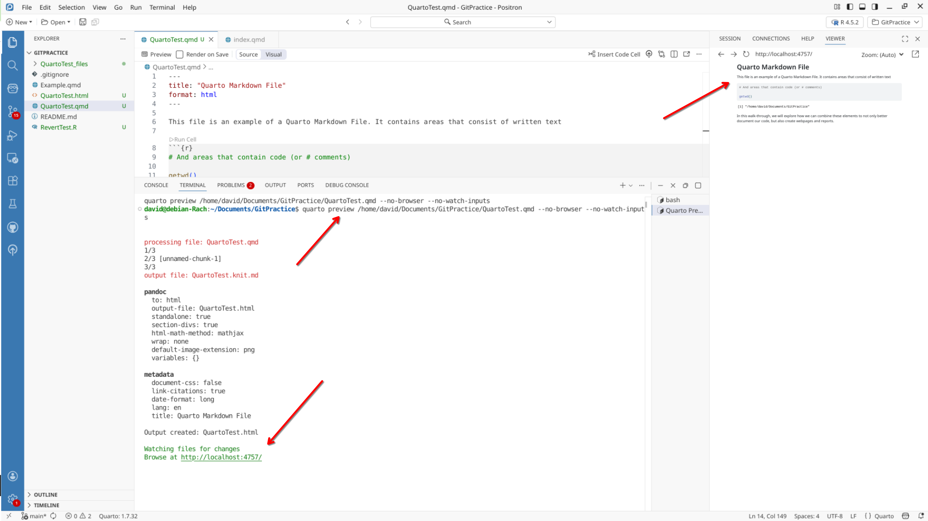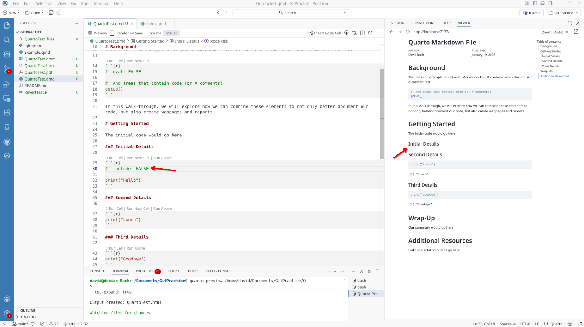 We will start off by creating a a new .QMD document within our GitPractice repository. As we saw in the previous section, the basic elements include:
