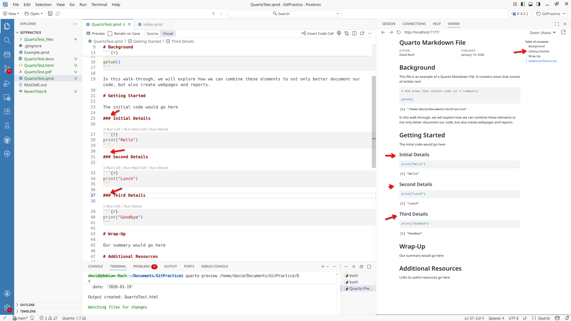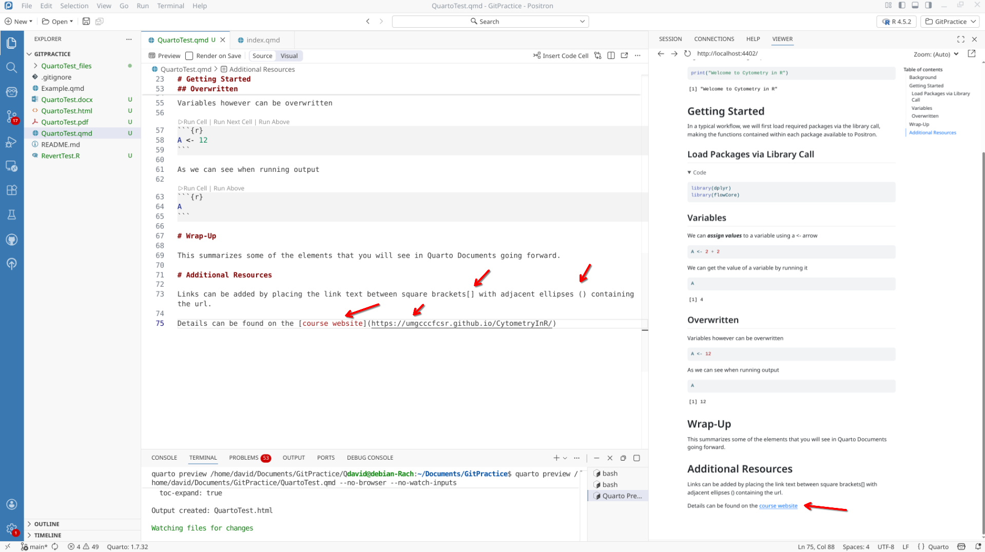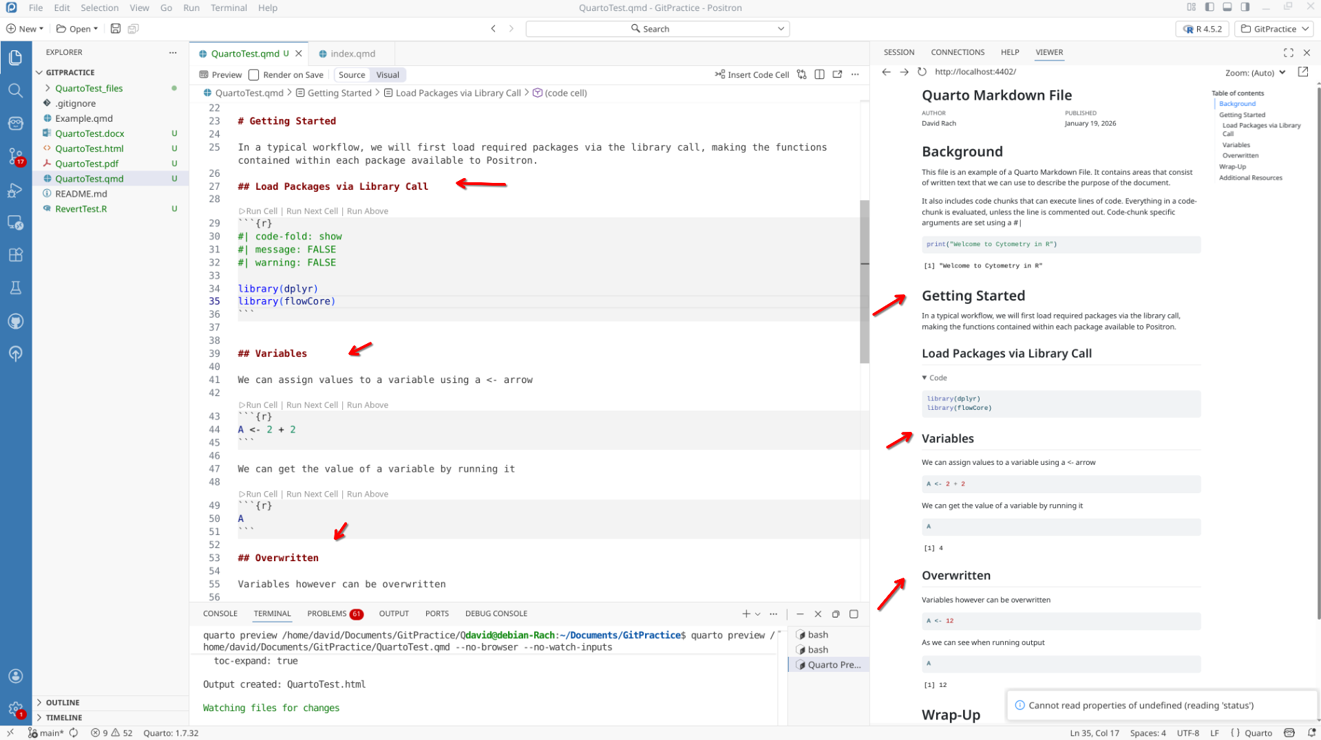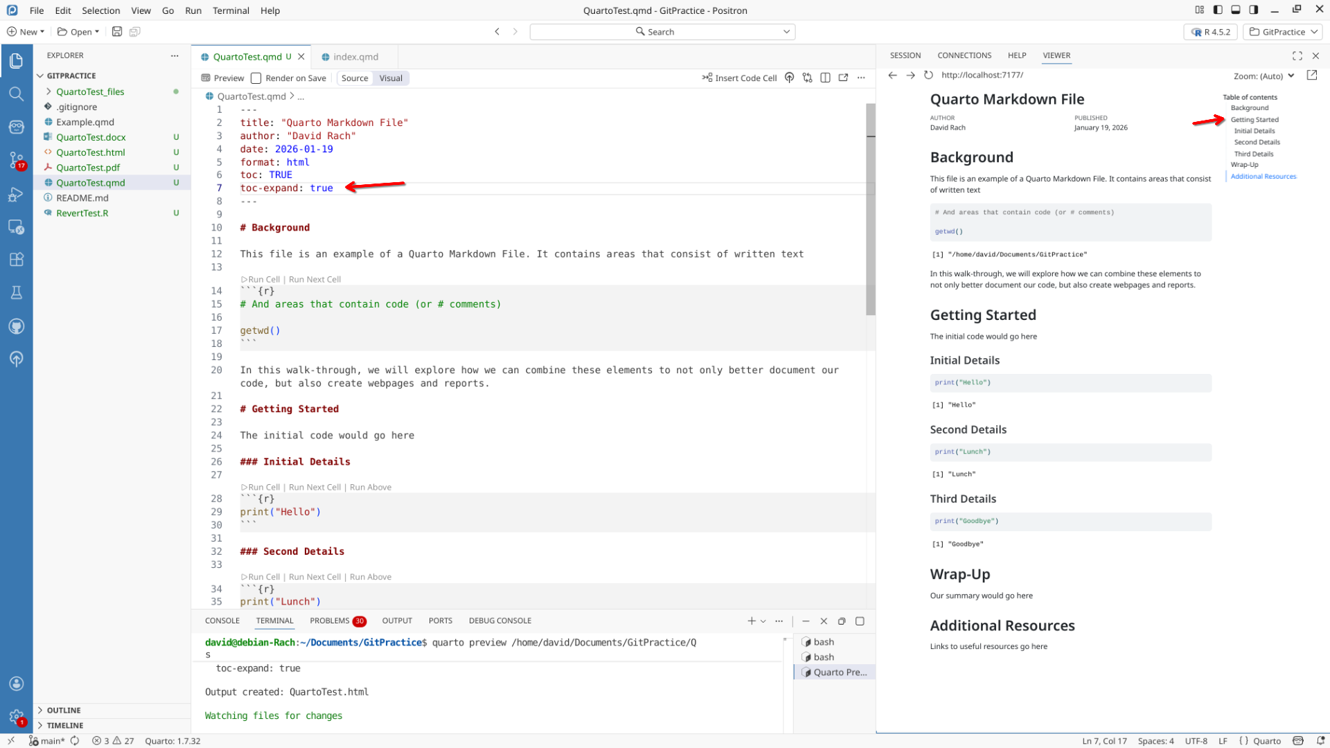 We will start off by creating a a new .QMD document within our GitPractice repository. As we saw in the previous section, the basic elements include: