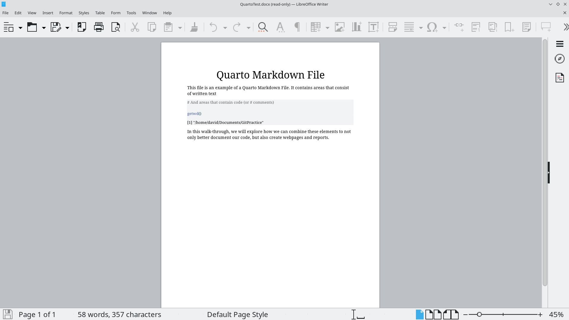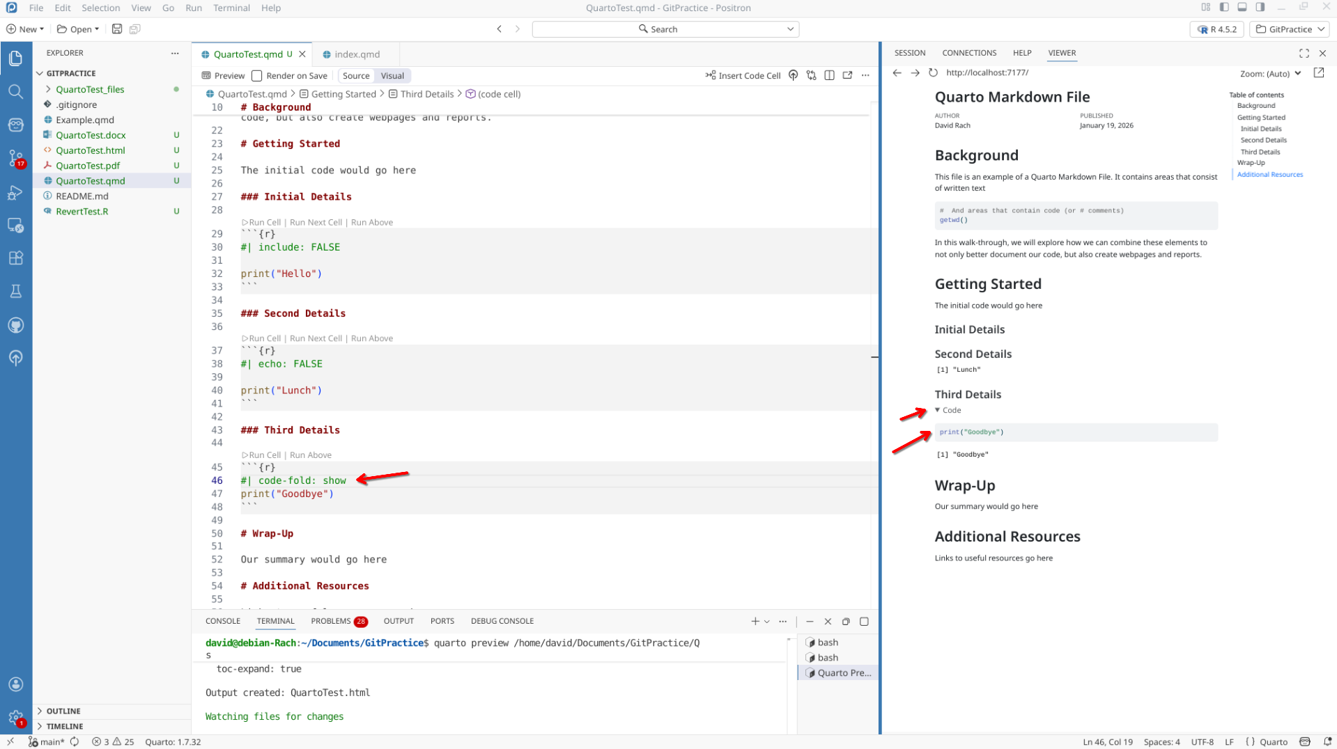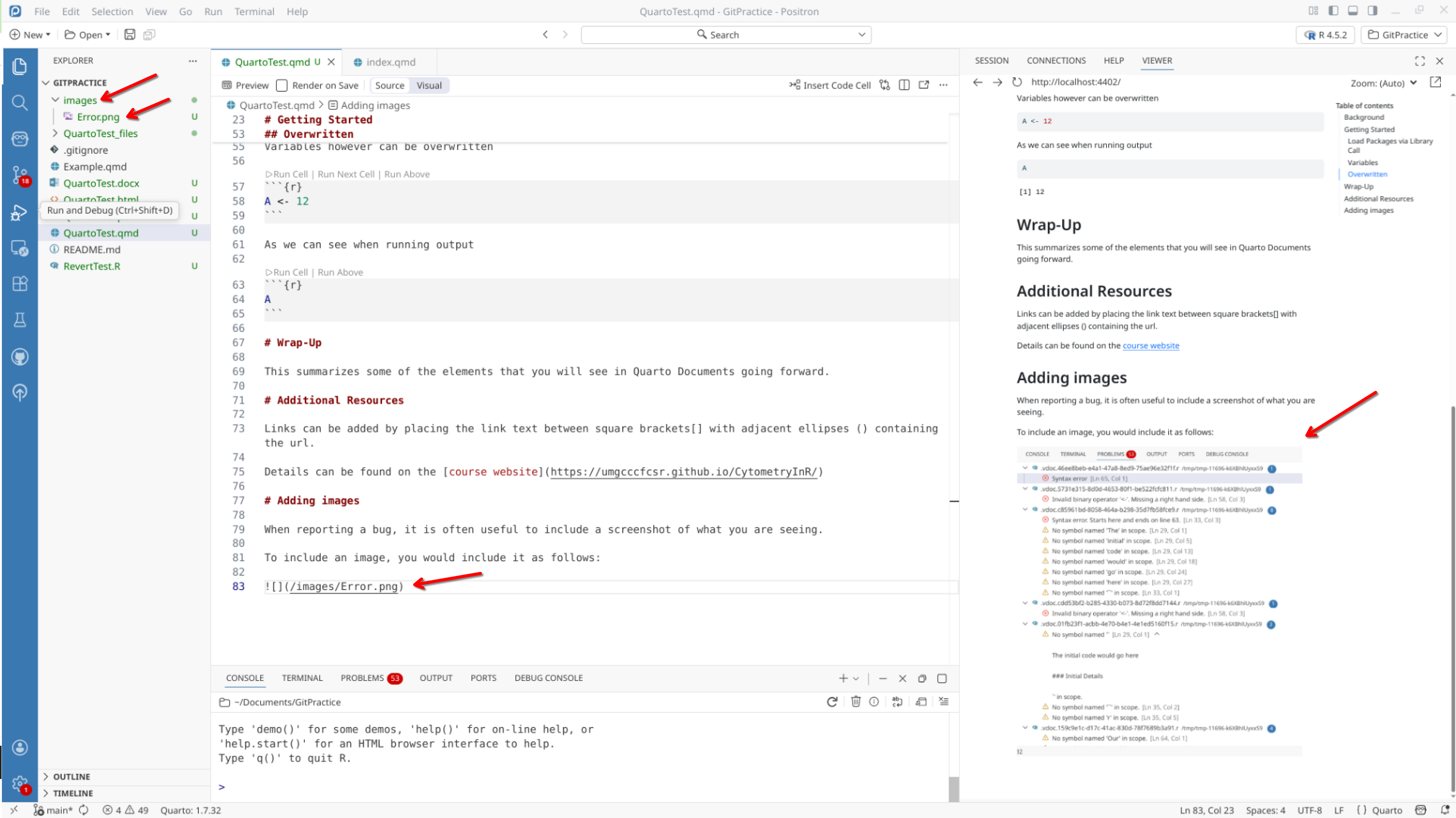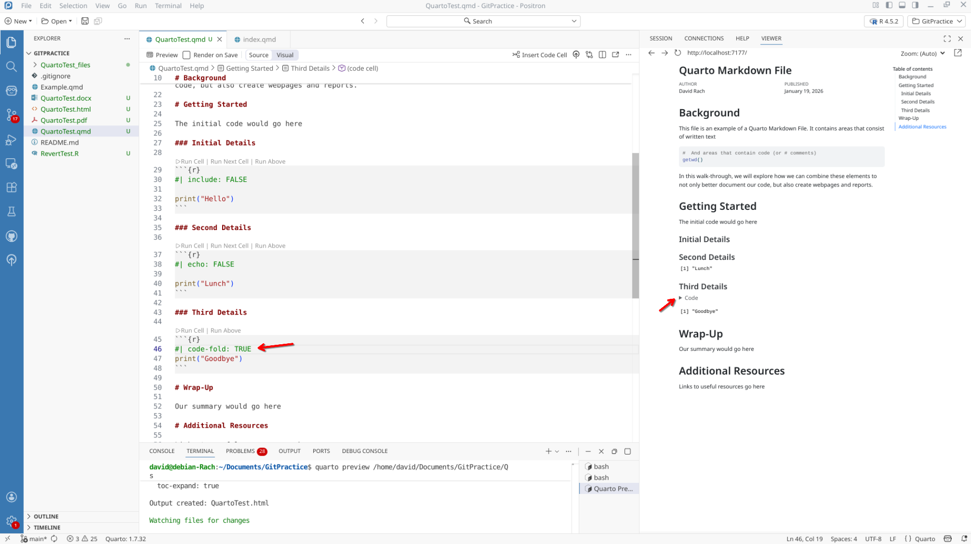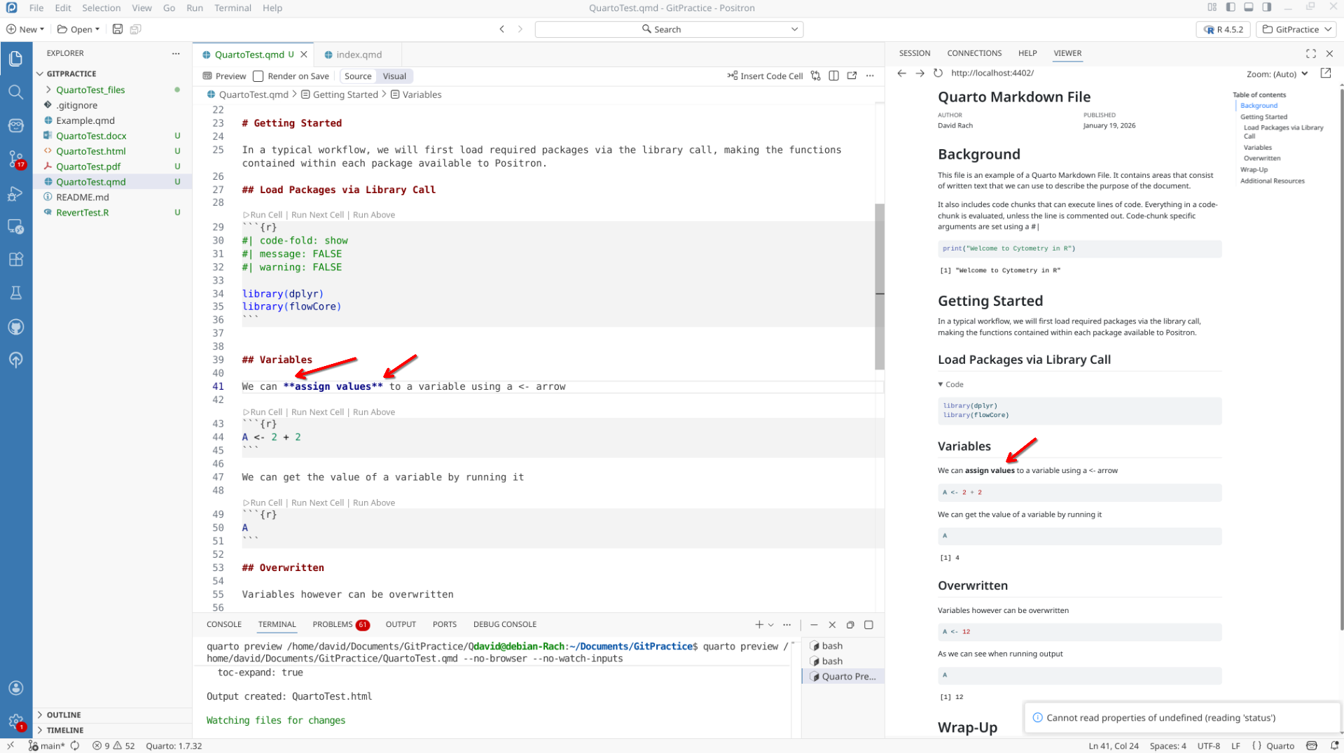We will start off by creating a a new .QMD document within our GitPractice repository. As we saw in the previous section, the basic elements include: