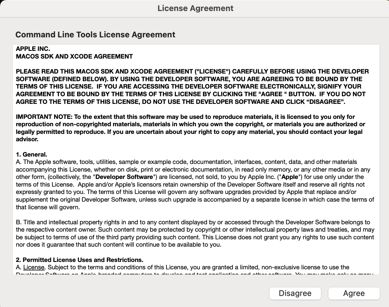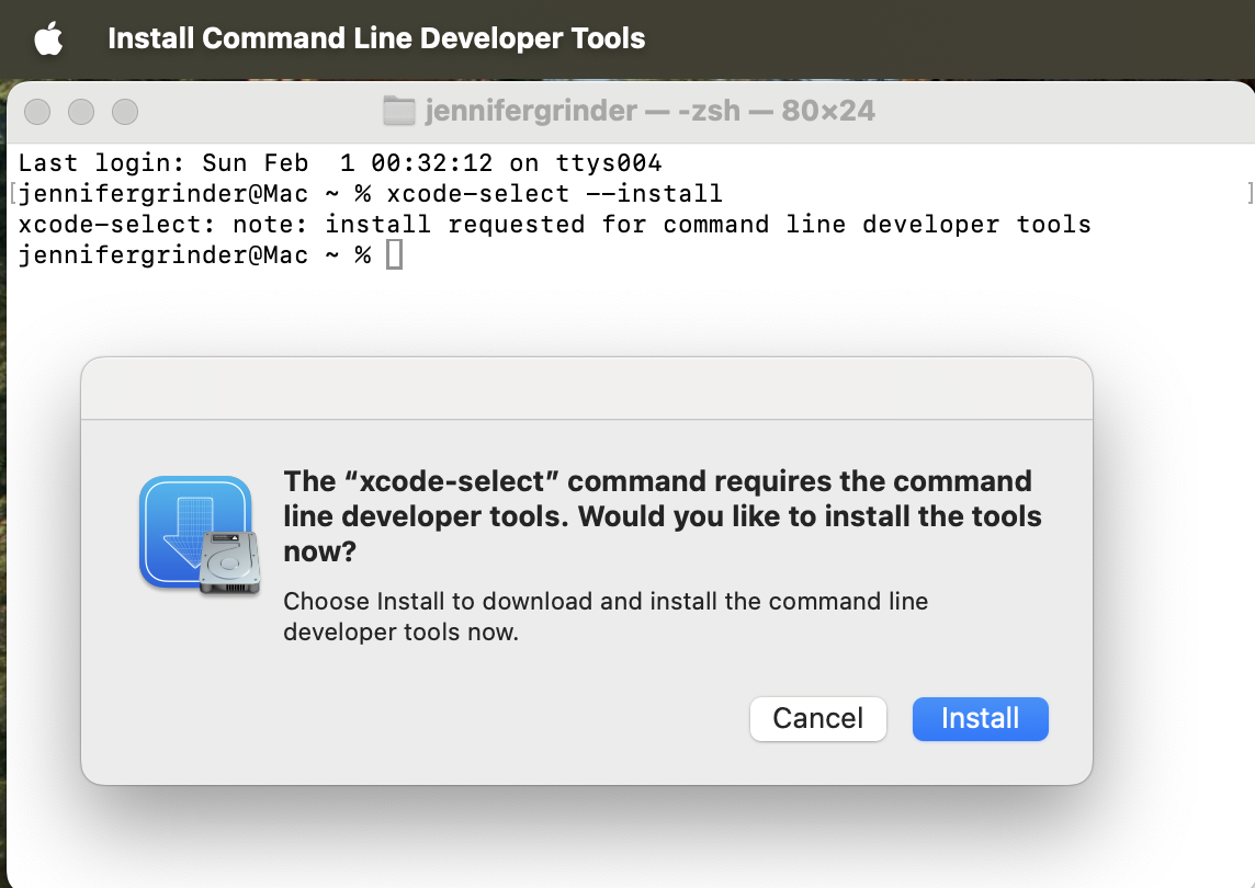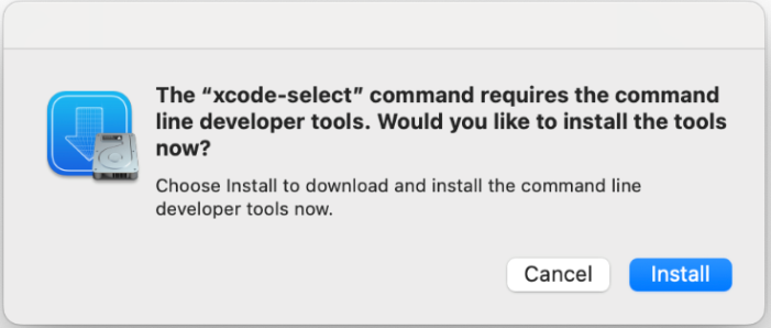 You will then have the pop-up asking whether you want to install the command line tools (which contain Git). Select Install.